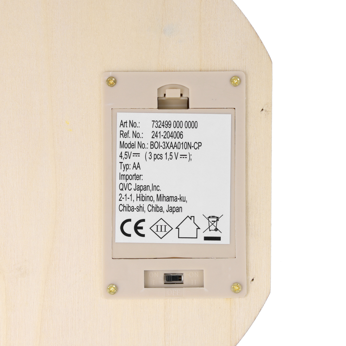 [商品内容] ・本体 ・単3形乾電池×3本(モニター用) [サイズ] 約 幅20.0×奥行3.5×高さ22.0cm [重量] 約 300g [材質] 木材、合成樹脂 [使用電池] 単3形乾電池×3本 [使用方法] 1.本体を裏返して背面の電池ケースを正面に向けます 2.電池ケースのフタを開けて、付属の単3形乾電池3本を電池ケースにセットします。その際、電池の電極を正しい位置に合わせてください ※付属の電池はモニター用です。そのため、通常より早く電池寿命に達する場合があります 3.電池ケースのフタを閉じます 4.LEDを点灯させるには、電池ケース脇のスイッチをONIまたはONIIに入れます ・スイッチをONIに入れると、LEDライトが点灯します ・スイッチをONIIに入れると、LEDライトが点灯し、自動タイマー機能が作動します 5.LEDを消灯するには、スイッチをOFFに戻します <自動タイマー機能> スイッチを入れてから5時間点灯し自動的に消灯します。消灯後19時間後に再び点灯します。再点灯から5時間後に消灯。19時間後に再び点灯。この動作を繰り返します ■取り扱い説明を充分にご確認の上、ご使用下さい 【中国製】 [注意事項] ※本品は玩具ではなく装飾を目的にしたものです。乳幼児の手の届かないところに置いてください ※本品に火を近付けないでください。また、高温の熱源から離れた場所に置いてください ※本品は室内用です。屋外では使用しないでください ※改造、分解は行わないでください。故障の原因となります ※水平で安定した場所に置いてください。テーブルの端等、落下しやすい場所は避けてください ※床に置く装飾はお控えください。本品を踏みつけて怪我をする恐れがあります ※壁にぶつける、固い物で叩く、高い所から落とす等、本品に強い衝撃を与えないでください。本品が破損する恐れがあります ※本体表面にヒビ、欠け、割れ等がある場合は、使用を中止してください。使用を継続すると破損した本体で怪我をする恐れがあります ※テーブルや家具等の上で本品を引きずるような取扱いは避けてください。テーブルや家具の表面を傷つける恐れがあります ※一度使用した電池(使用済み電池)と新品の電池を併用しないでください ※種類の異なる電池(マンガン電池とアルカリ電池、ニッケル水素充電池とニッカド充電池など)を併用しないでください ※破棄する際は、各自治体の指示に従い分別してください ※汚れた場合は乾いた布でやさしく拭き取ってください ※ベンジンやシンナーなどの溶剤や研磨剤を含む洗剤は使用しないでください ※本品を長期間使用しない場合は、電池を外してください ※直射日光を避け、涼しい場所で保管してください