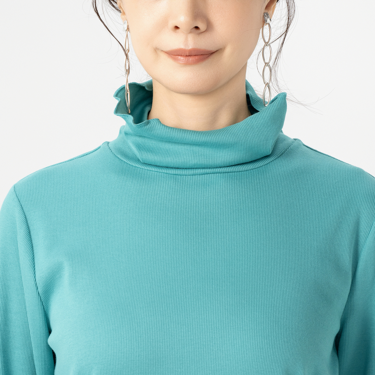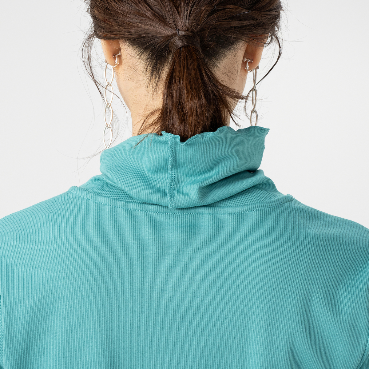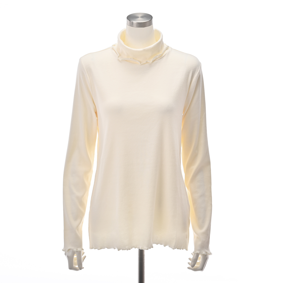 セミフィットシルエットのタートルネックプルオーバー。襟端、裾、袖口にメローロックを施してラッフル感を持たせた、フェミニンなデザインです。一枚で着たり、羽織のインに合わせたり、色違いで複数枚お持ちになってもシーズン通して活躍しそうです
