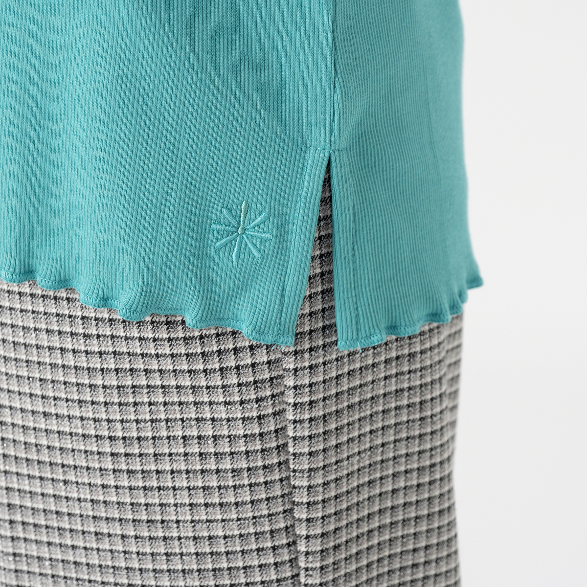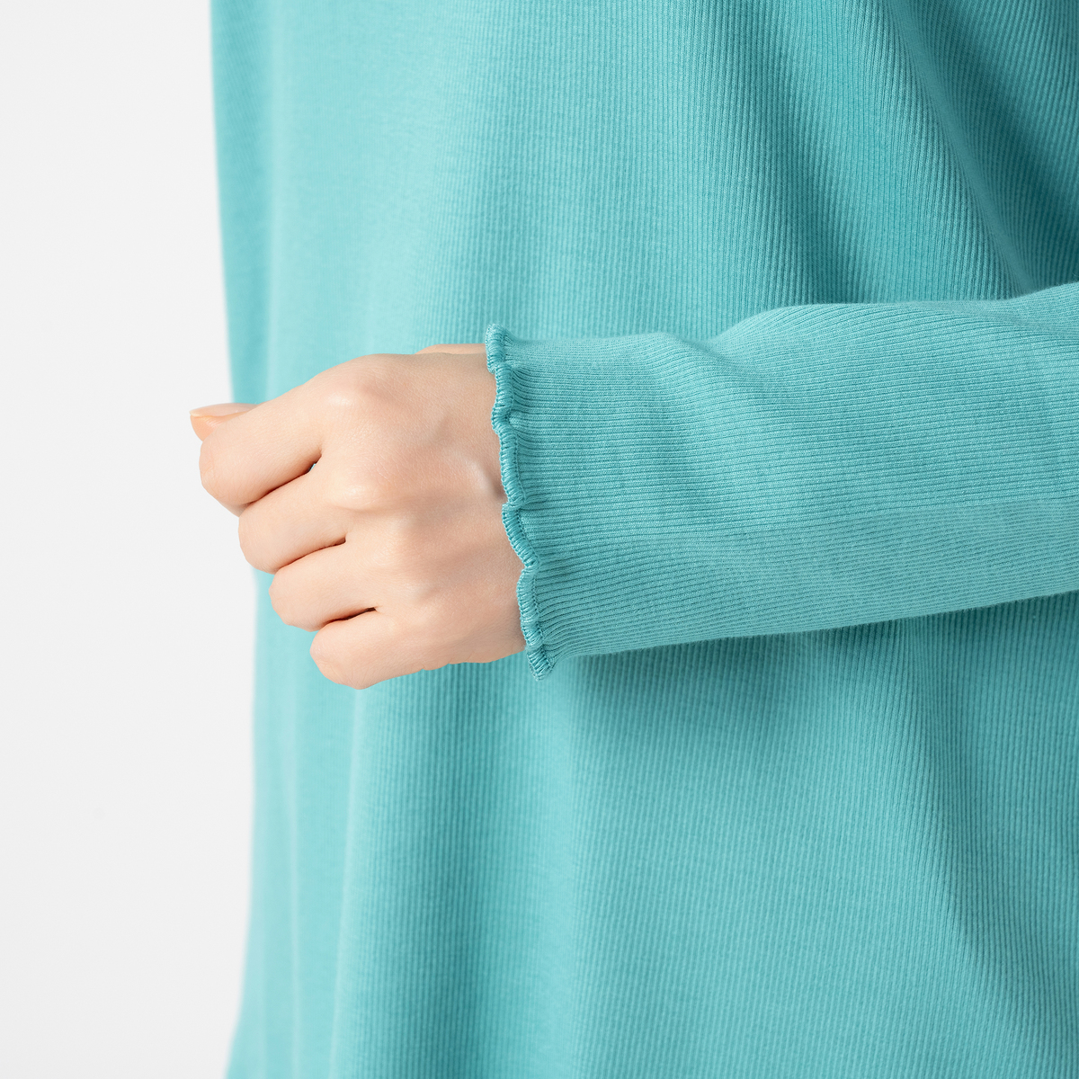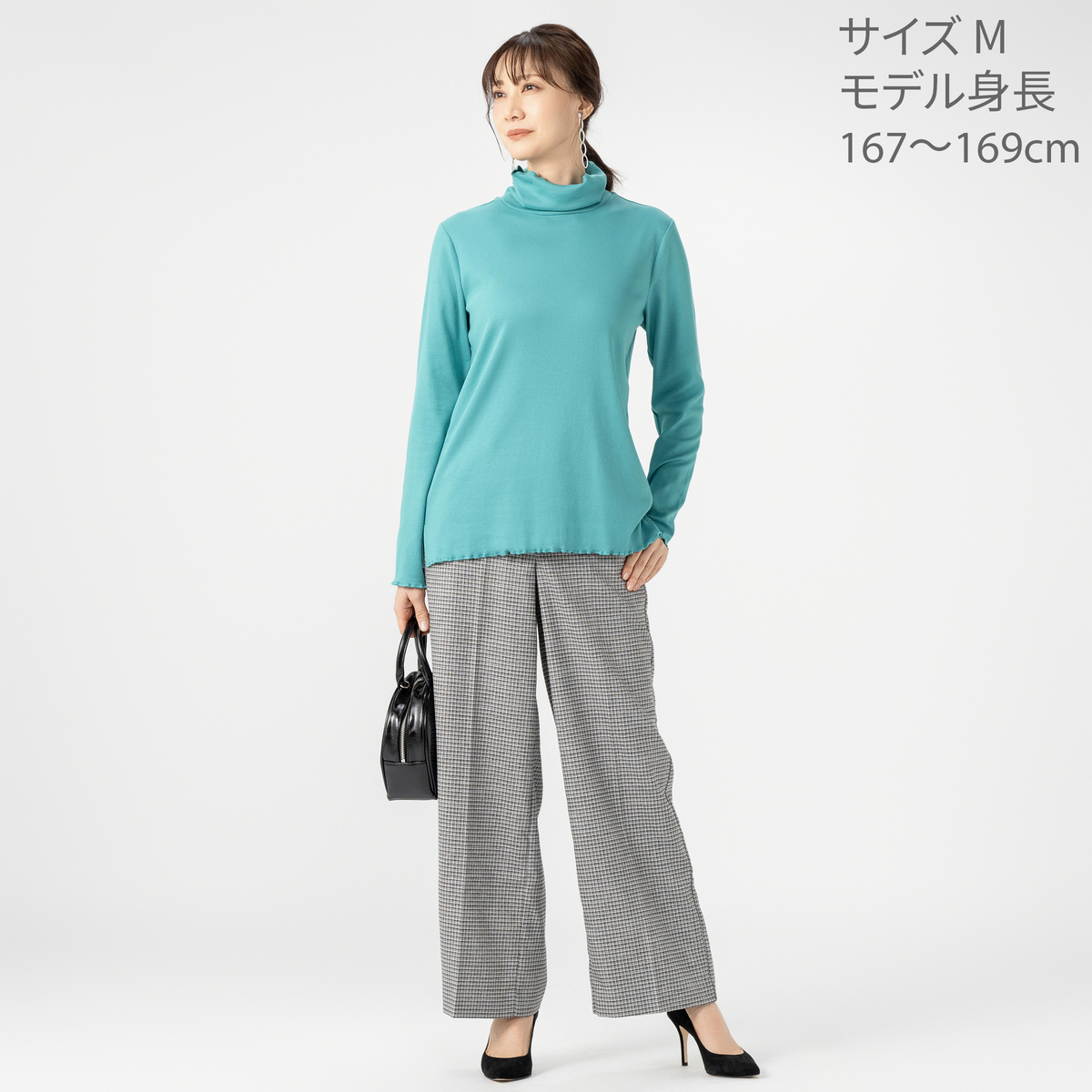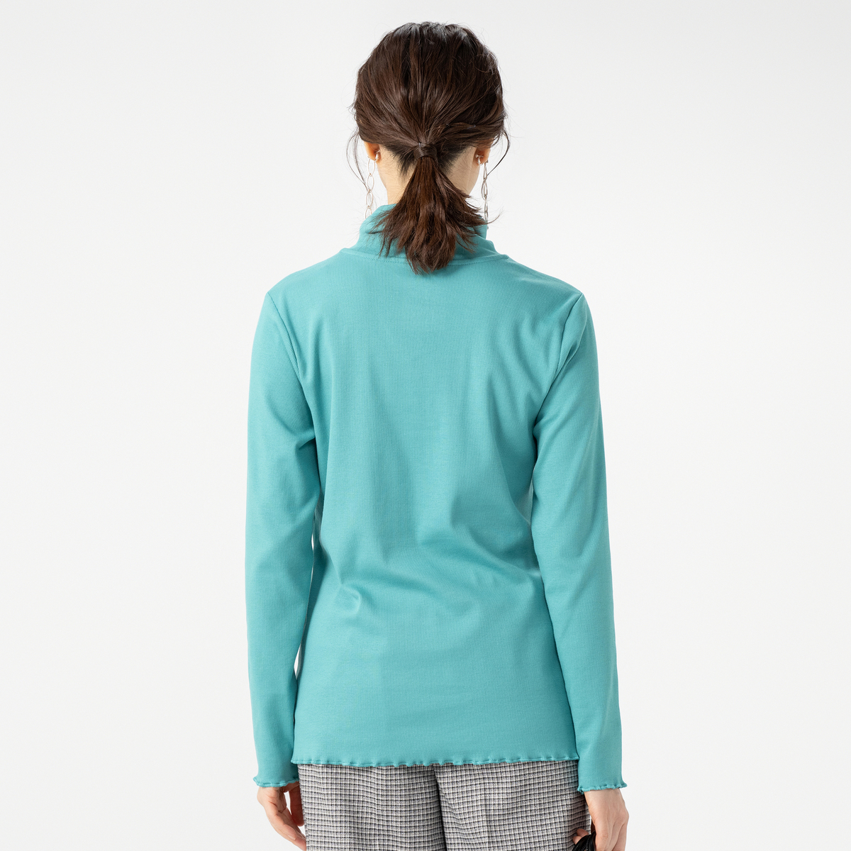 セミフィットシルエットのタートルネックプルオーバー。襟端、裾、袖口にメローロックを施してラッフル感を持たせた、フェミニンなデザインです。一枚で着たり、羽織のインに合わせたり、色違いで複数枚お持ちになってもシーズン通して活躍しそうです