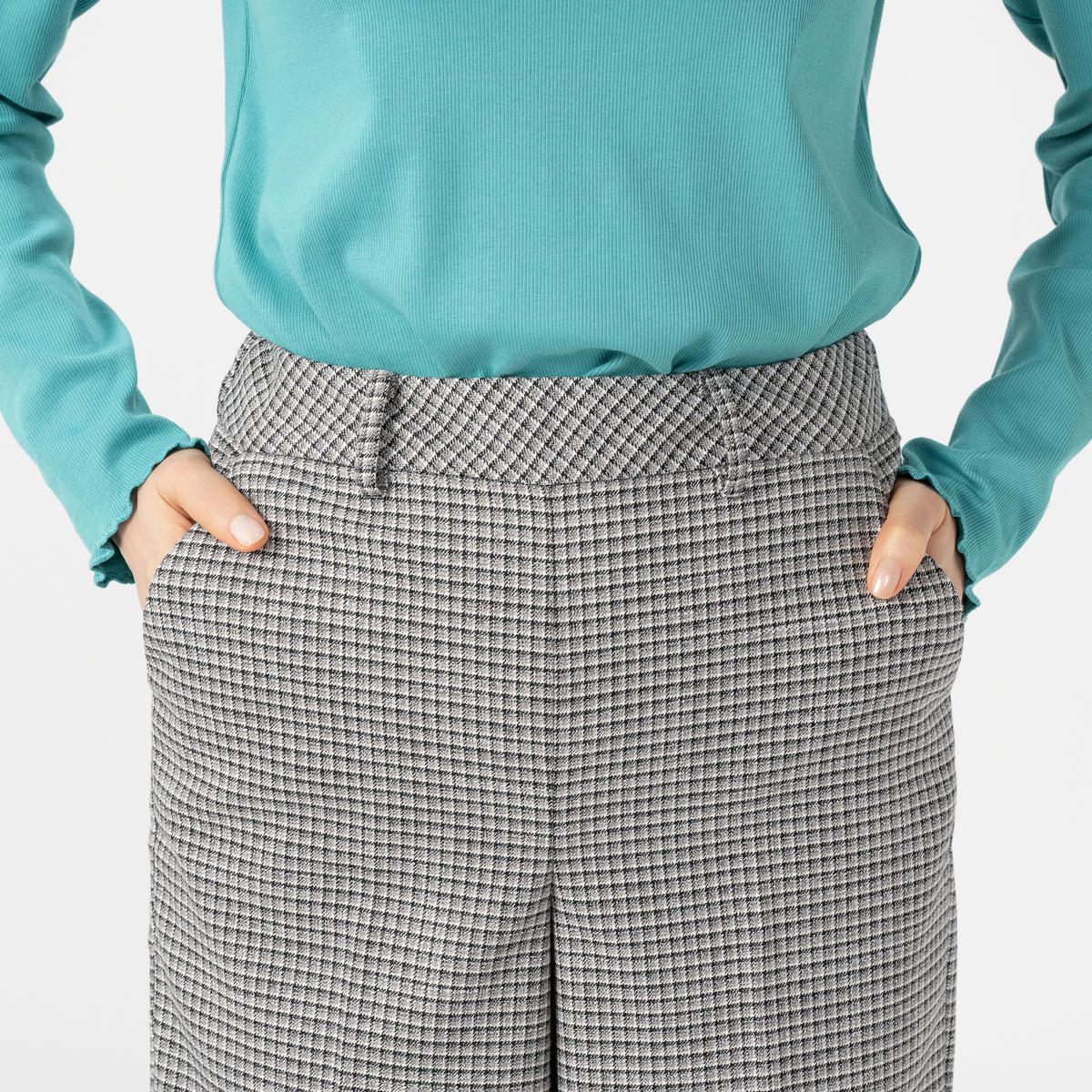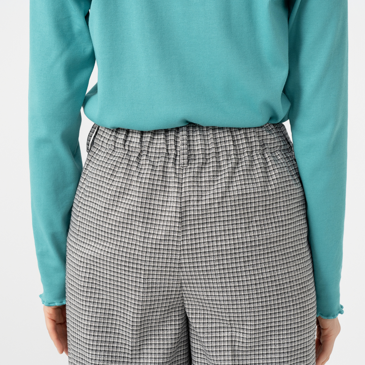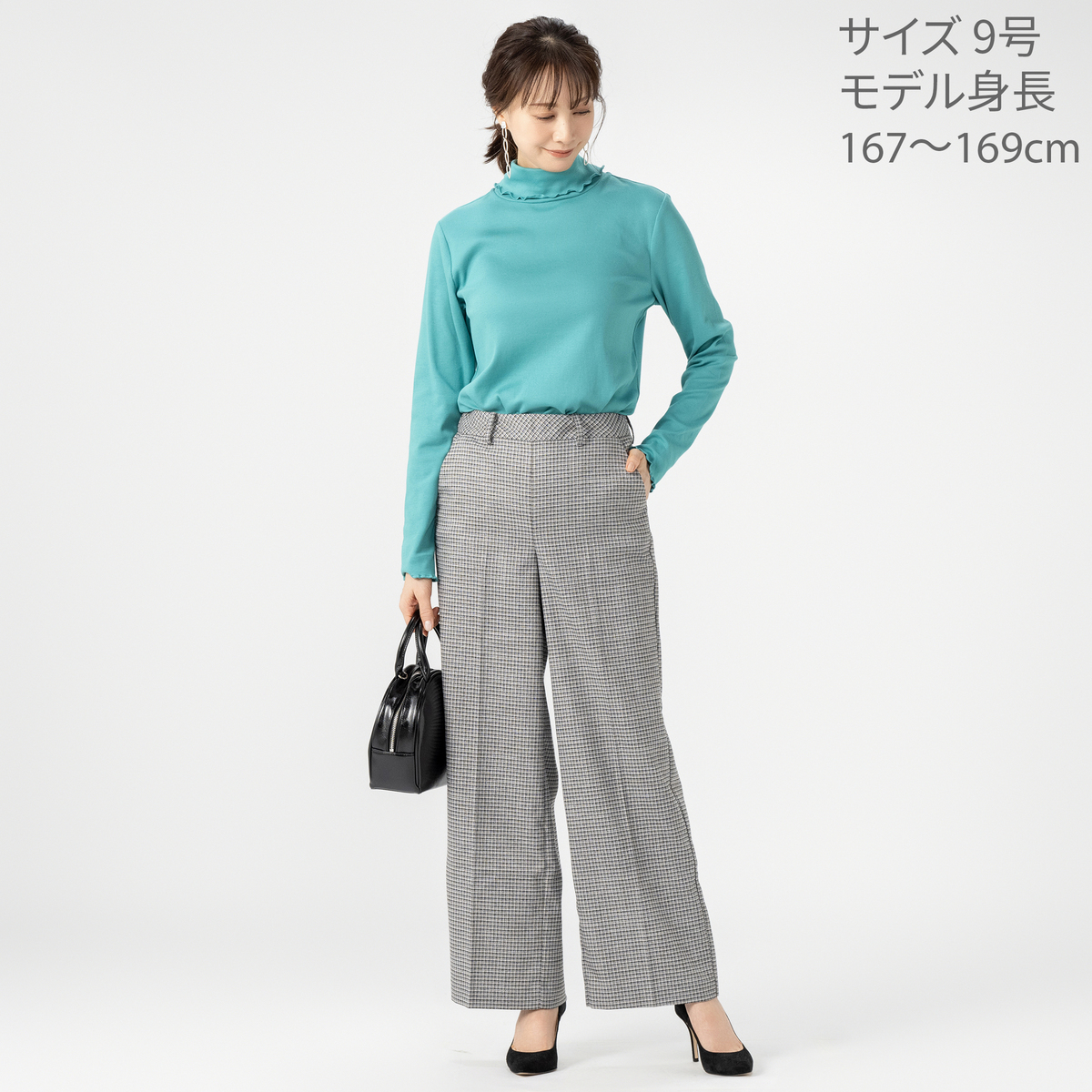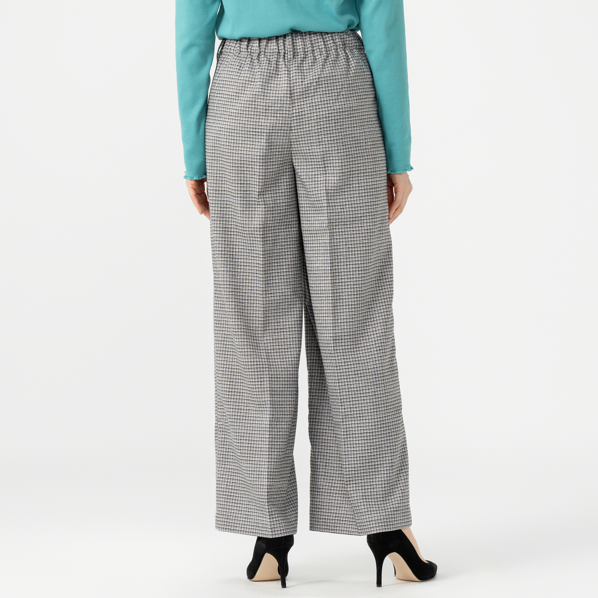 ミニチェック柄が広がるワイドパンツ。オンでもオフでもコーデしやすい上品なチェック柄です。ウエストは後ろ全体がゴム仕様のプルオンタイプで、キレイ見えしながら穿き心地はラクチン。前左右には便利なポケットを付けています