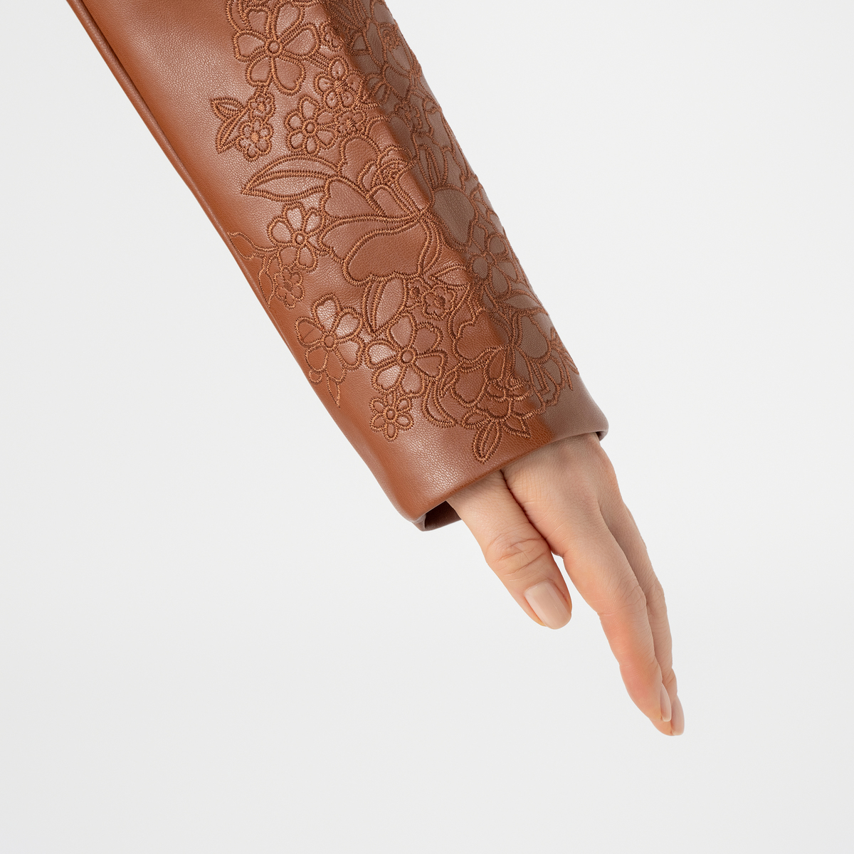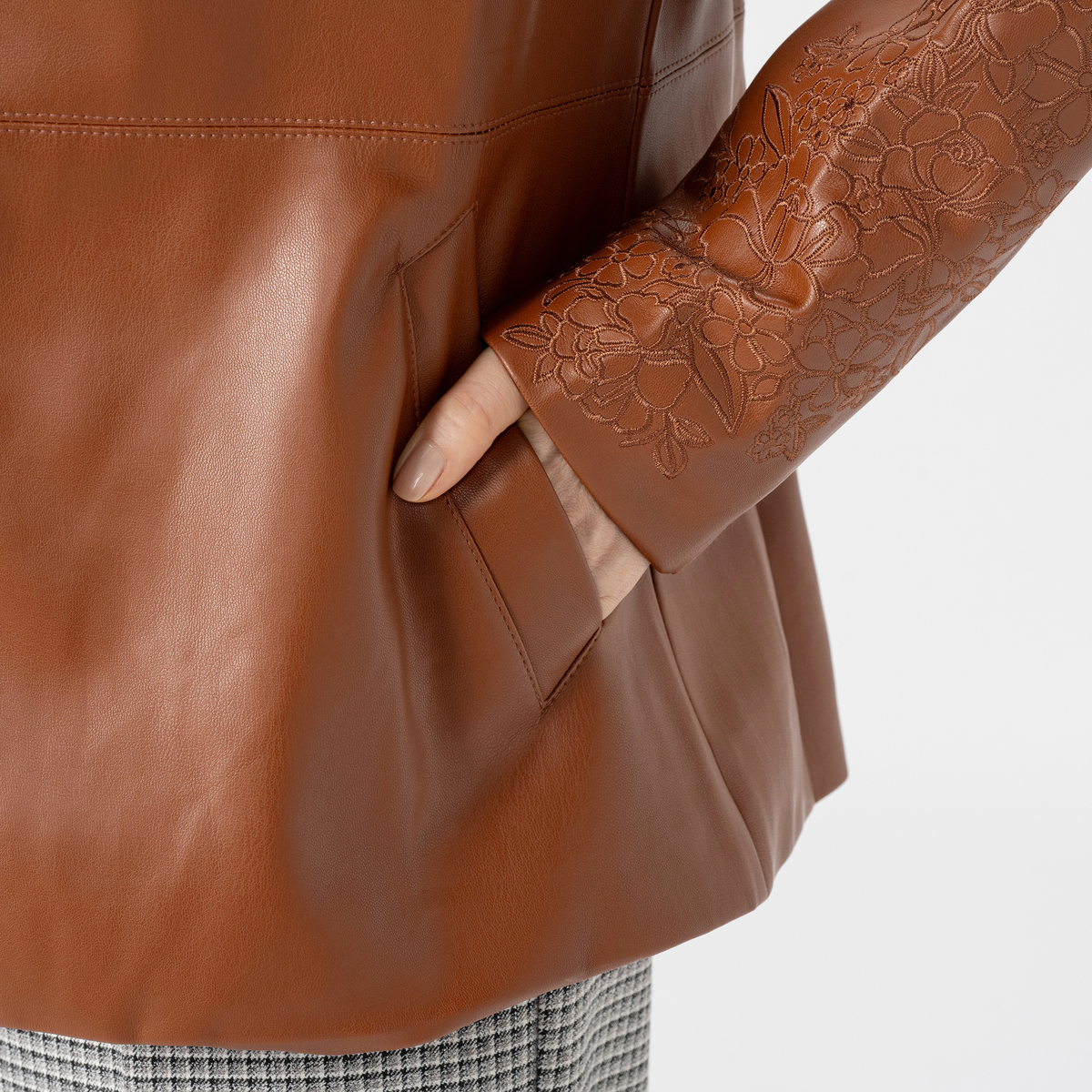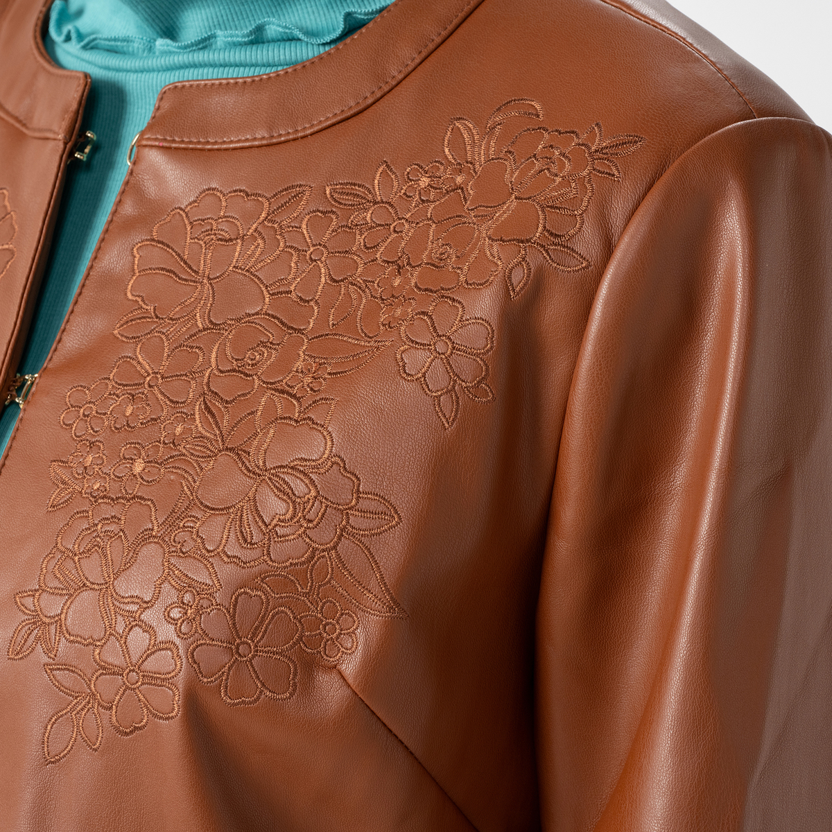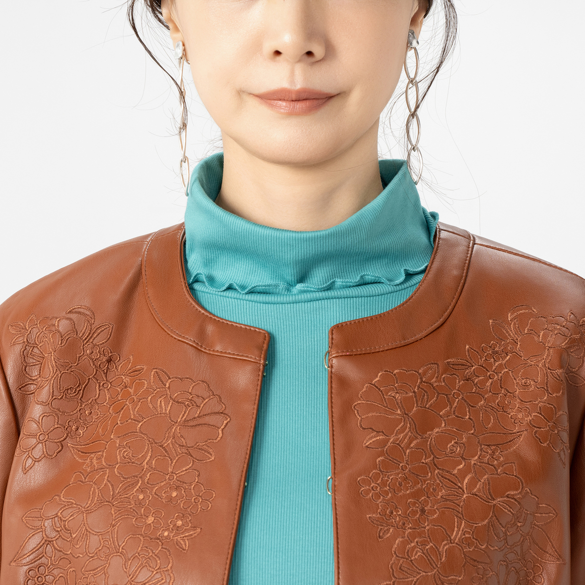 総裏仕立てのフェイクレザージャケット。前身頃と袖に同色の刺繍をあしらった、大人のデザインです。フロントはホック開きで、肩パット付きのきちんと感ある仕上がり。後ろ中心裾はベンツ開きにして、前左右にはポケットを付けています