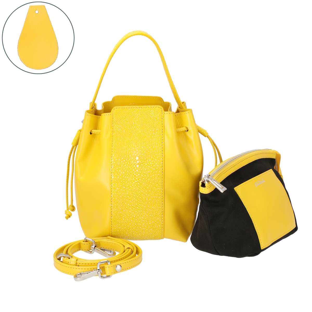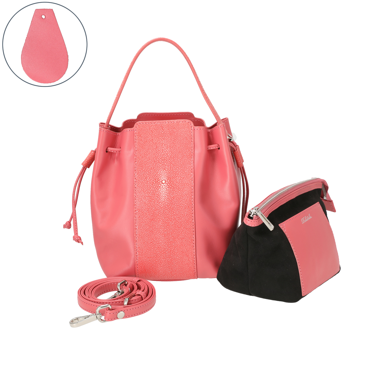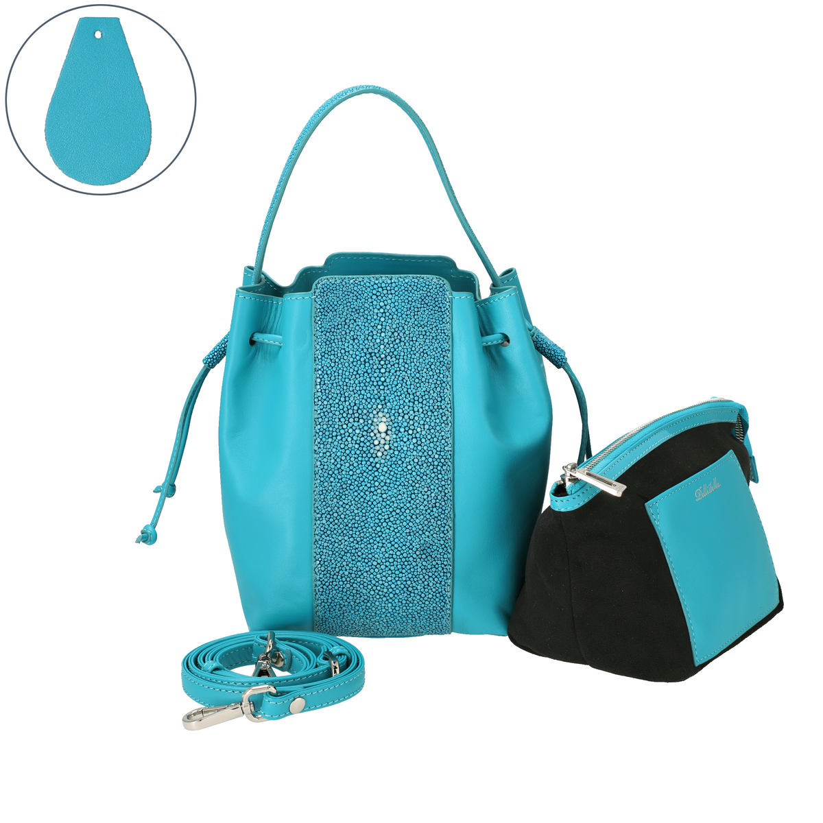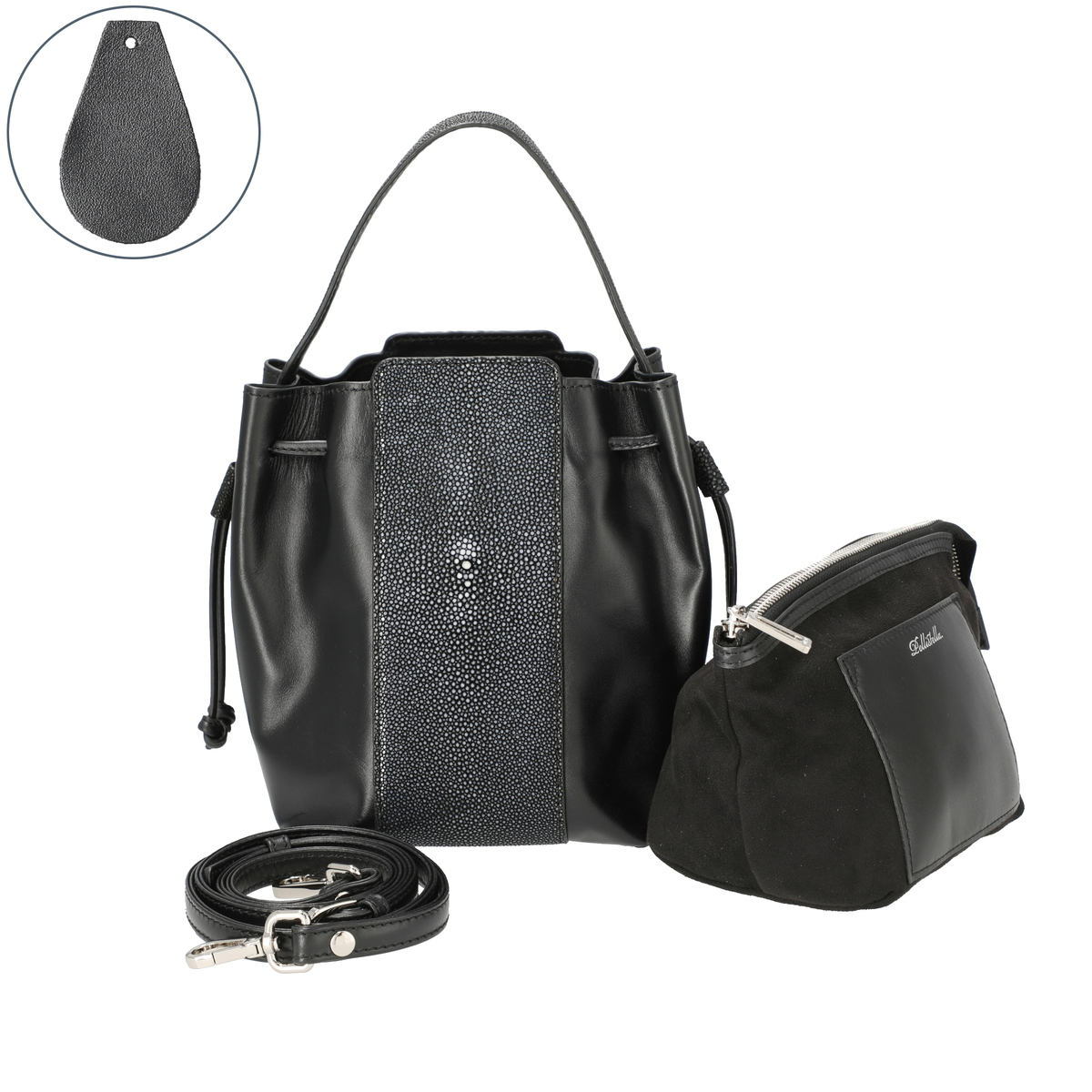 エイ革と牛革をパーツによって使い分けた、コンビネーションデザイン。柔らかな生地を使ったポシェット付きです。エイ革の中でも一番希少価値のあるスターマーク部分を両面に使用した贅沢なつくりです