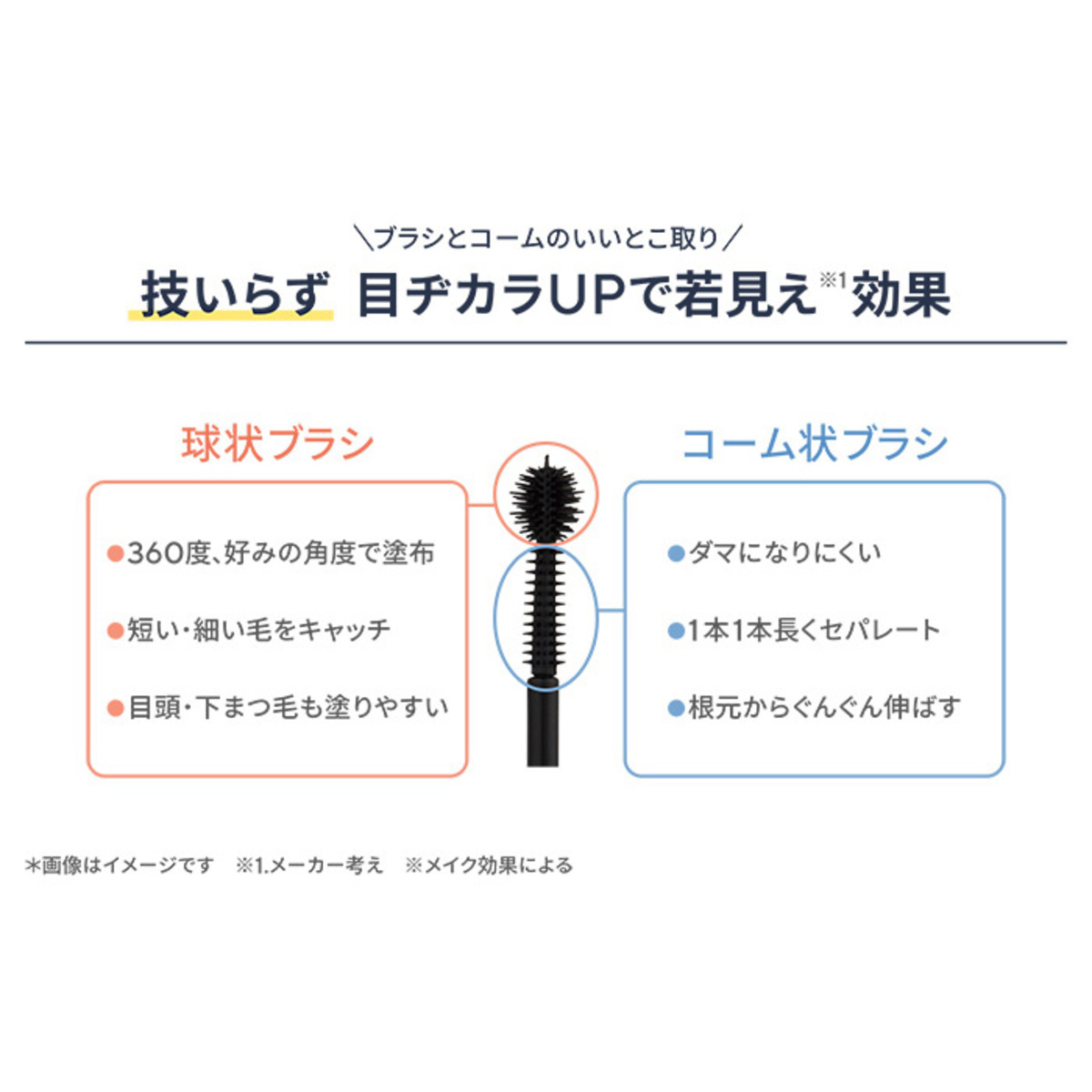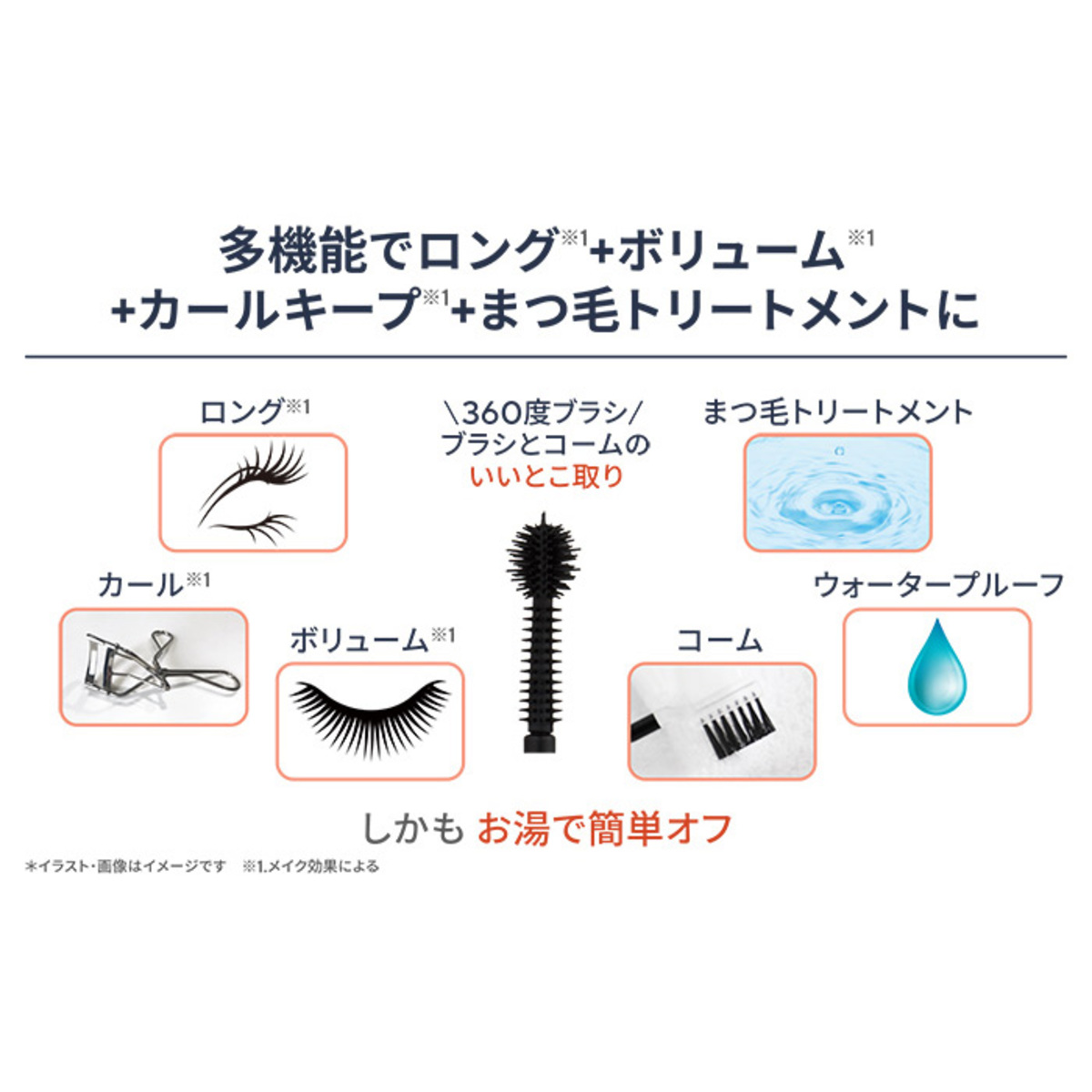 1つで簡単、キレイを演出する多機能なマスカラです。ロングマスカラ、カールマスカラ、まつ毛トリートメント。ボリュームマスカラ、コーム、下地の役割もあります。アイラッシュカーラーを使わなくてもまつ毛をカール。オフはお湯でできるのも魅力です