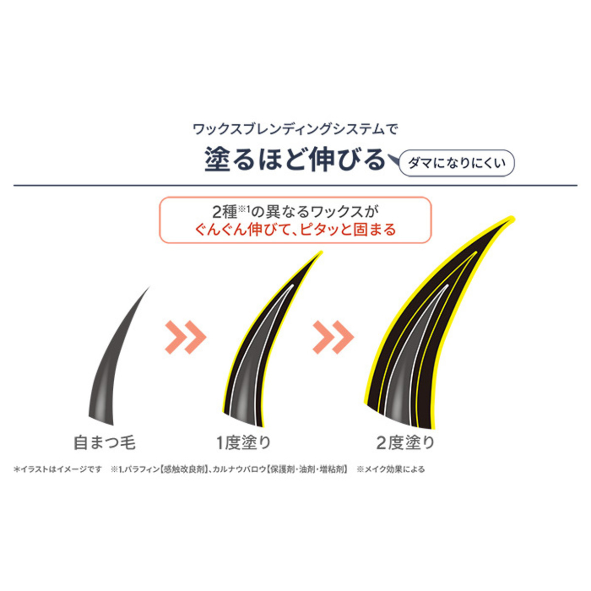 融点(液体が固まり固体となるタイミング)が異なるワックスを2種類配合(パラフィン*2とカルナウバロウ*5)。この2種類をブレンドすることで、塗り重ねるほどキレイなロングを実現します(*6)