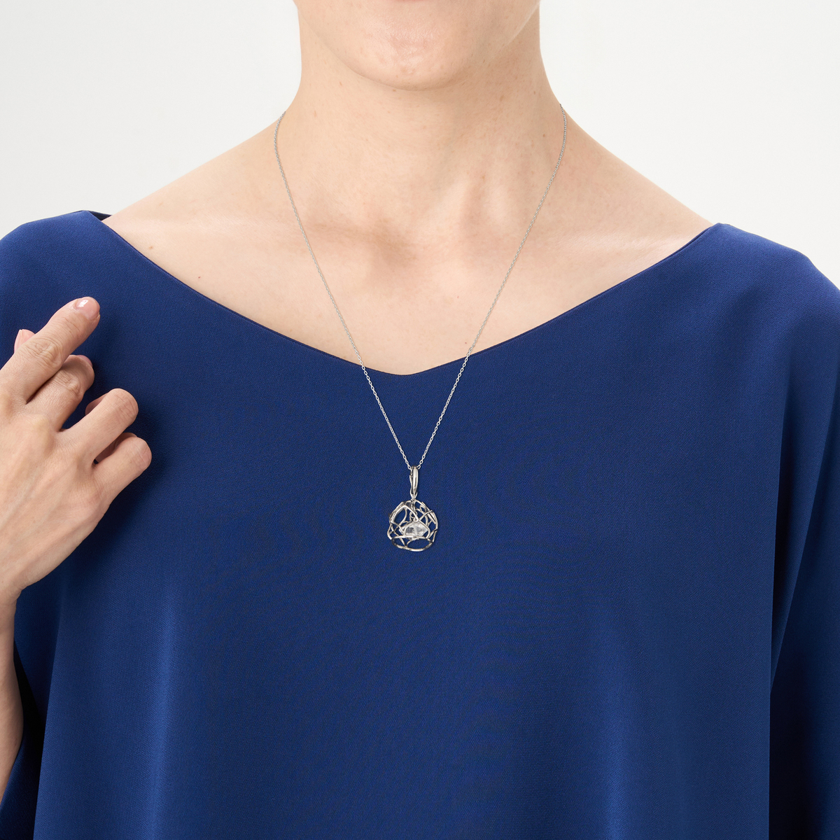 ご紹介するのは、ハーキマーダイヤモンド(水晶)の原石そのままの形状をお楽しみ頂けるペンダント。フレームの中で石が揺れ動くデザインで、小さな置物としてもお楽しみ頂けます。世界に2つと同じものが無い個性が魅力のジュエリーをお楽しみください