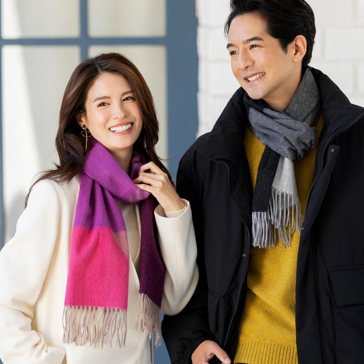 繊度が細く柔軟で軽さがあり、保温性・吸湿性に富んだソフトな風合いが特徴の、カシミヤ100%のマフラー。ジャカード織機で織ることで、斜めラインなどを組合せた表現豊かなブロック柄デザインに仕上げました。中厚手で使いやすく、裏面はニュアンスの異なるリバーシブル仕様になっています