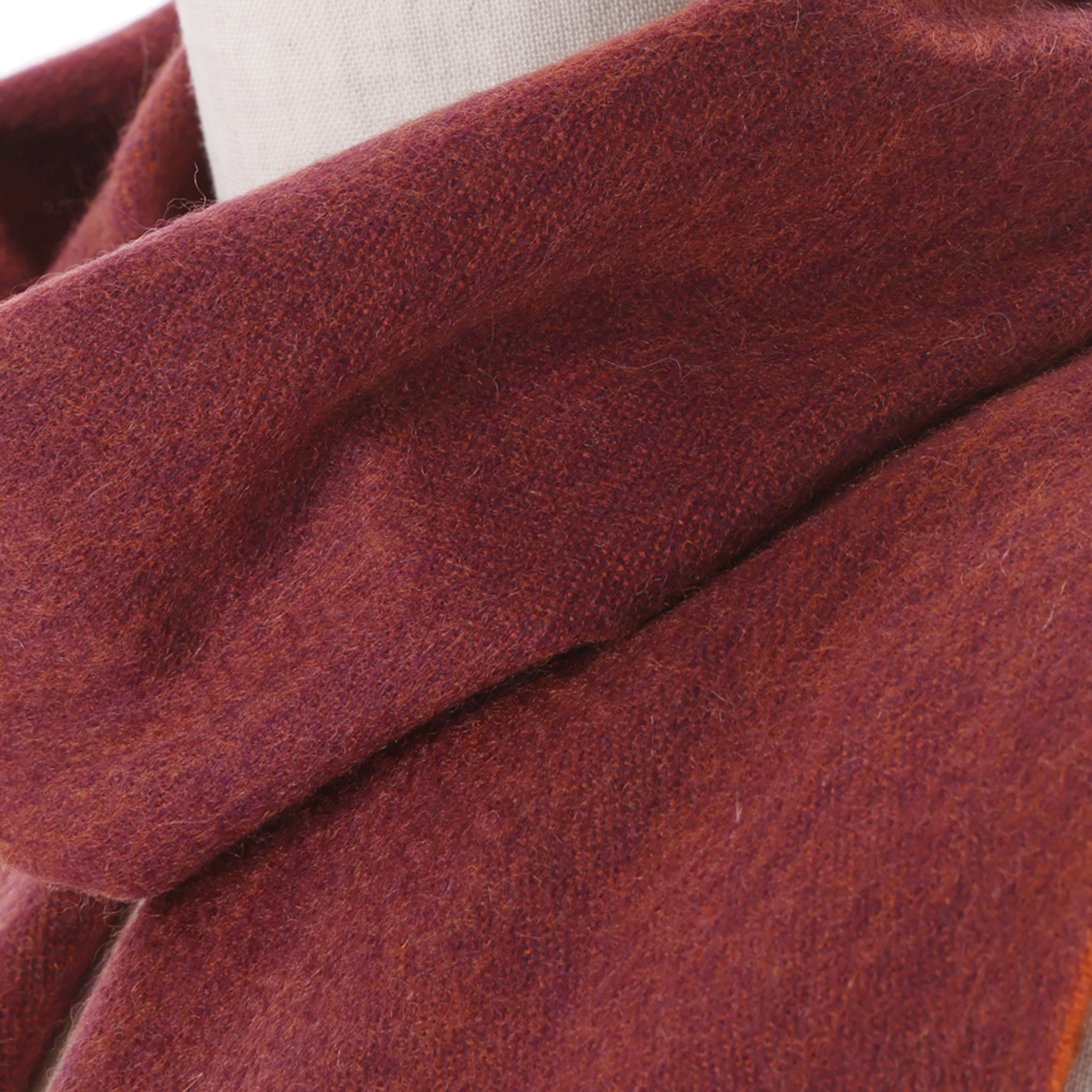 繊度が細く柔軟で軽さがあり、保温性・吸湿性に富んだソフトな風合いが特徴の、カシミヤ100%のマフラー。ジャカード織機でニュアンスの異なるカラーを裏面に配したリバーシブル仕様に織り上げました。程良く厚みがあり高級感のある仕上がりです