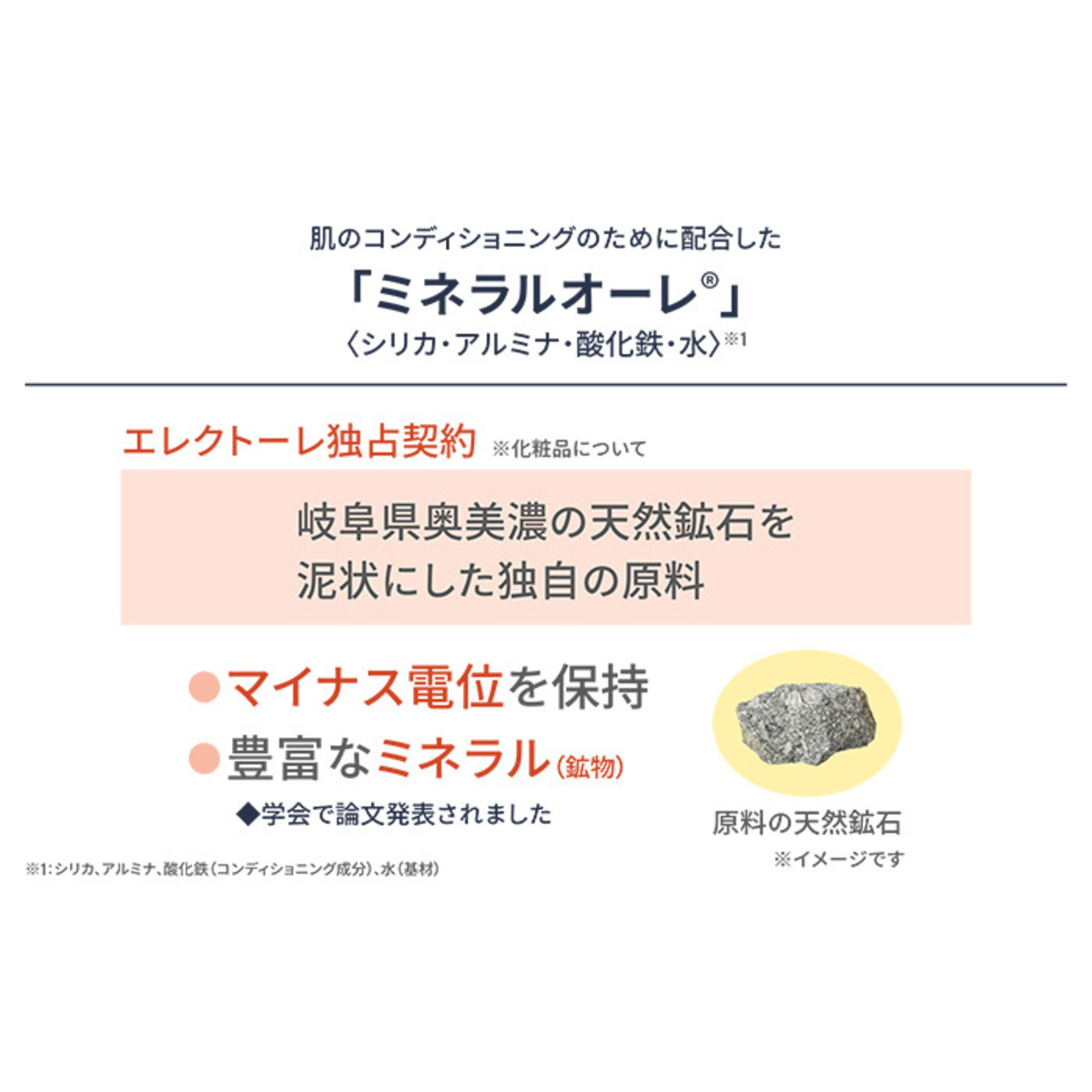 岐阜奥美濃の天然鉱石を厳選して使用。ミネラルオーレは天然鉱石を泥状にした化粧品原料で、スキンコンディショニングのために配合しています。このミネラルオーレ(水、シリカ、アルミナ、酸化鉄)は原料で、マイナス電位を保持していて、かつ、豊富なミネラル(鉱物)を含んでいます