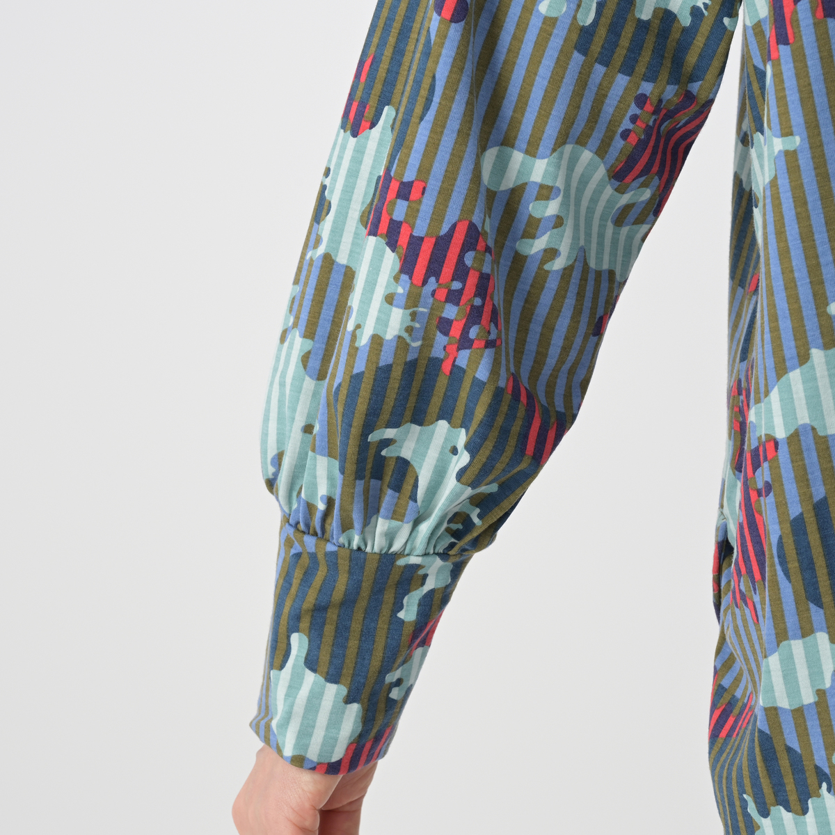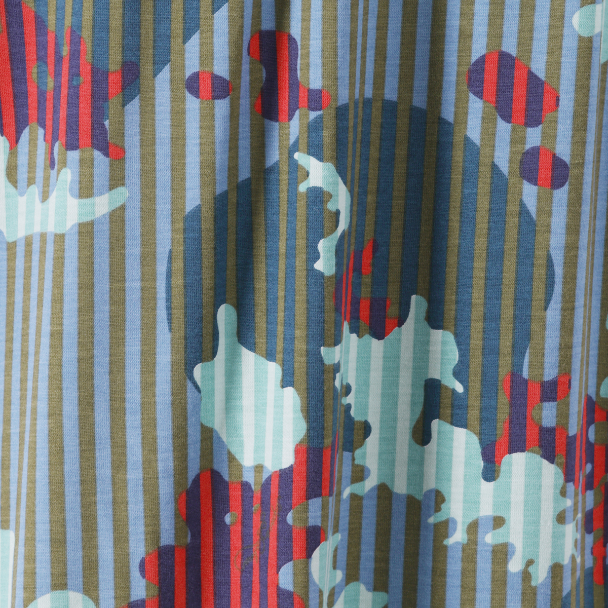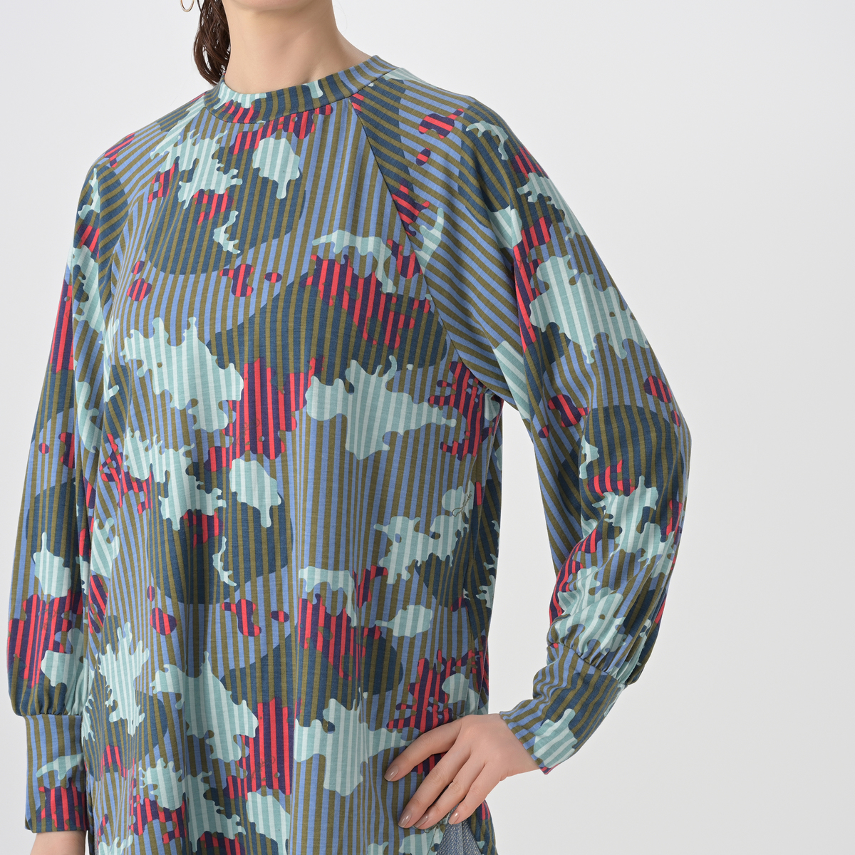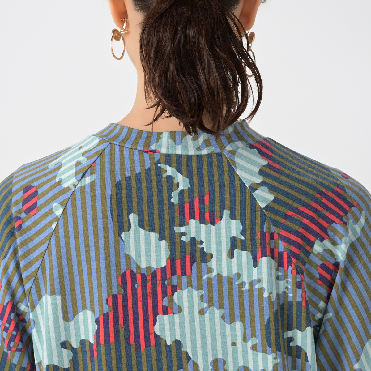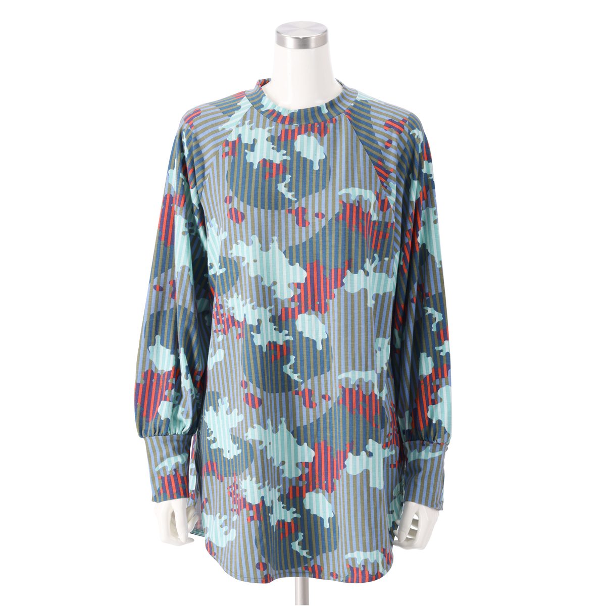 カラフルなプリント柄が目を引くチュニックです。肌触りが良くストレッチ性のある天竺生地に、総柄のカモフラ柄とストライプ柄をミックスして染み込みでプリント。ブランドロゴも入り、オリジナリティのあるデザインに仕上がっています