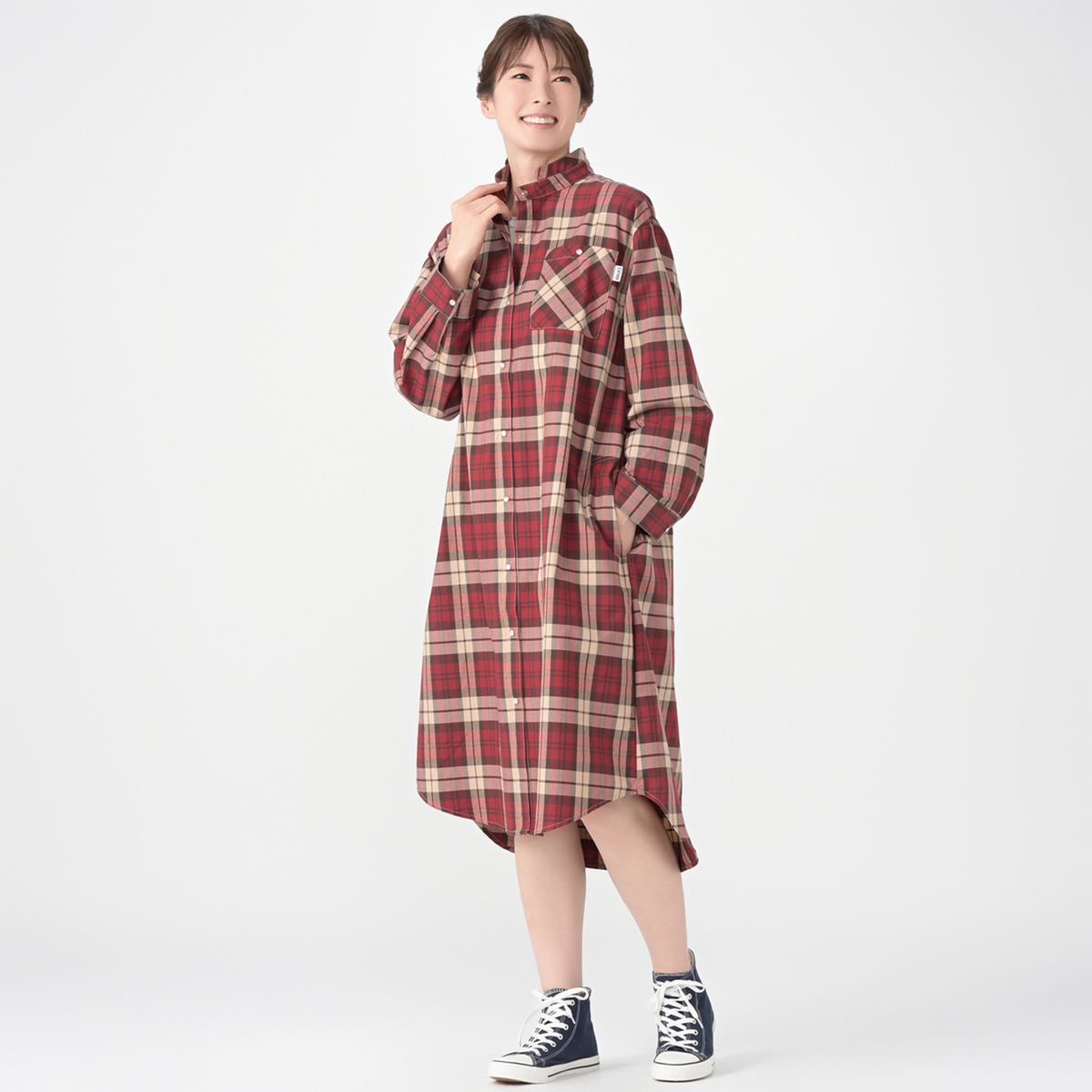 羽織としても楽しめる、チェック生地で仕立てたひざ下丈のシャツドレス。ややオーバーサイズで、後ろ中心にはボックスタックを施しボリューム感を出しています