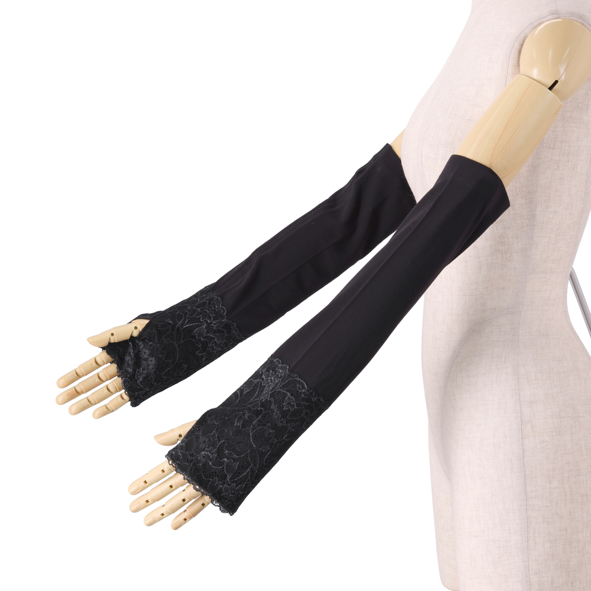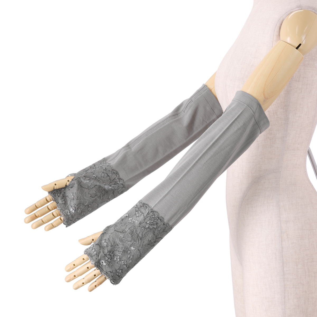保湿繊維*を使用。素材に抗菌防臭加工を施し、繊維につくにおいの元を抑制します。レース側を手先にしたり、生地側を手先にしたりと2WAYで着用可能。レースにはラン止め加工を施し、鮮やかな発色性と優れた堅牢度が特徴のユニチカテキスタイルのA.H.Yを織り込んでいます
