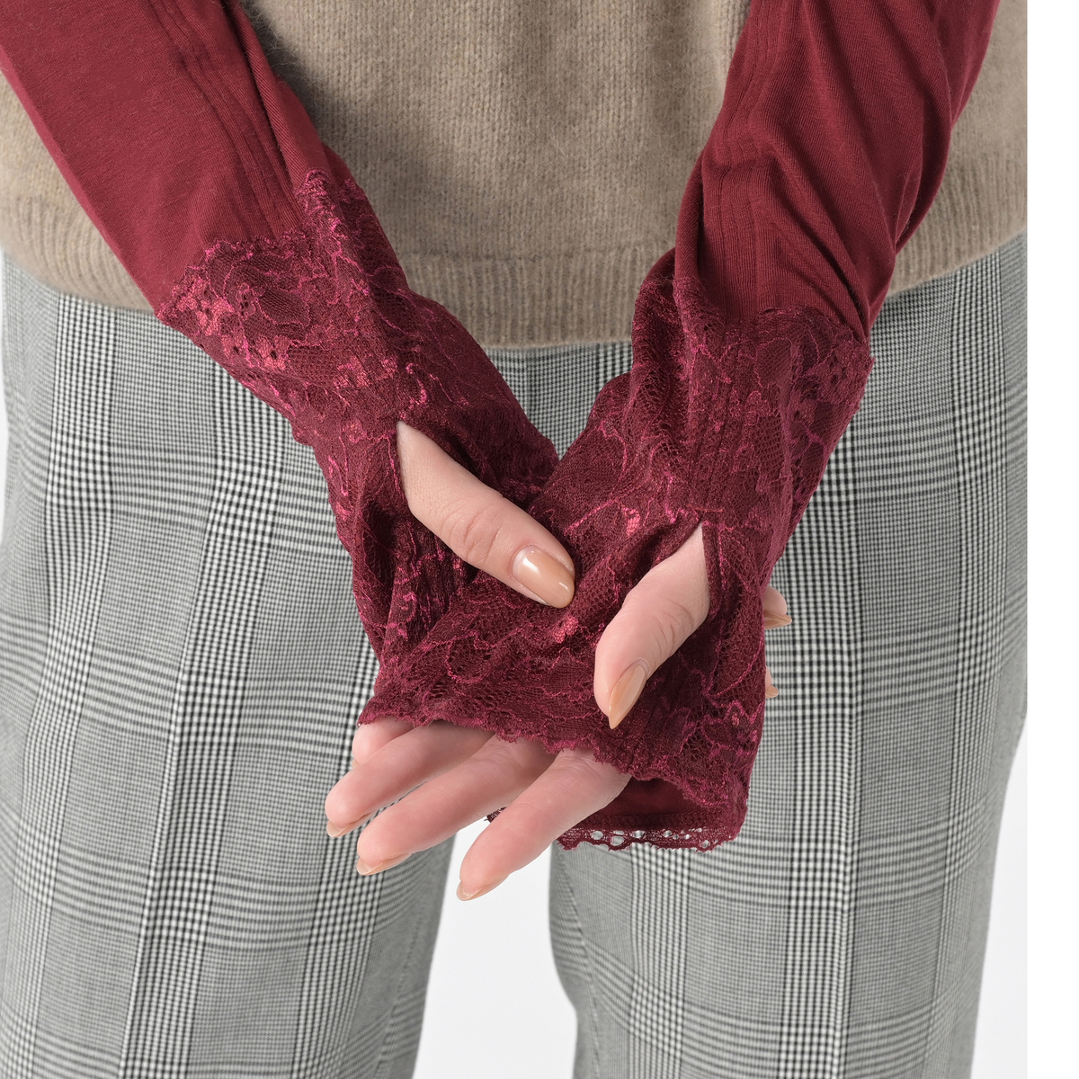 先にグリーン色を購入し、この度バーガンディ色を購入。主に寝るとき手首が冷えないようにパジャマの上からしてます。素材が柔らかくてひじまで伸ばしてもゆったりで気に入ってます。バーガンディ色、ボルドーより暗くなくて良い色ですね。レースが綺麗で可愛いです。タートル1枚より高いので星1つ減ってます。