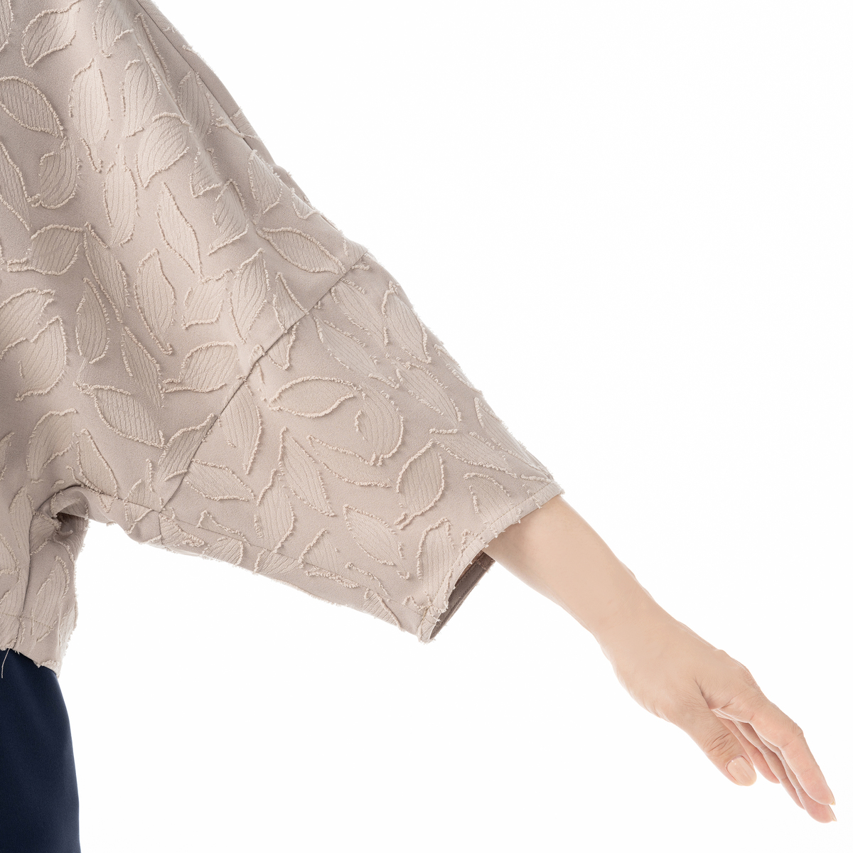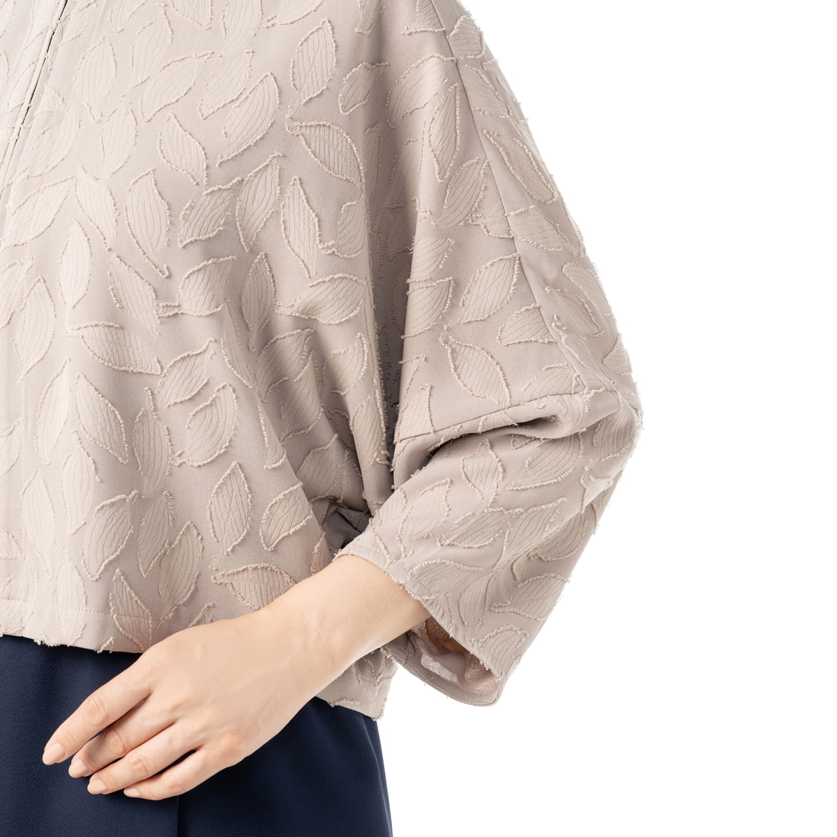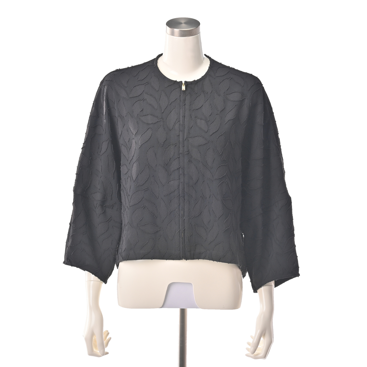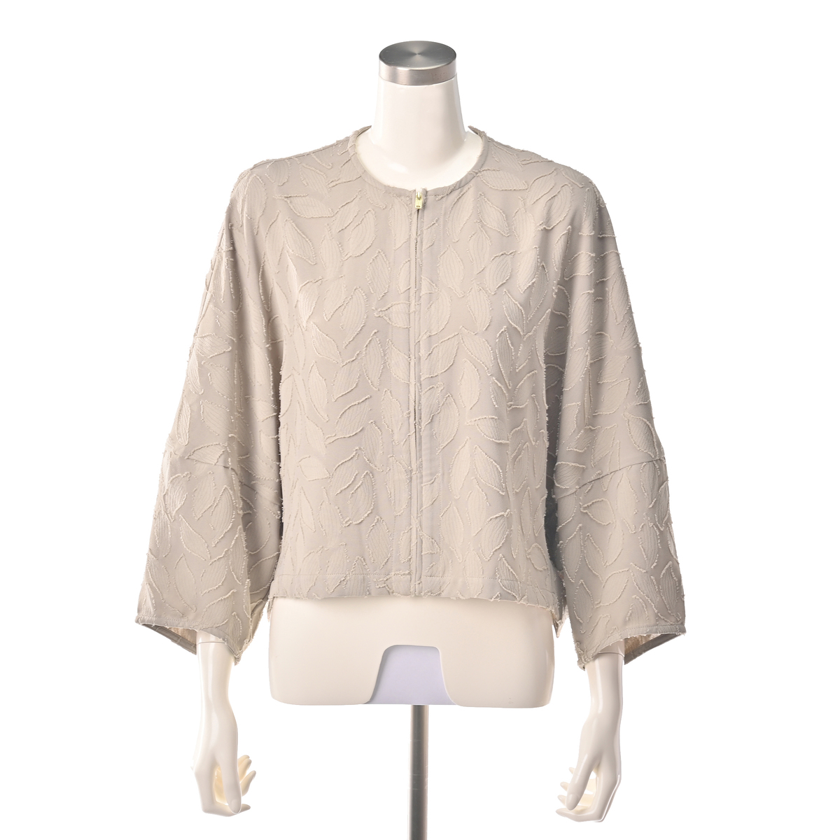 ジャカードレース柄のエレガンスな素材で仕立てたブルゾン。さっと羽織るのに重宝するショート丈で、重ねるだけで旬なコーディネートを作ってくれます