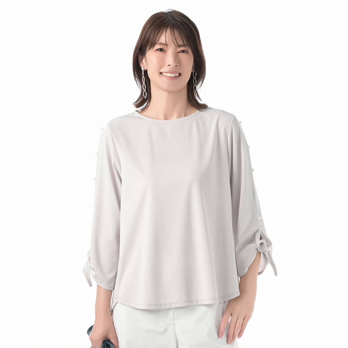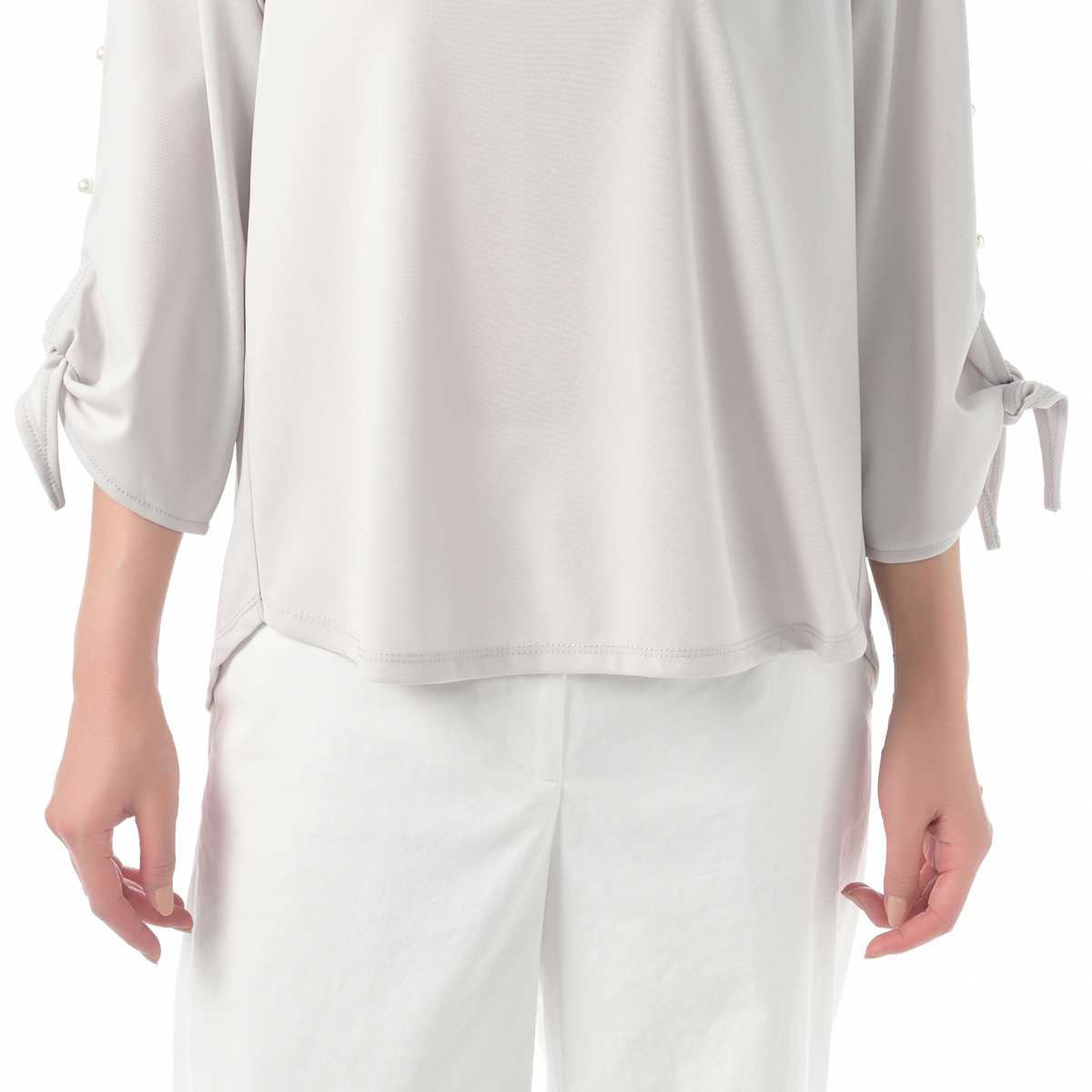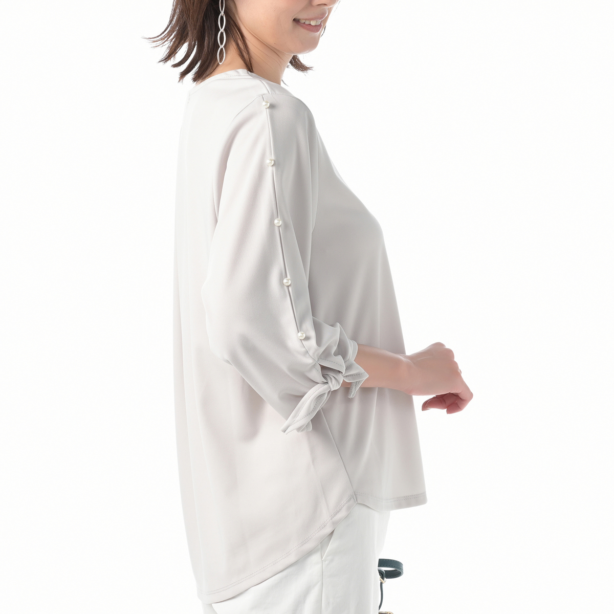 袖のパール調パーツが華やかなブラウスです。袖口を結ぶデザインが、手首を華奢に演出。裾は前後差があり、ボトムスにインしてもアウトで着ても、トレンド感のあるスタイリングが楽しめます