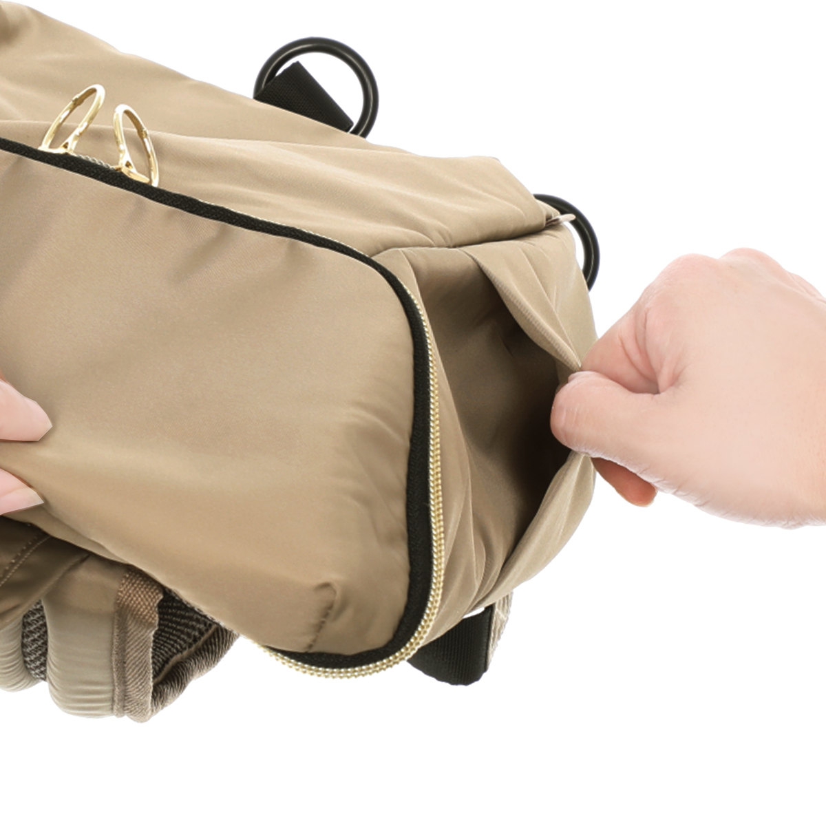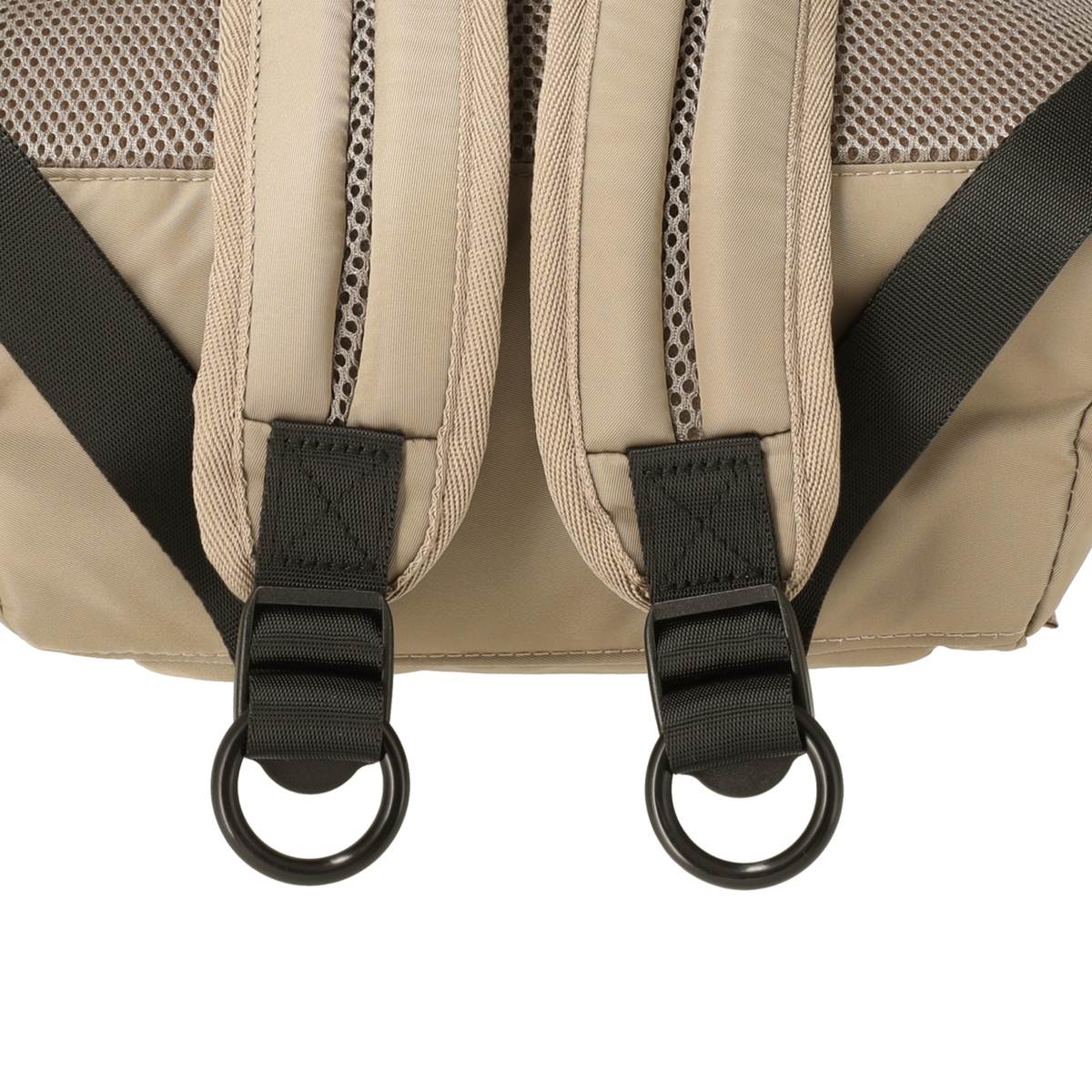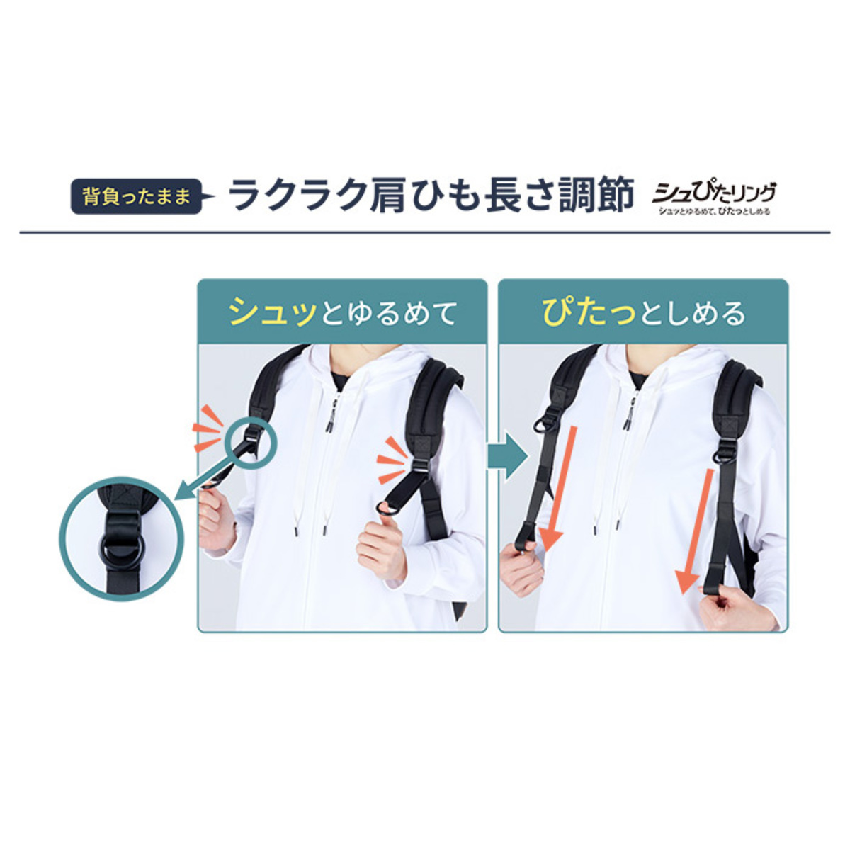 シュぴたリング搭載で、バックパックのショルダーの長さを、背負ったまま簡単に調整可能。バックパックで蒸れやすいとされる背面には、通気性の良いメッシュ生地を採用しています