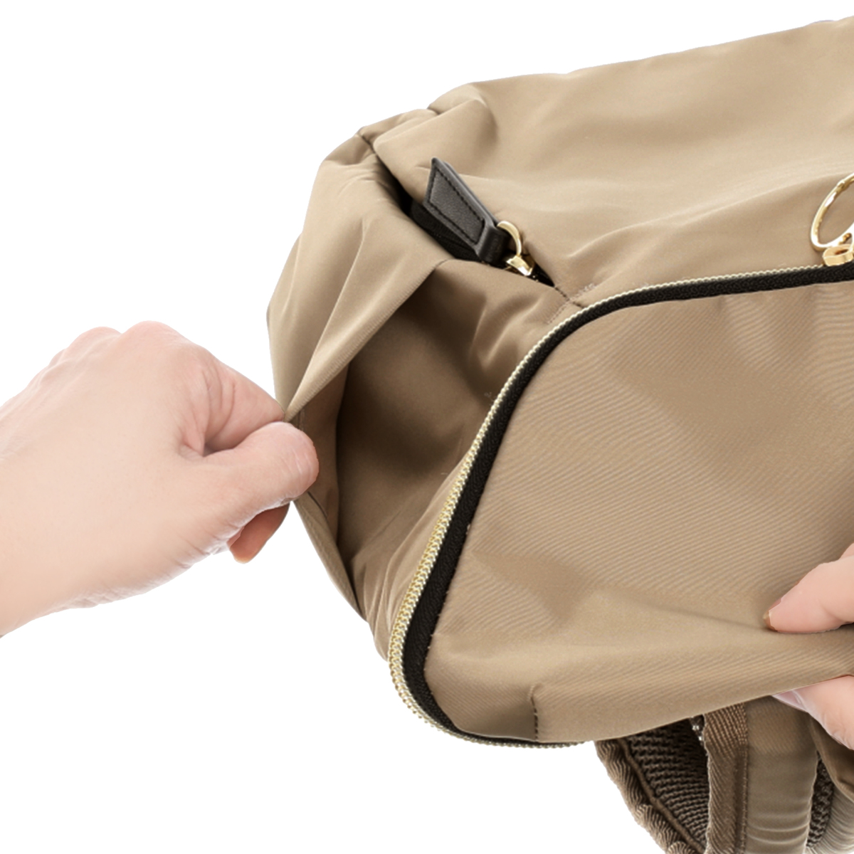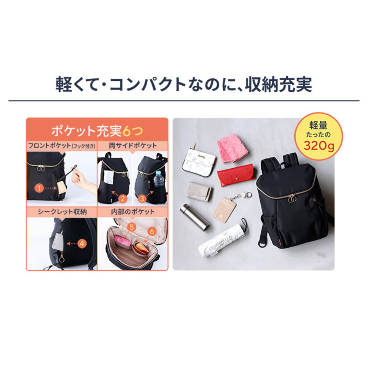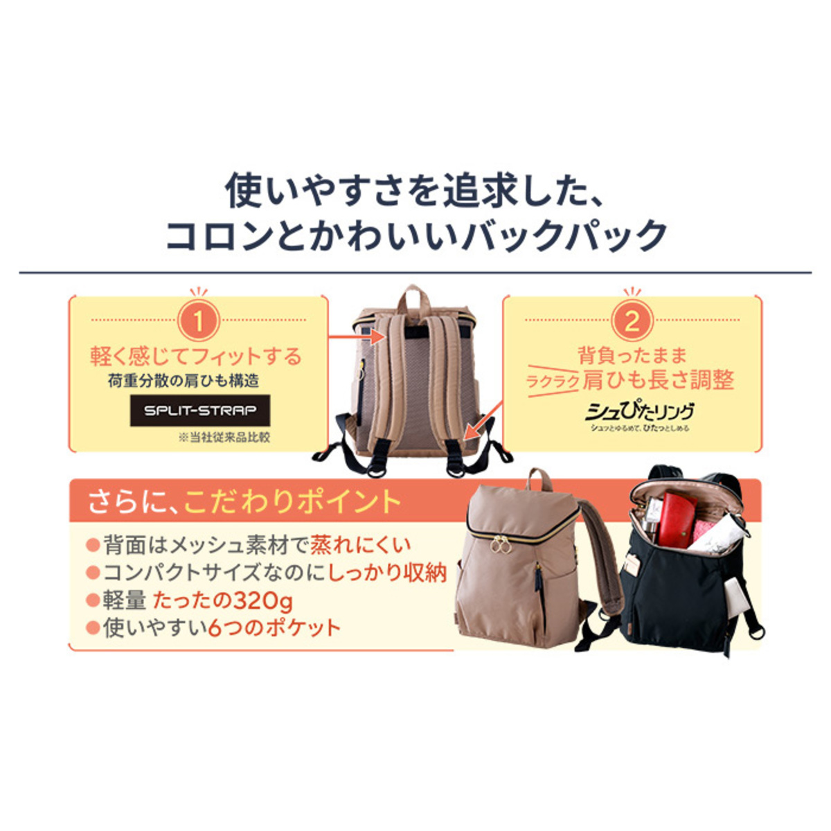 シュぴたリング搭載で、バックパックのショルダーの長さを、背負ったまま簡単に調整可能。バックパックで蒸れやすいとされる背面には、通気性の良いメッシュ生地を採用しています