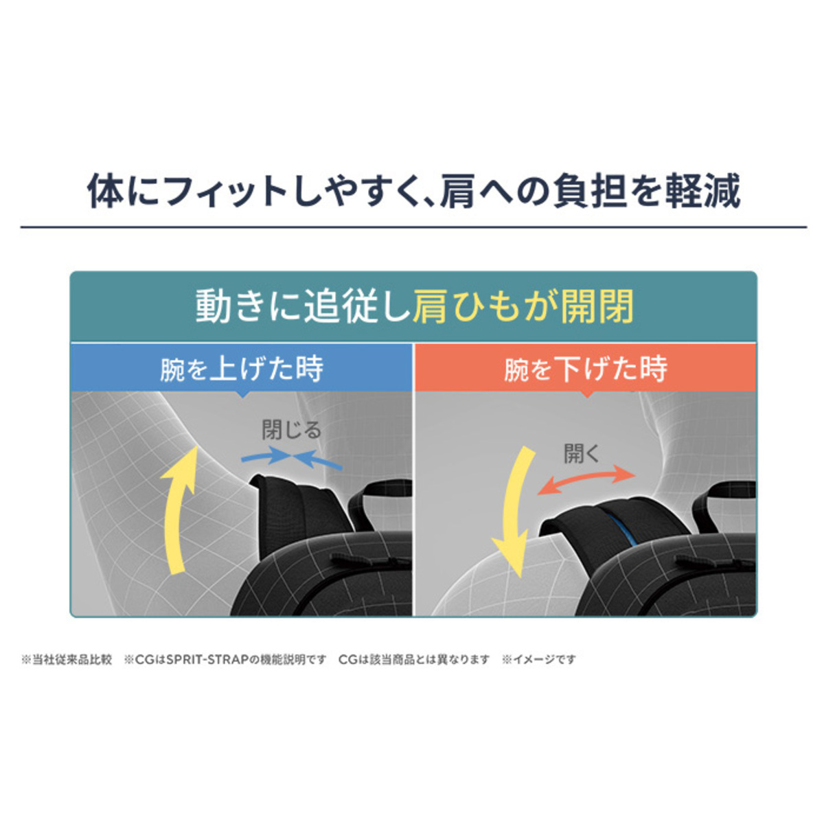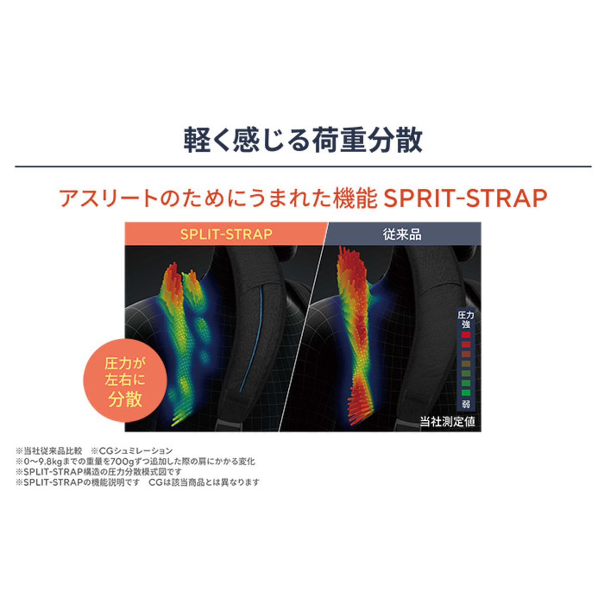 アスリートの肩への負担を軽減するために開発された「スプリットストラップ」搭載のバックパック。「スプリットストラップ」は、ショルダーベルトの分割設計で荷重を分散し、肩にフィットしやすい角度設計と連動して軽量感を生み出すことで、肩にかかる圧力を軽減します