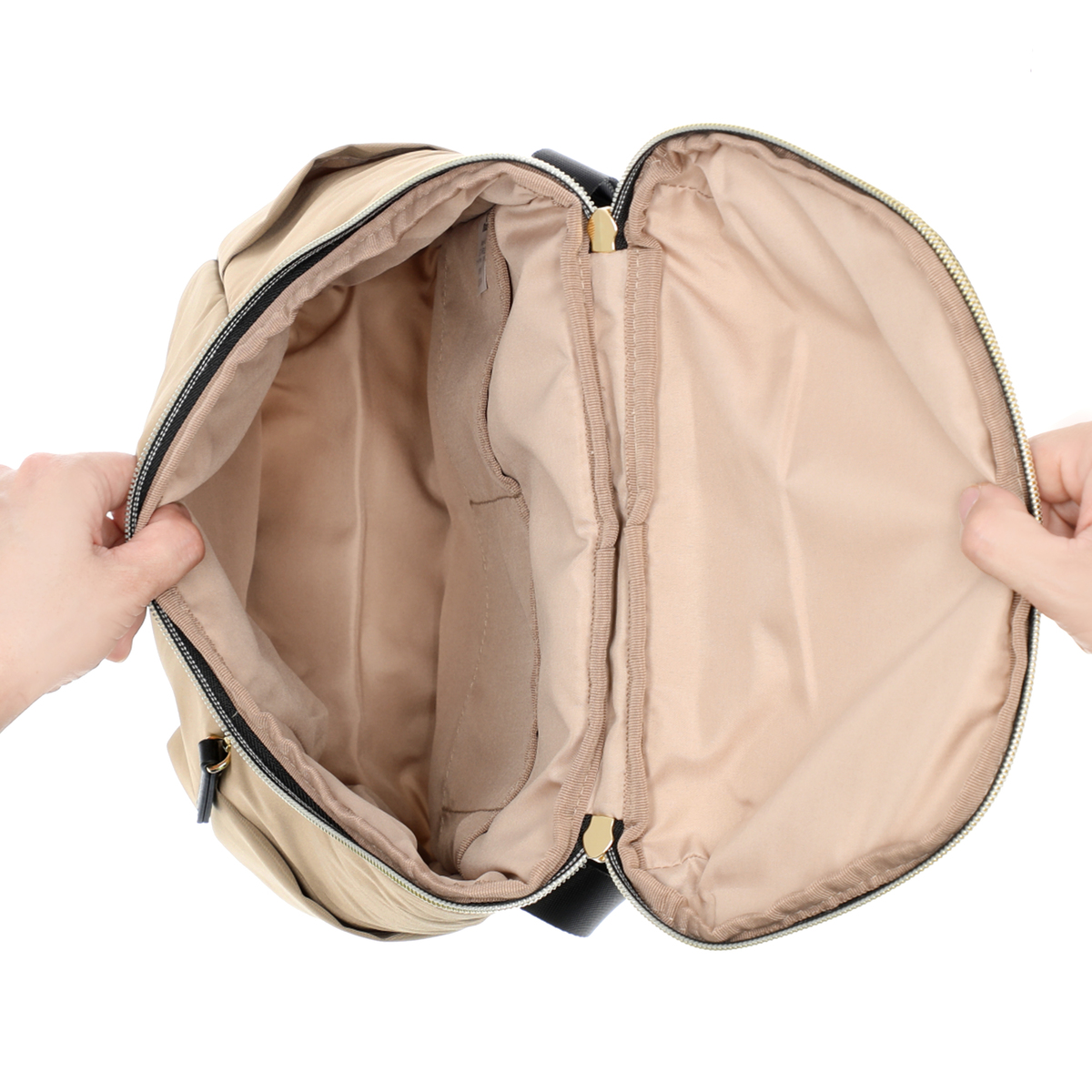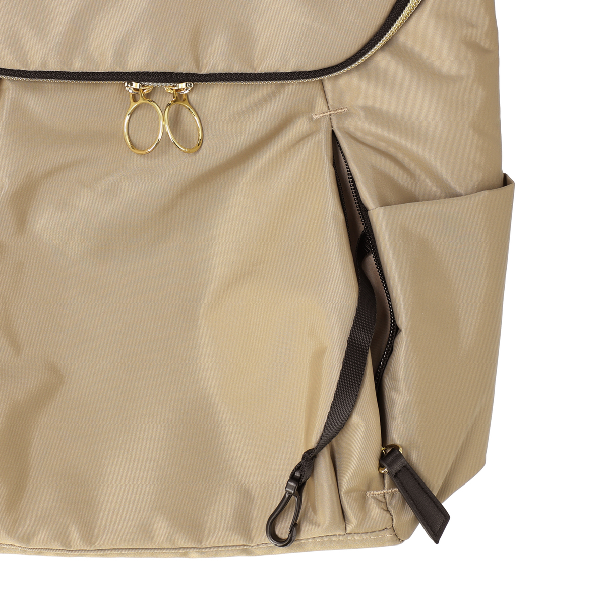 [サイズ(約)] 縦32×横25×マチ11cm ショルダーベルト長さ:40〜80cm ハンドル立上り 7cm [重量] 約320g [素材] 表地:ナイロン(裏加工PU) ※裏地有 [仕様] 開閉:ファスナー式 底ビョウ:無 [ポケット] 内側:オープンポケット×2 外側:オープンポケット×2、ファスナー付きポケット×2 【中国製】 [注意事項] ※合成皮革(PU)、合成繊維(ナイロン、ポリエステル)素材の汚れは、水もしくは薄めた中性洗剤をつけた布を絞って軽くお拭き取り下さい ※合成皮革(PU)には撥水スプレーを使用しないで下さい ※天然皮革の素材の軽い汚れは、乾いた布でカラ拭きして下さい ※油性の汚れや強い汚れは、柔らかい布に皮革用クリーナー(無色)を少量含ませ軽く拭くようにして下さい ※使用しない時は通気性の良い、日陰で保管して下さい。特にナイロン素材は高温・多湿状態になると水分を吸い、生地が伸びてシワが出る場合があります。温度及び湿度の低い、通気性の良い状態で保管して下さい ※合成皮革(PU)の表面ウレタン樹脂は、水分により時間と共に生地の表面が劣化してきます。ご使用状況や保管状態により耐用年数が異なりますが、特に高温・多湿状態での保管はお避け下さい ※本体生地、テープ等の染色堅牢度(色落ち)については十分に注意はしておりますが、水、汗、摩擦などの諸条件により多少の色落ちは避けられません。バッグが濡れたままや濡れ物を収納した場合は陰干しをして下さい(天然皮革、綿布の場合、現在の染色技術では色落ちは避けられません。特にご注意下さい) ※蛍光生地(白色含む)、蛍光プリントを使用している場合、特殊蛍光塗料を使用しているため長時間光に当たると変色、退色することがあります ※ファスナー部分に砂が付着したままや濡れた状態で使用されますと破損の原因になります ※バッグの収納物が重い場合は、背負いベルト・ショルダー・持ち手など、荷重のかかる部分を片方だけ強引に持ち上げたり、引っ張ったりすると破損の原因になります。特にペアーとなっている背負いベルトや持ち手などはペアーで持ち上げたり、引っ張って下さい ※通常のご使用、保管状況においても長時間のうちに品質、性能が低下する恐れがあります。特に焚き火、ストーブ等の近くや高温となる車のトランク等に放置されますと、品質、性能の低下が促進される場合がありますのでご注意下さい ※バッグは洗濯機にかけたり、水洗いしたりしないで下さい。生地が傷んだりコーティングなどがはがれたりする原因となります ※白色の合成皮革(PU)、合成繊維(ナイロン、ポリエステル)を使用しているものは、高温・多湿状態及び直射光線・ライトの下で長時間使用または放置されますと、黄変することがありますのでご注意下さい