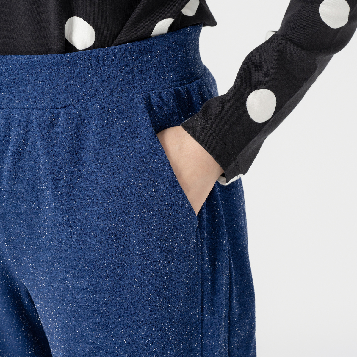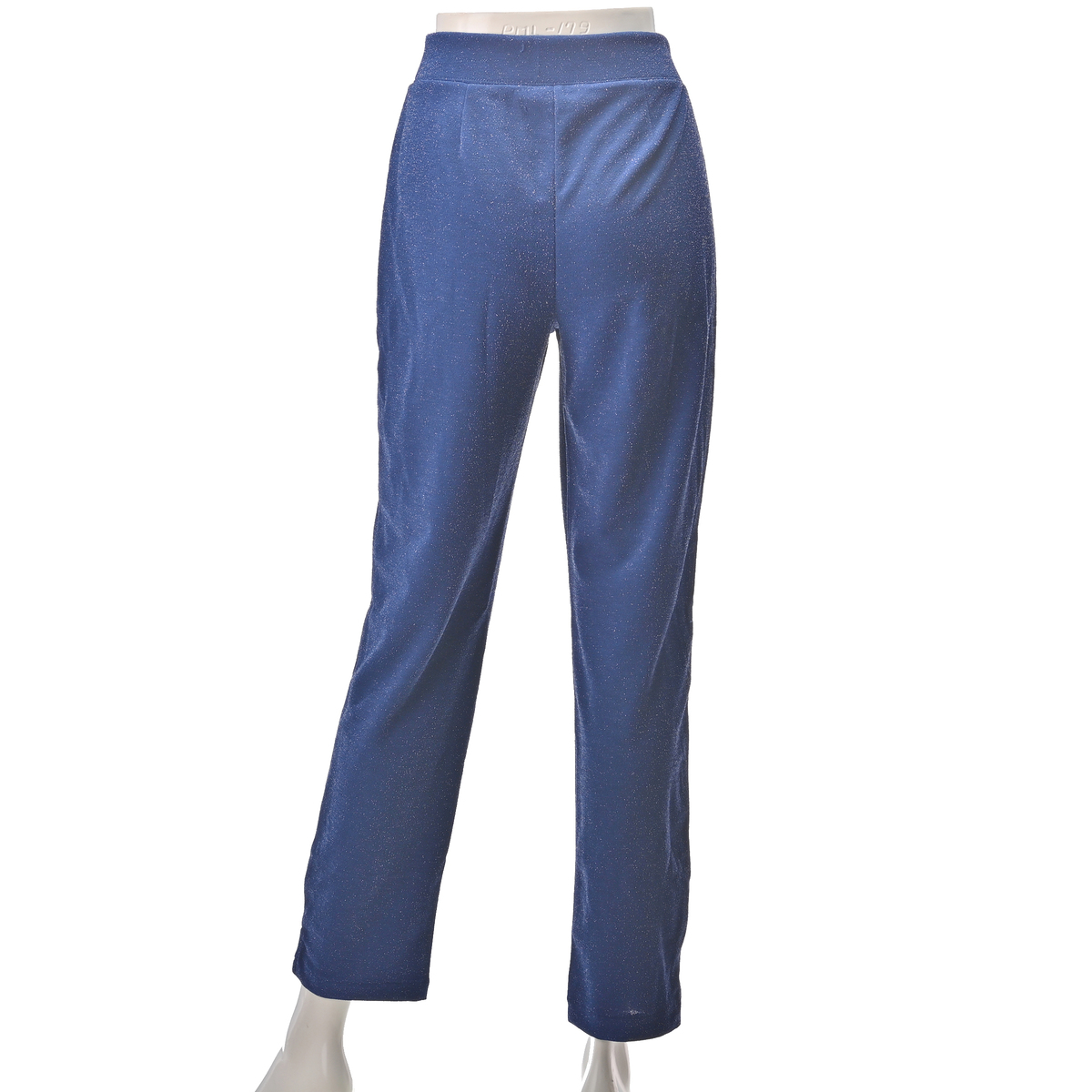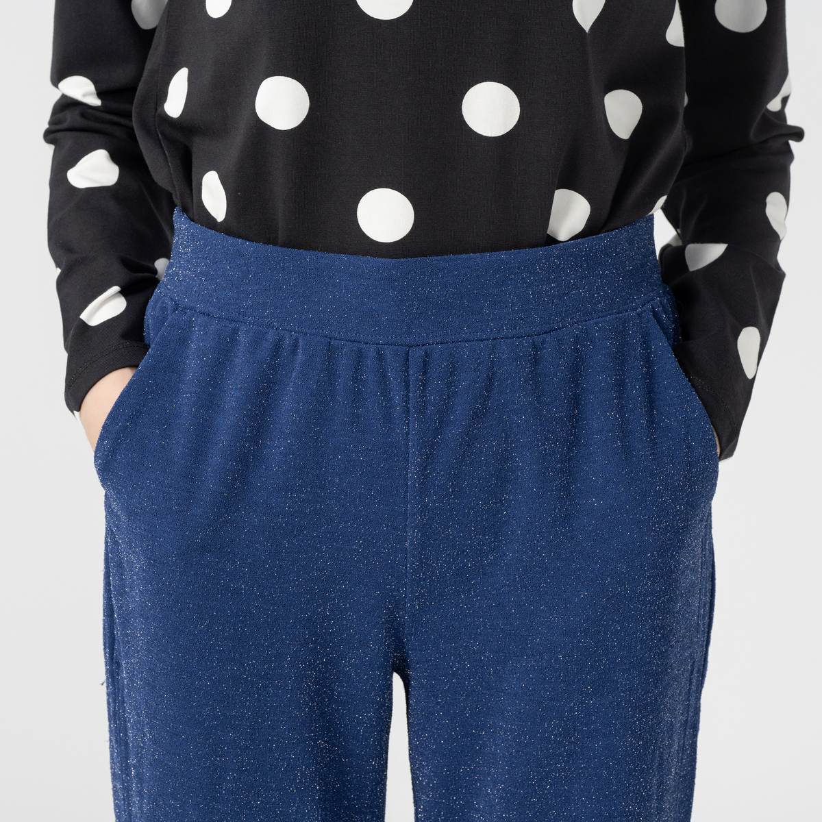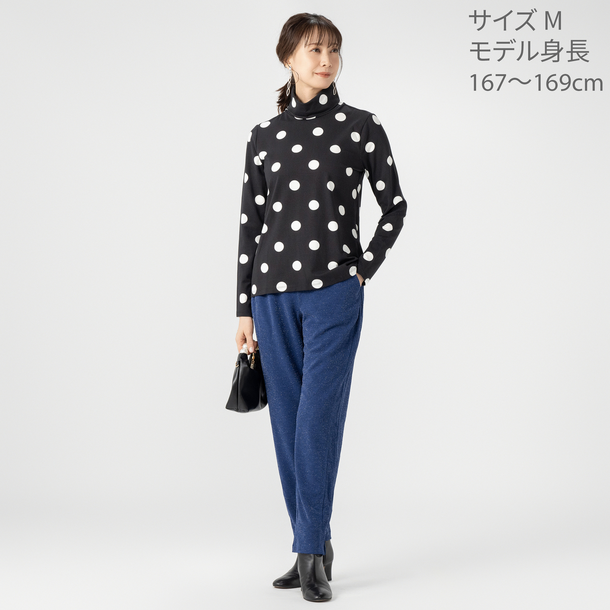 ラメ入りクレープ素材のストレートパンツ。上品なラメ感で、オンでもオフでもコーデしやすい上品なデザイン。ウエストは全体がゴム仕様のプルオンタイプで穿き心地はラクチン。両脇裾はスリット入りで、前左右には便利なポケットを付けています