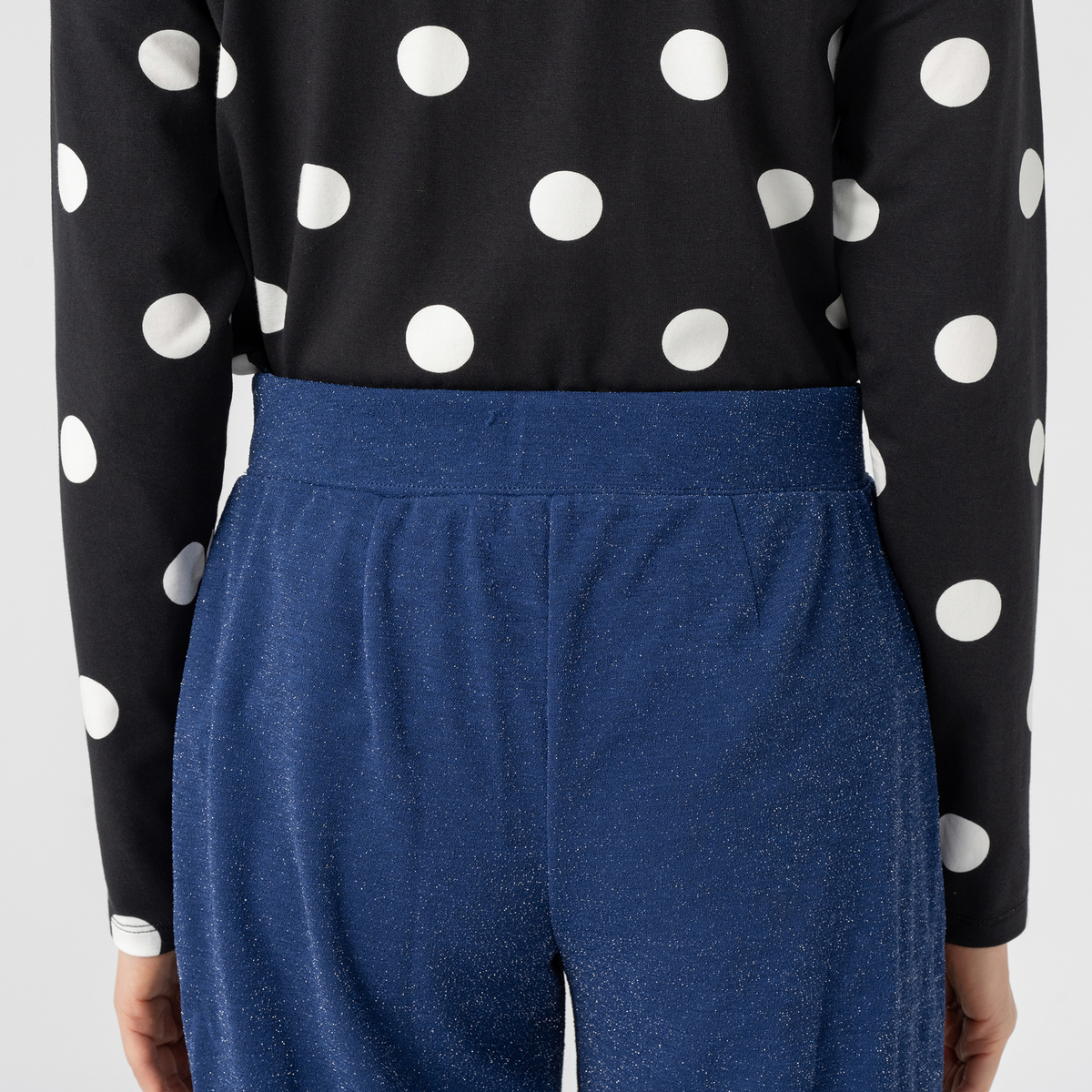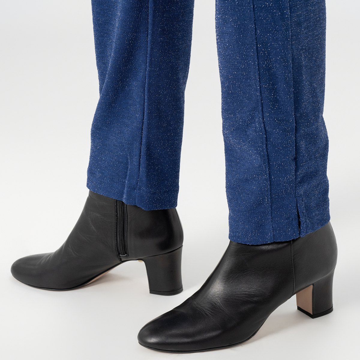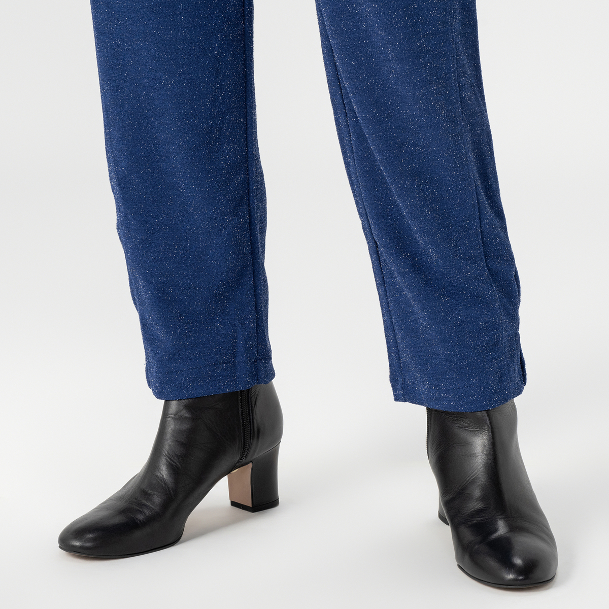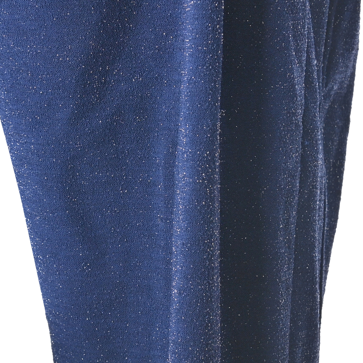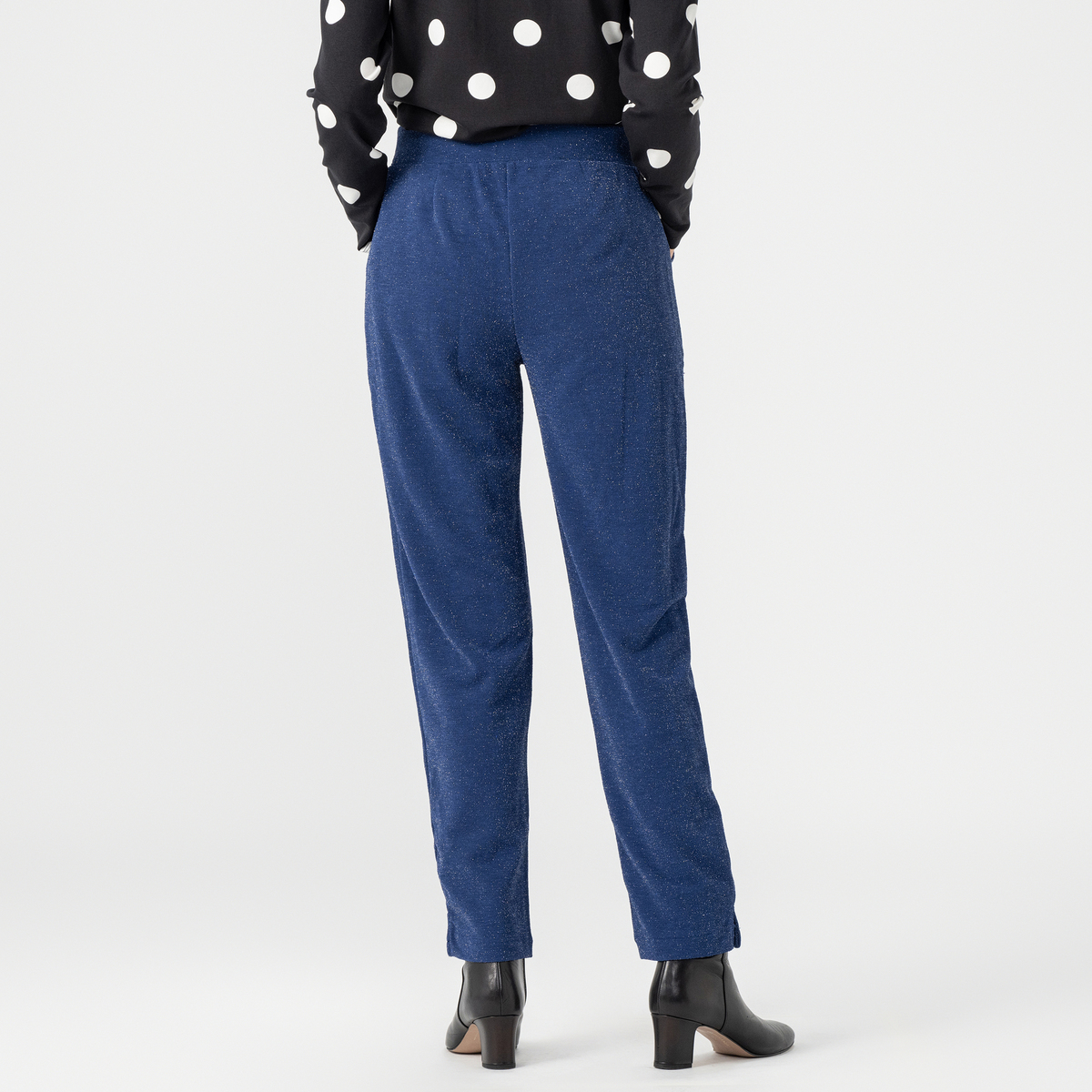 ラメ入りクレープ素材のストレートパンツ。上品なラメ感で、オンでもオフでもコーデしやすい上品なデザイン。ウエストは全体がゴム仕様のプルオンタイプで穿き心地はラクチン。両脇裾はスリット入りで、前左右には便利なポケットを付けています