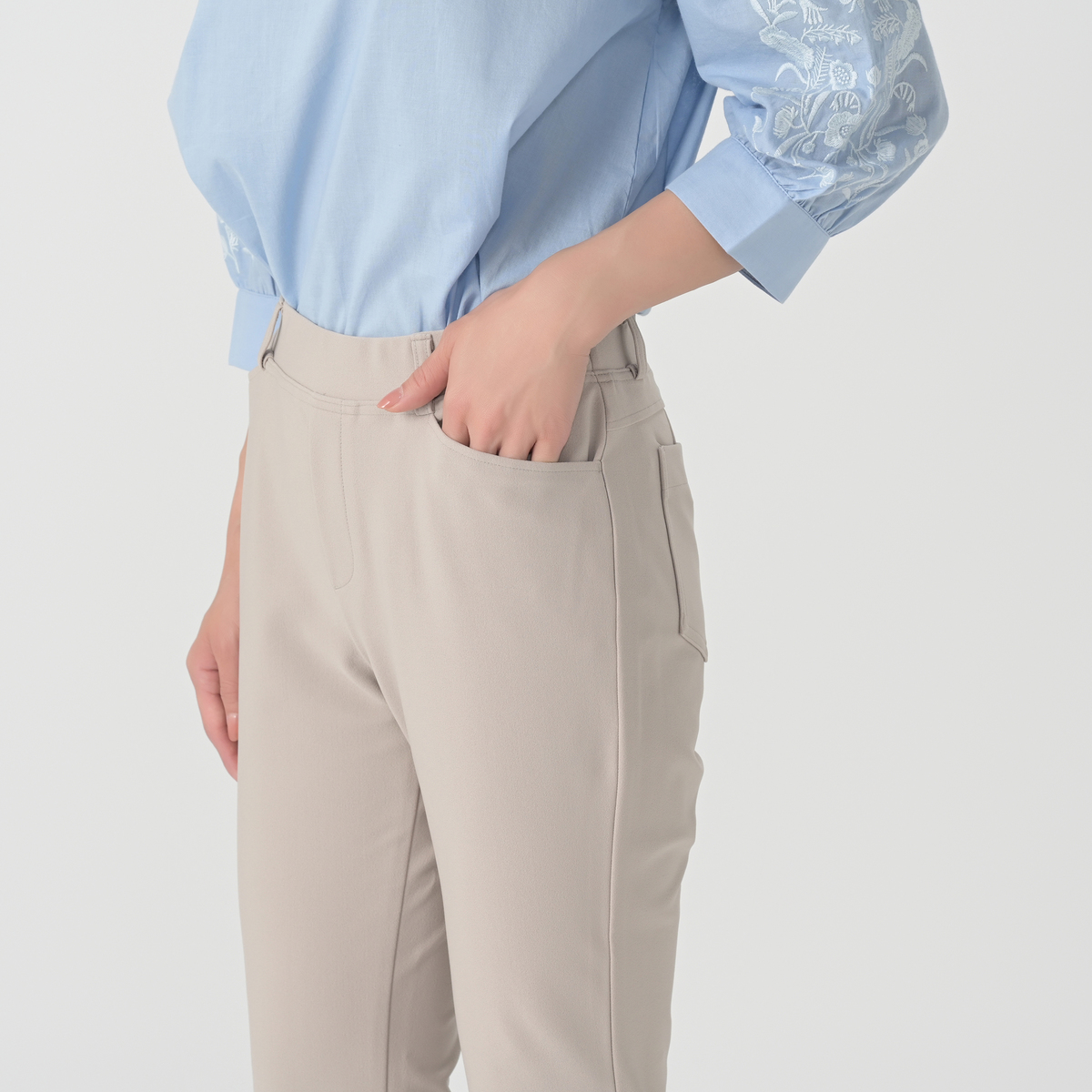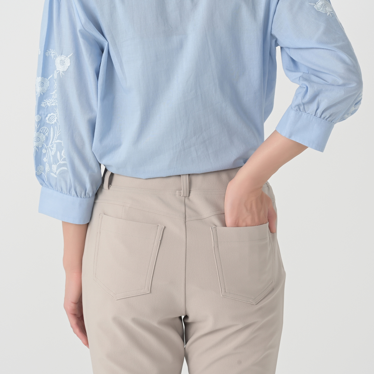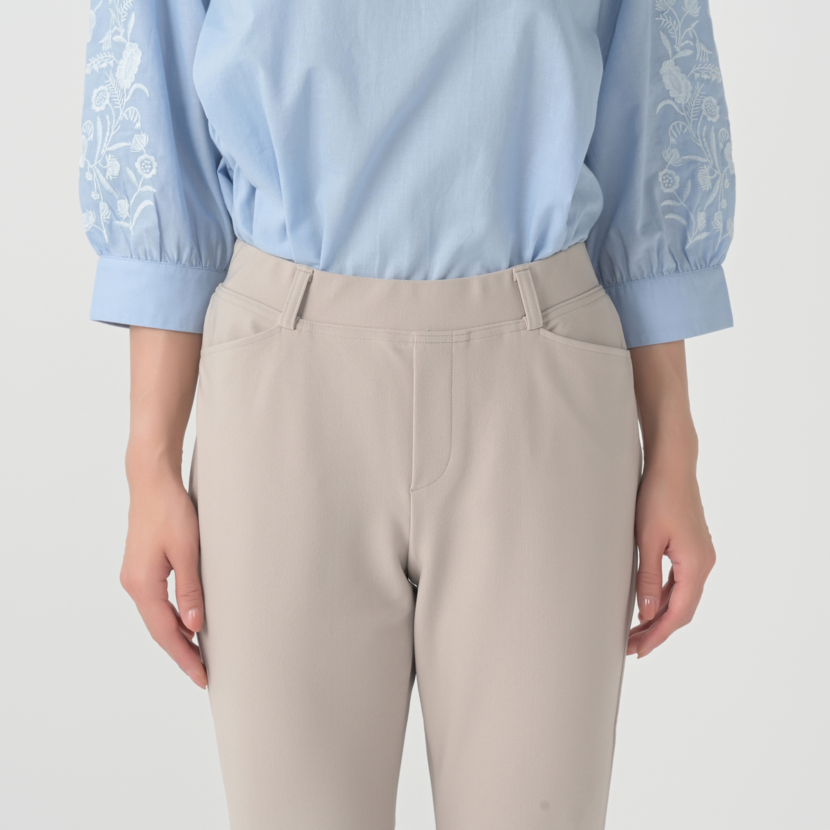 ウエストは総ゴム仕様で、身体のラインに沿う立体的なパターン設計。お腹周りをすっぽり包み、すっきり穿きこなせます。また、お尻周りに施したダーツが丸みのあるヒップラインを演出してくれます