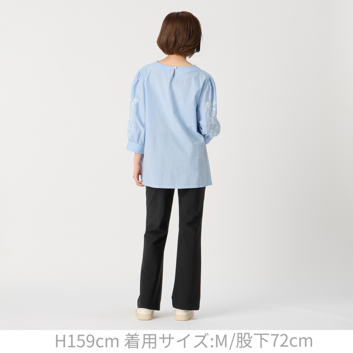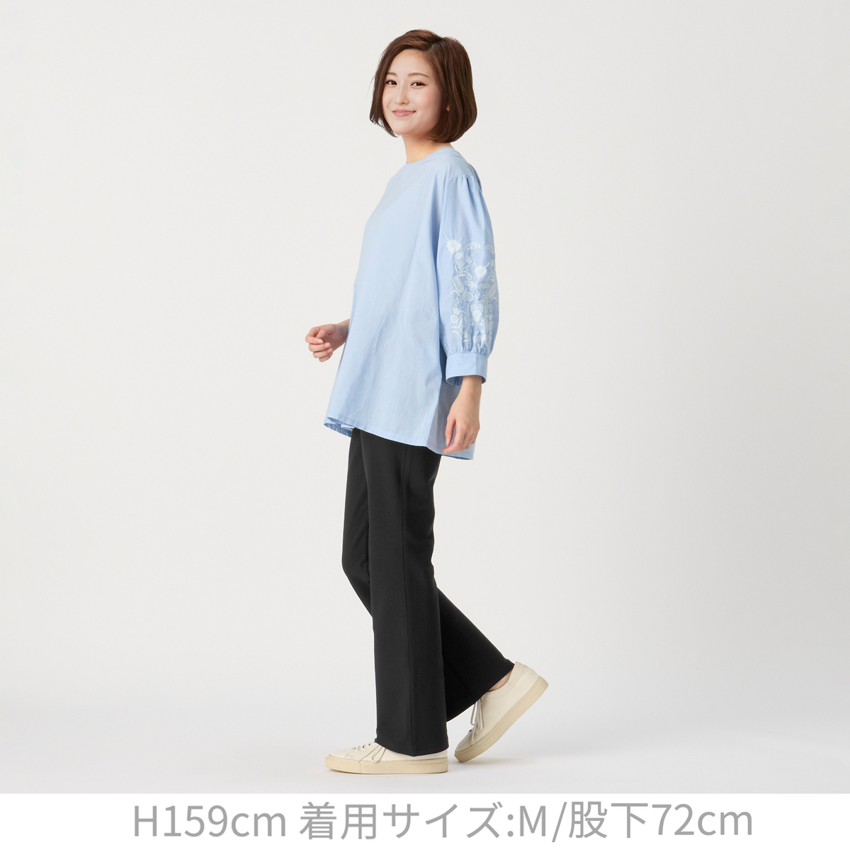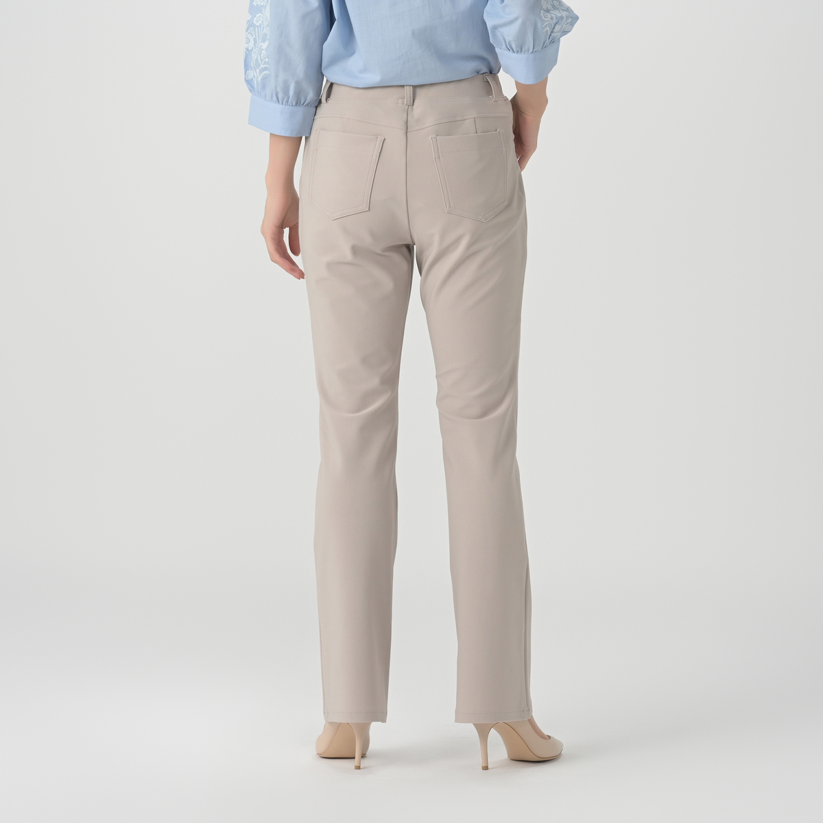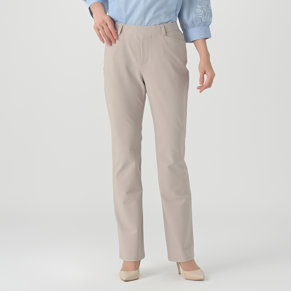 ウエストは総ゴム仕様で、身体のラインに沿う立体的なパターン設計。お腹周りをすっぽり包み、すっきり穿きこなせます。また、お尻周りに施したダーツが丸みのあるヒップラインを演出してくれます