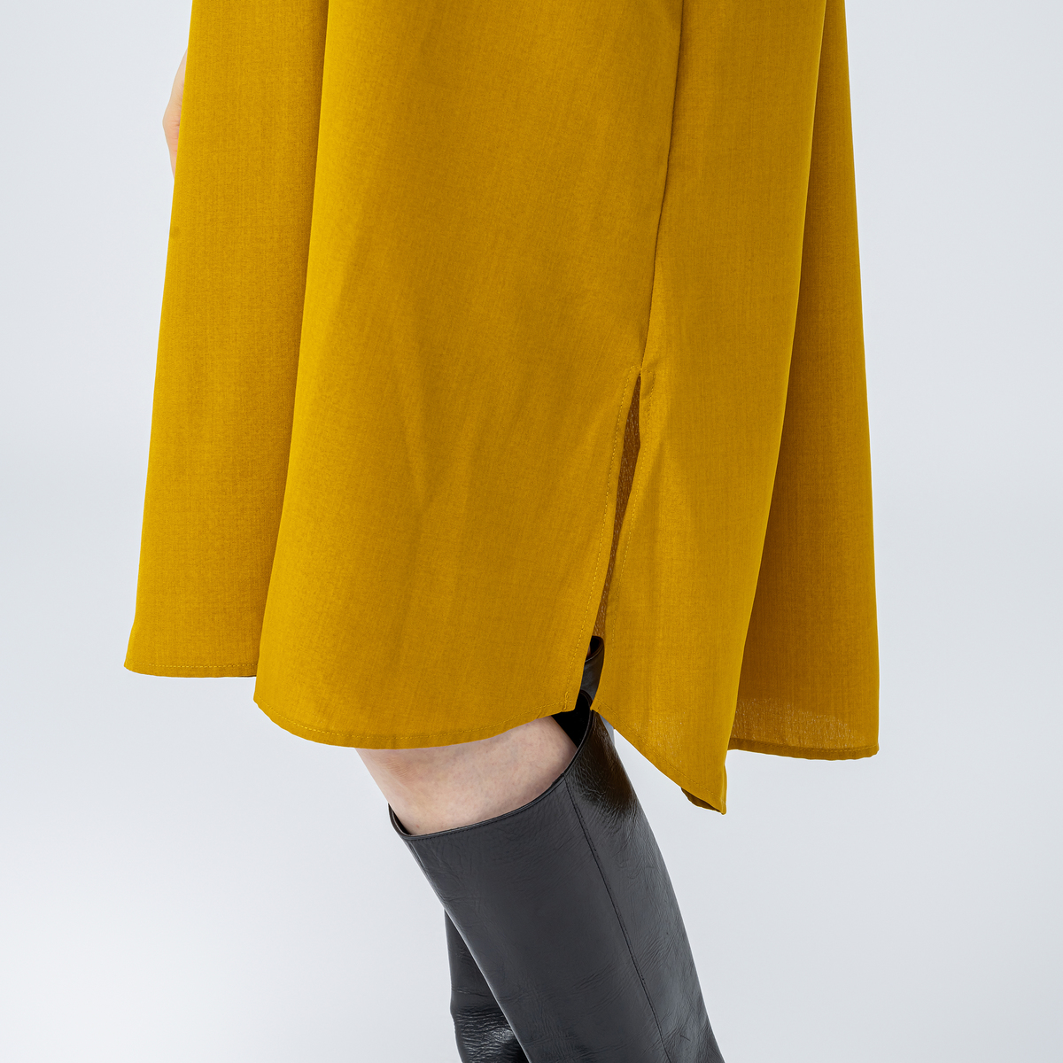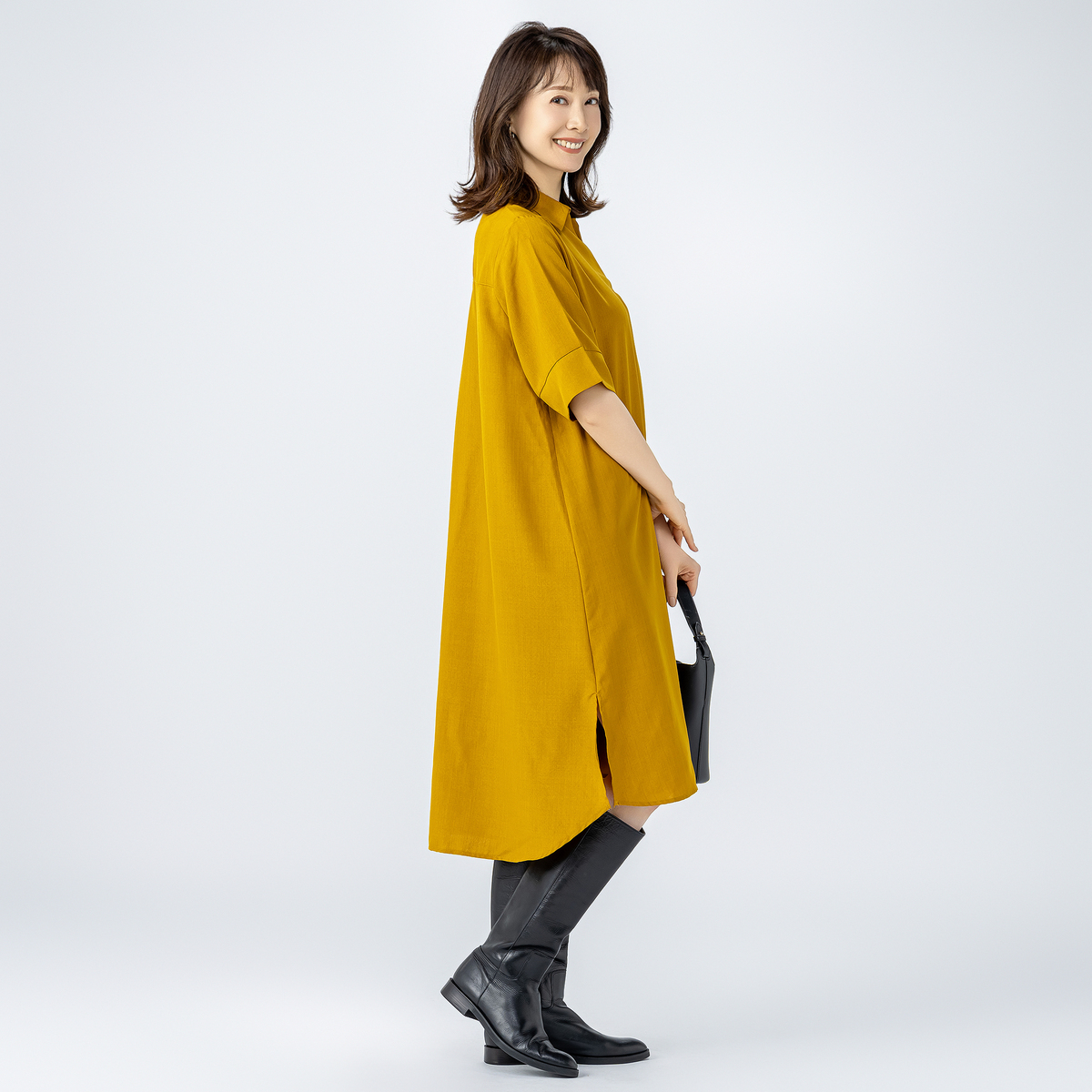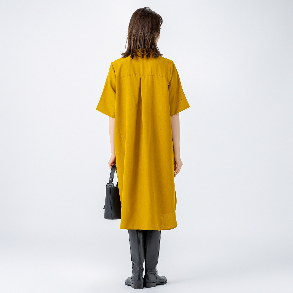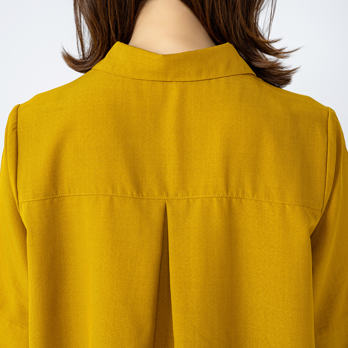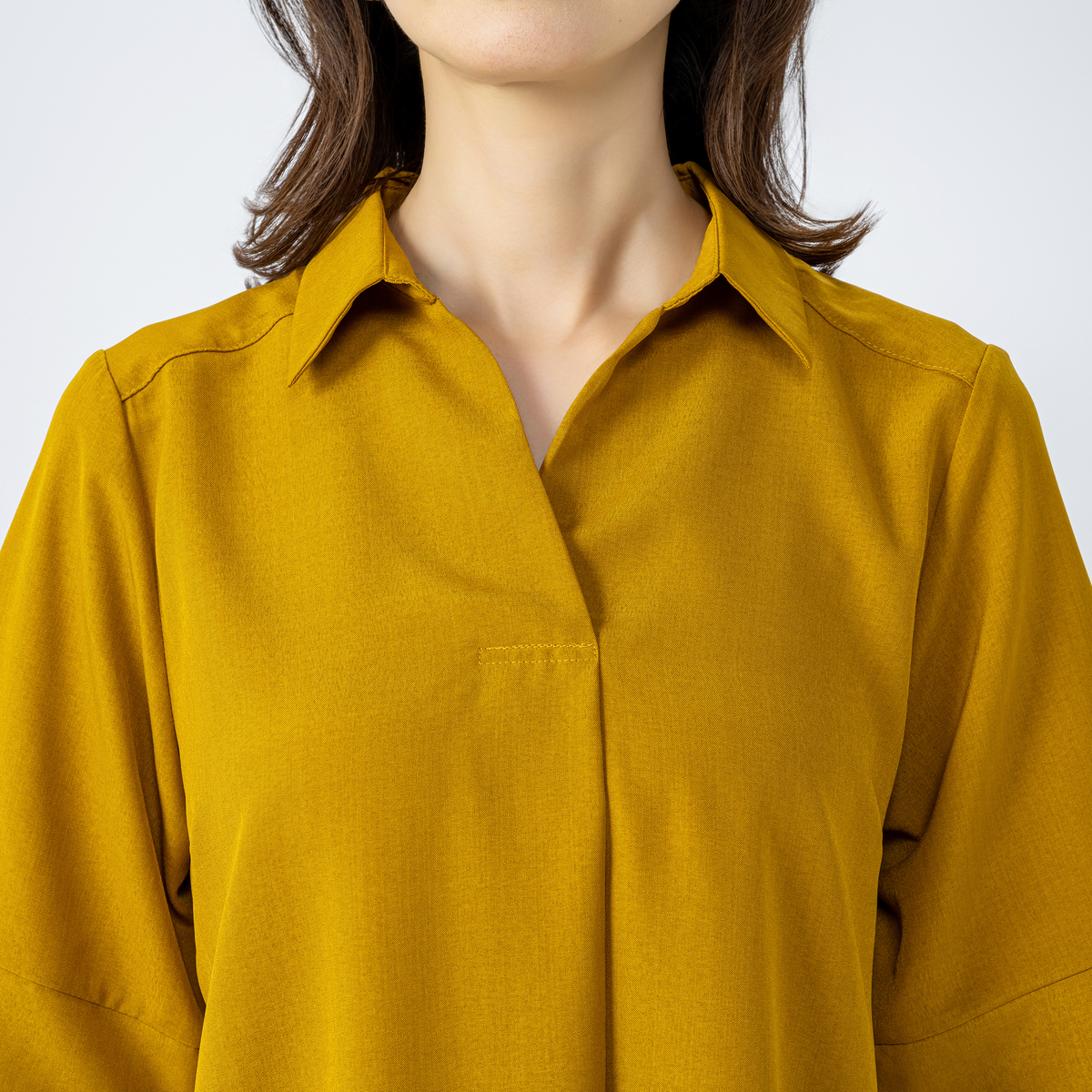 アームホールも袖幅もゆったり仕様。衿は開きの重なりを深めにして留め付けたことで、首元が開き過ぎず1枚でも着やすくなっています。身頃から裾に向かって広がるパターンでも、着用時はストンと落ちて広がり過ぎない見え方に。体のラインも出にくく体型をカバーします