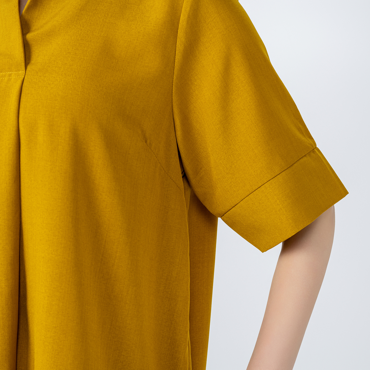 サラリとした肌触りの布帛を使用。軽やかながらも程よい厚みで、適度なハリ感もありシルエットがきれいに出ます。清涼感もあり、心地よい着用感。ご家庭での洗濯機洗い(ネット使用)ができるイージーケア素材なので、取り扱いも簡単です