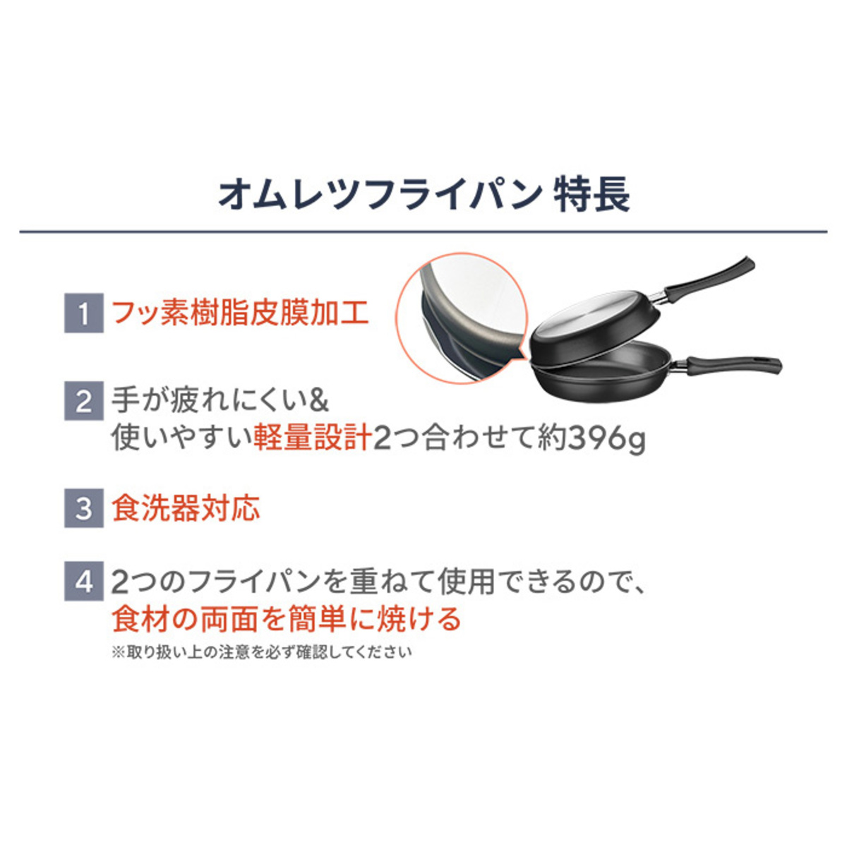 [商品内容] フライパン(大、小 各1) [サイズ] 直径:20cm 全長:35cm 高さ:4cm(2つ重ねた場合:8cm) [重量(約)] 大:201g 小:195g [容量] 大:900ml 小:800ml [材質] アルミニウム(ふっ素樹脂皮膜加工) [使用方法] <ご使用前の準備> 中性洗剤と柔らかいスポンジで洗浄します。食用油を内面に薄くのばし、1〜2分加熱します。フライパンが冷めたら再度洗浄します [注意事項] ※使用可能:食器洗い機 ※使用不可:取っ手取外し ※2つのフライパンを重ねて使用する際は両手の取っ手をしっかり握ってご使用ください ※2つのフライパンを重ねて使用する際は必ずくぼみにひっかけて、2つを揃えずれていないことを確認の上ご使用ください ※2つのフライパンを重ねて使用する際は食材の汁などがこぼれないように十分気をつけてください ※両面使用する際は先に小さい方を下にして温めてください。返した際に小さい方が上になります ※IH・電子レンジでは使用できません ※フライ返しなどの調理器具はシリコンやナイロン、木製など金属以外をご使用ください ※空焚きをしないでください ※強火での調理はしないでください ※調理中、調理後の本製品は高温となっておりますので必ず厚手のミトンなどをご使用ください ※調理中、調理後、テーブルなどに本製品を置く際は、必ず鍋敷きなどを敷いてから置いてください ※ストーブの上では使用しないでください。落下や火傷の危険が生じます ※本製品の中に具材を入れたまま放置しないでください ※調理や洗浄の際に、金属や鋭利なものでこすらないでください。表面の塗装を傷めます ※食器洗い乾燥機対応。調理や洗浄の際に、金属や鋭利なものでこすらないでください。表面の塗装を傷めます ■IH不可/電気調理器 可 【ブラジル製】