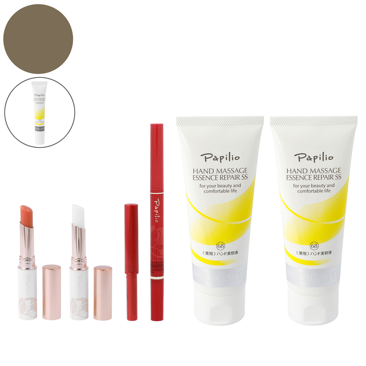 <ハンドマッサージエッセンスリペアSS> ■医薬部外品(肌あれ。あれ性。あせも・しもやけ・ひび・あかぎれ・にきびを防ぐ。油性肌。かみそりまけを防ぐ。日やけ・雪やけ後のほてりを防ぐ。肌をひきしめる。肌を清浄にする。肌を整える。皮膚をすこやかに保つ。皮膚にうるおいを与える。皮膚を保護する。皮膚の乾燥を防ぐ) [使用方法] <パピリオ ステイブロウG> ・キャップは回転式になっております。キャップをクルクルと回して開けてください ・芯は1mm程度出してご使用ください(柔らかめの芯なので、出しすぎると芯が折れることがあります) ・描いた後にぼかし用ブラシで整えると、自然な眉に仕上がります <パピリオトリートメントリップエッセンスEX> スティックを唇に当て、口紅を塗るように塗布してください <ハンドマッサージエッセンスリペアSS> 手を洗った後(水仕事後)、入浴後など、随時使用可。1日1回は軽くマッサージすることをお勧めします 【日本製】 [注意事項] <パピリオ ステイブロウG> ※お肌に異常が生じていないかよく注意してご使用ください ※傷・はれもの・しっしん・かぶれ・ただれなどの症状があるときにはお使いにならないでください ※使用中や使用後の赤み・はれ・かゆみ・刺激・色抜け(白斑等)や黒ずみなどの異常があらわれた場合、また、使用したお肌に直射日光があたってそのような症状があらわれ場合は使用をやめ、皮ふ科専門医などにご相談ください。そのまま使用を続けますと症状を悪化させることがあります ※目に入ったときは、こすらずに、すぐに水かぬるま湯で洗い流してください ※高温や直射日光を避け、乳幼児の手の届かないところに置いてください ※ご使用後は必ずキャップをきちんと閉めてください ※衣類などにつくと落ちないことがありますので、ご注意ください ※ご使用後は芯をもとに戻し、必ずキャップを閉めてください。キャップを閉めずにおくと、芯が硬くなり、描けなくなります [セット内容] ・パピリオ ベストセラーネット限定特別セット ・パピリオハンドマッサージエッセンスリペアSS ミニ20g(プレゼント) <パピリオトリートメントリップエッセンスEX> ※唇に異常があるとき、または、あらわれたときは、ご使用をおやめください ※ご使用後はキャップをきちんとしめてください ※高温や直射日光を避け、乳幼児の手の届かないところに置いてください ※製品特性上、まれに表面が部分的に赤くなることがありますが、品質に問題はありません [成分] ステイブロウG: <ライトブラウン・チャコールブラウン共通> シクロペンタシロキサン、トリフルオロアルキルジメチルトリメチルシロキシケイ酸、トリメチルシロキシケイ酸、ポリエチレン、キャンデリラロウ、(アクリレーツ/アクリル酸ステアリル/メタクリル酸ジメチコン)コポリマー、トリ(カプリル酸/カプリン酸/ミリスチン酸/ステアリン酸)グリセリル、シリカ、アルミナ、エチルヘキサン酸セチル、カルナウバロウ、シメチコン、ジメチコン、酸化チタン、マイカ、酸化鉄 トリートメントリップエッセンスEX: <レッド系>スクワラン、リンゴ酸ジイソステアリル、(イソステアリン酸ポリグリセリル-2/ダイマージリノール酸)コポリマー、ダイマージリノール酸(フィトステリル/イソステアリル/セチル/ステアリル/ベヘニル)、イソノナン酸イソトリデシル、水添ポリイソブテン、トリ(カプリル酸/カプリン酸)グリセリル、 ラウロイルグルタミン酸ジ(フィトステリル/オクチルドデシル)、ポリエチレン、パラフィン、ダイマージリノール酸ジ(イソステアリル/フィトステリル)、マイクロクリスタリンワックス、アテロコラーゲン、アルニカ花エキス、オトギリソウ花/葉/茎エキス、カミツレ花エキス、カンゾウ根エキス、グリチルレチン酸ステアリル、コンドロイチン硫酸Na、スギナエキス、 セージ葉エキス、セイヨウノコギリソウエキス、セラミドNP、ゼニアオイ花エキス、ソメイヨシノ葉エキス、トウキンセンカ花エキス、フユボダイジュ花エキス、ローズマリーエキス、他 ハンドマッサージエッセンスリペアSS: 有効成分:グリチルレチン酸ステアリル、酢酸DL-αートコフェロール その他の成分:精製水、濃グリセリン、1,3-ブチレングリコール、白色ワセリン、セタノール、無水エタノール、ベヘニルアルコール、パルミチン酸イソプロピル、ポリ(オキシエチレン・オキシプロピレン)メチルポリシロキサン共重合体、カルボキシビニルポリマー、他