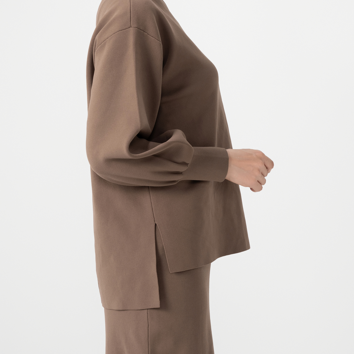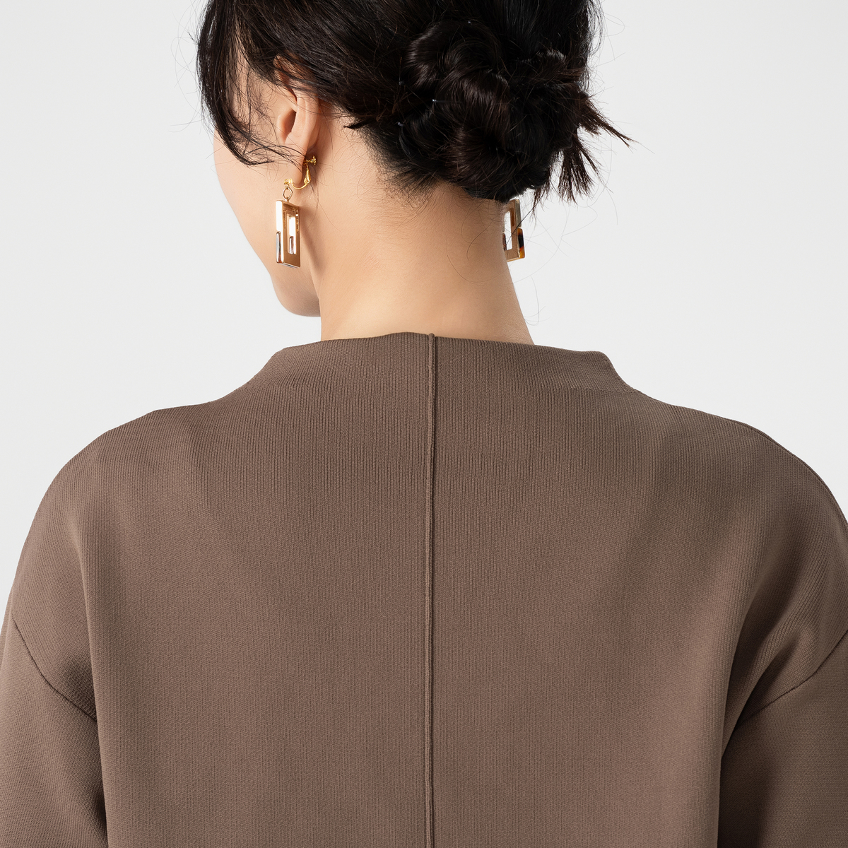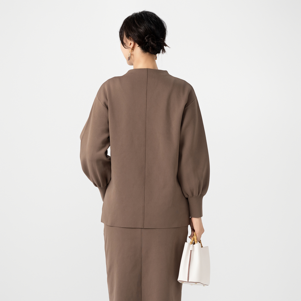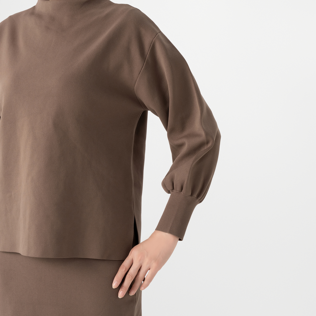 程よい高さのボトルネックとふんわりギャザー袖が特徴のニットプルオーバーです。後ろ身頃のシームレスタックが縦長効果を生み、すっきりとした印象に。裾スリット入りで一枚着でもインナーとしても使いやすいデザインです