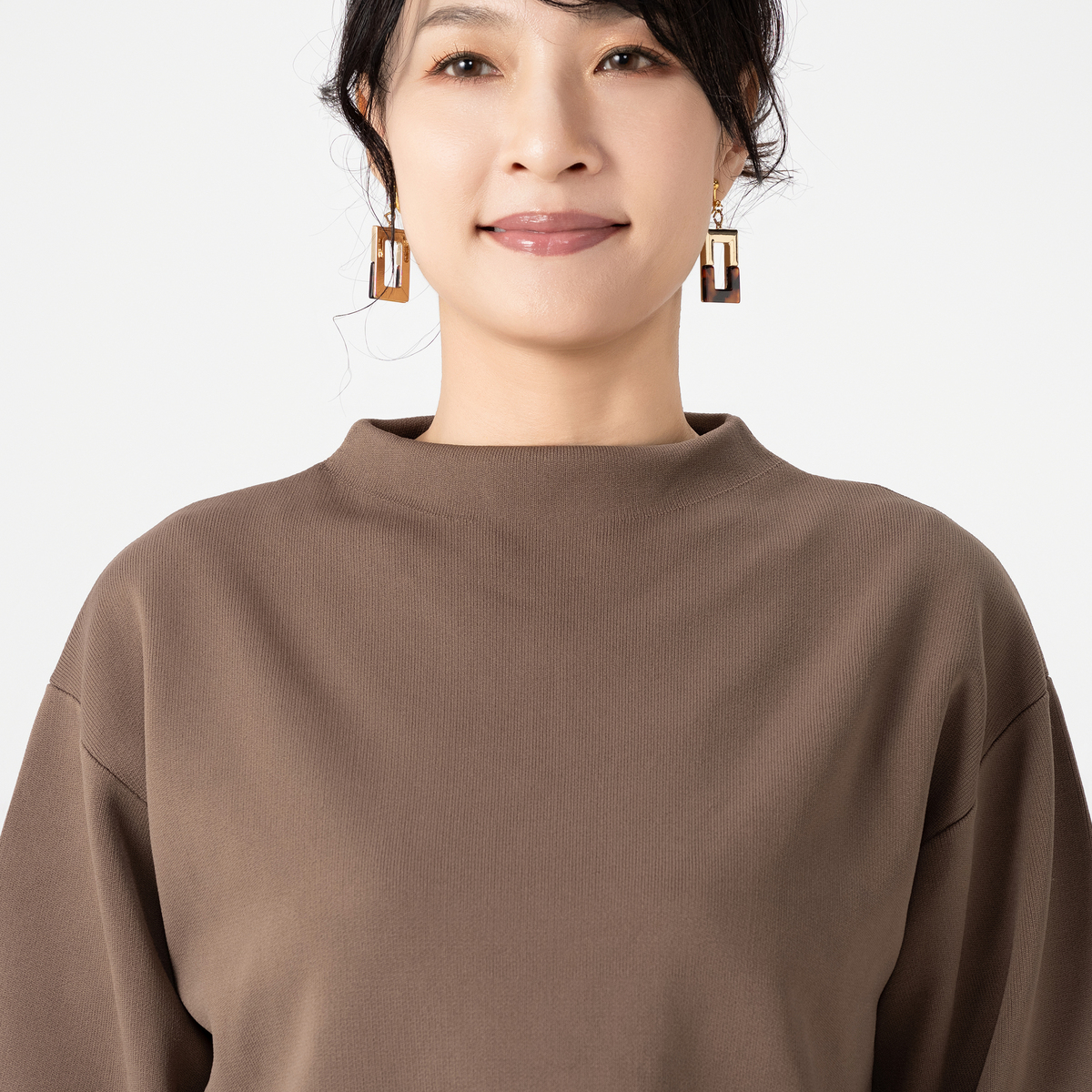 ストレッチ性がありながら、ソフトな風合いのポリエステル糸を使用し、ふんわりとした膨らみ感も。薄手ながら程よいハリがありシルエットが崩れにくい素材です。スムース編みで体のラインを拾いにくく、ロングシーズン活躍します