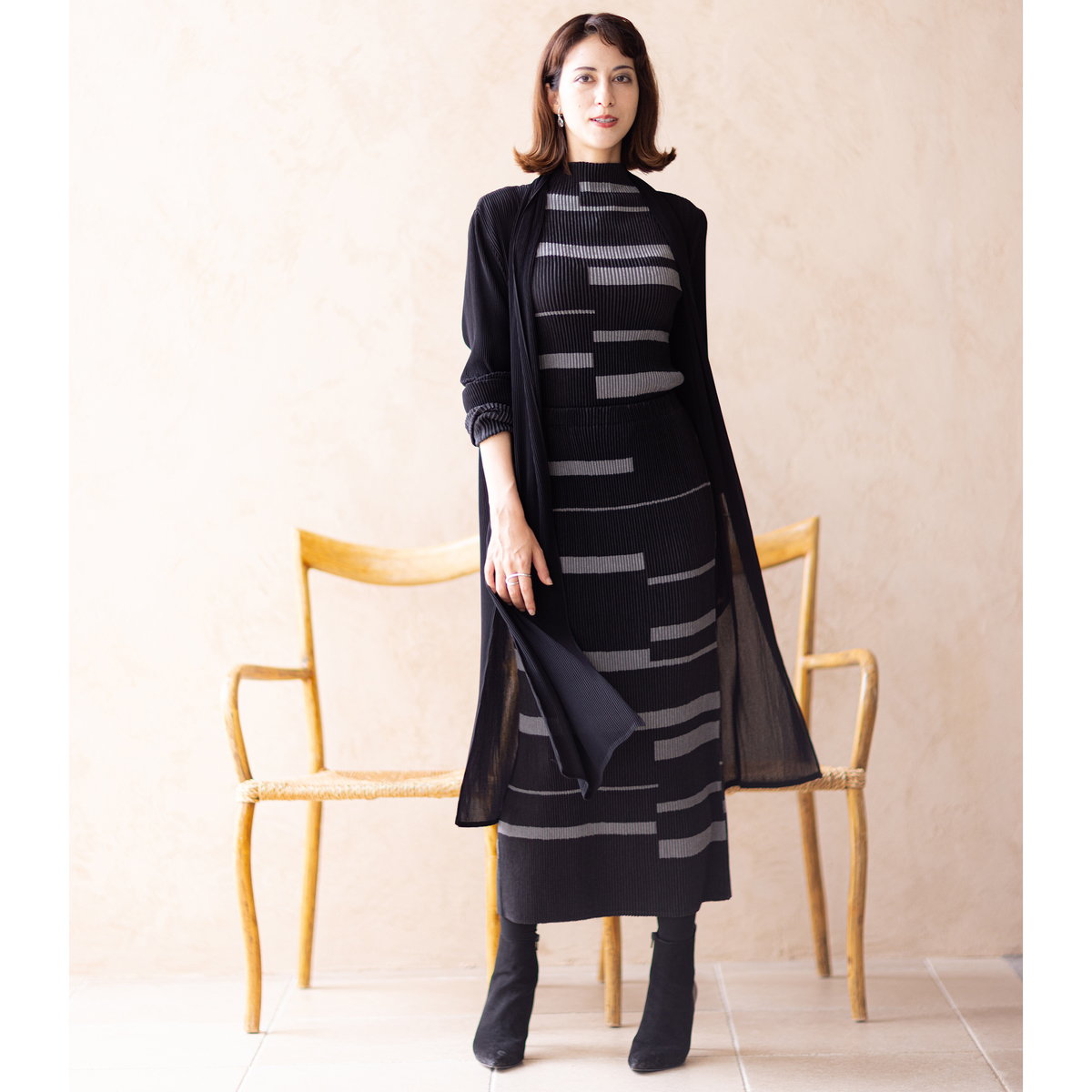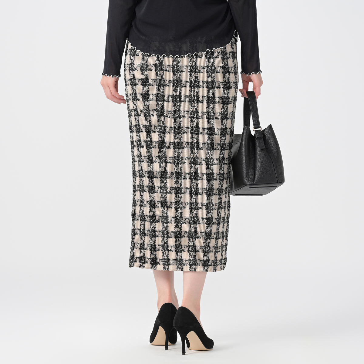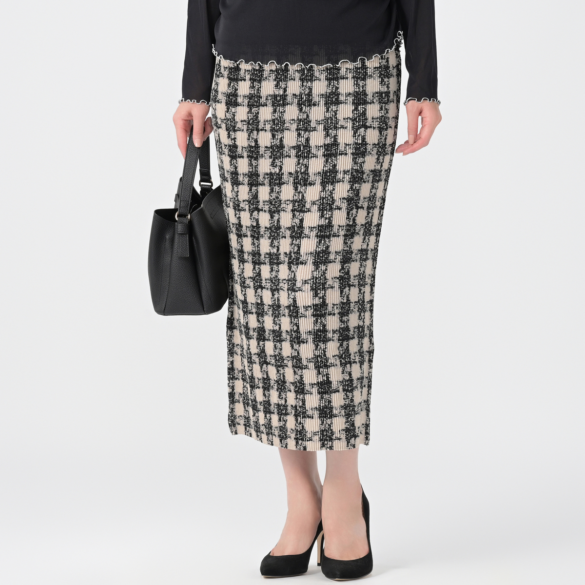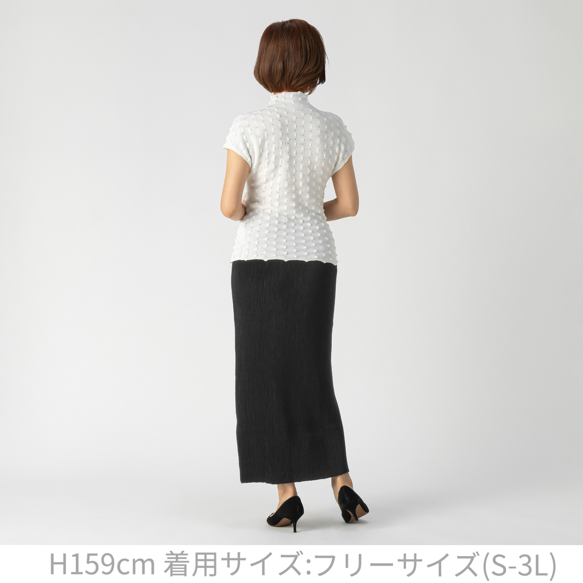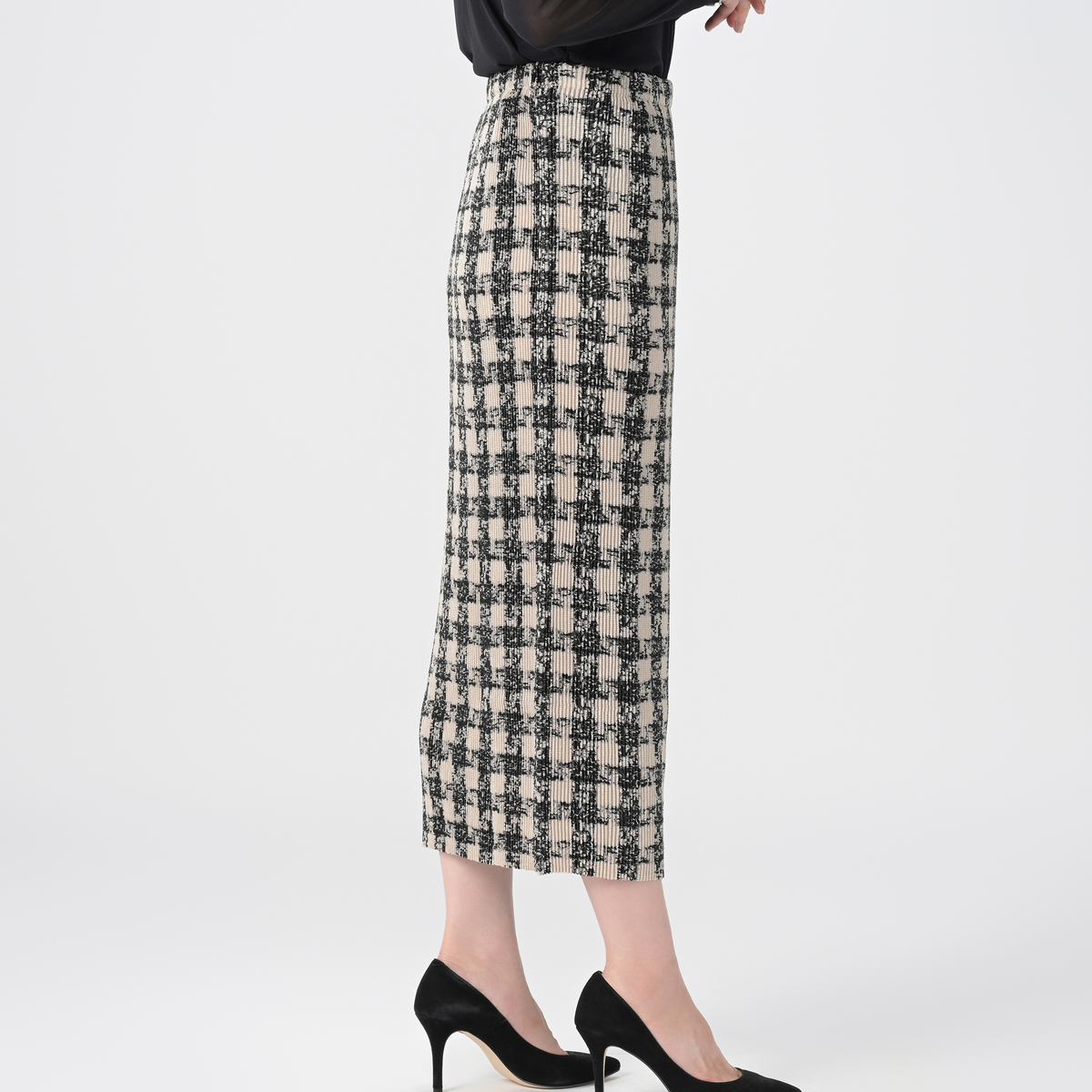 ウエストは幅広ゴム仕様で 腰まわりのフィット感を高め、トップスインしたときには脚長見せ効果にも期待できます。体型を拾いにくい綺麗なシルエットはタイトになりすぎず、ヒップ下から自然に落ちるようなパターンにこだわりました。スリットがなくても楽な着用感で、シャトルプリーツの伸縮性により座ったり、しゃがんだり、階段の昇り降りも楽々。正座もできるので、和室などの会席やお呼ばれにも重宝します