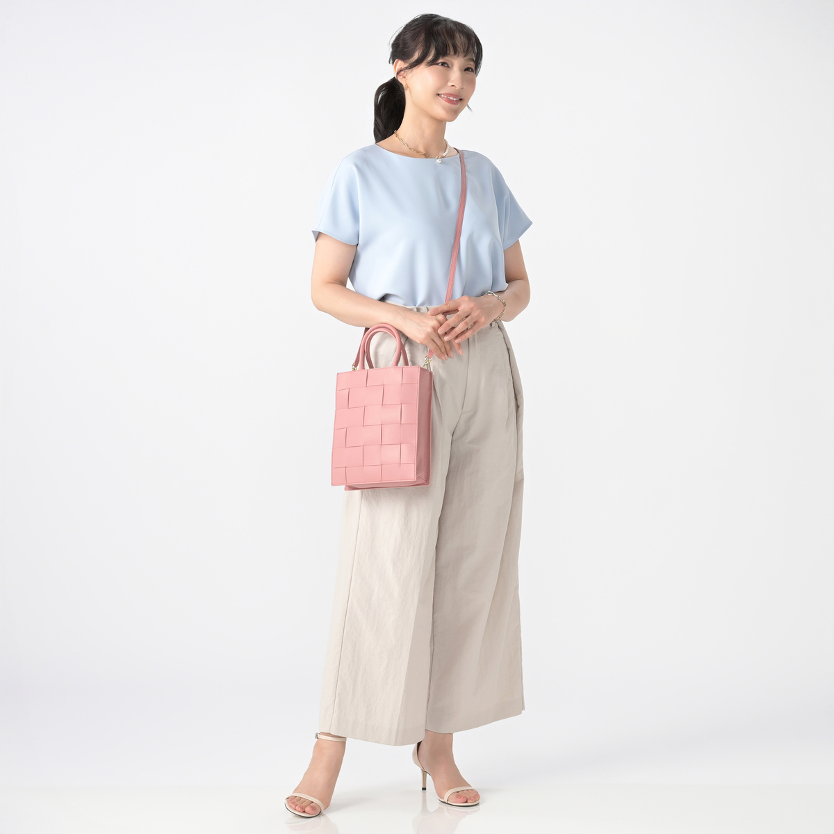 幅約4cmと太幅のメッシュデザインが特徴の2WAYバッグ。発色が良く柔らかな質感のイタリア製羊革を使い、手編みで丁寧に編み込みました。モードな雰囲気のあるスクエア型で、持つだけでおしゃれ見えします