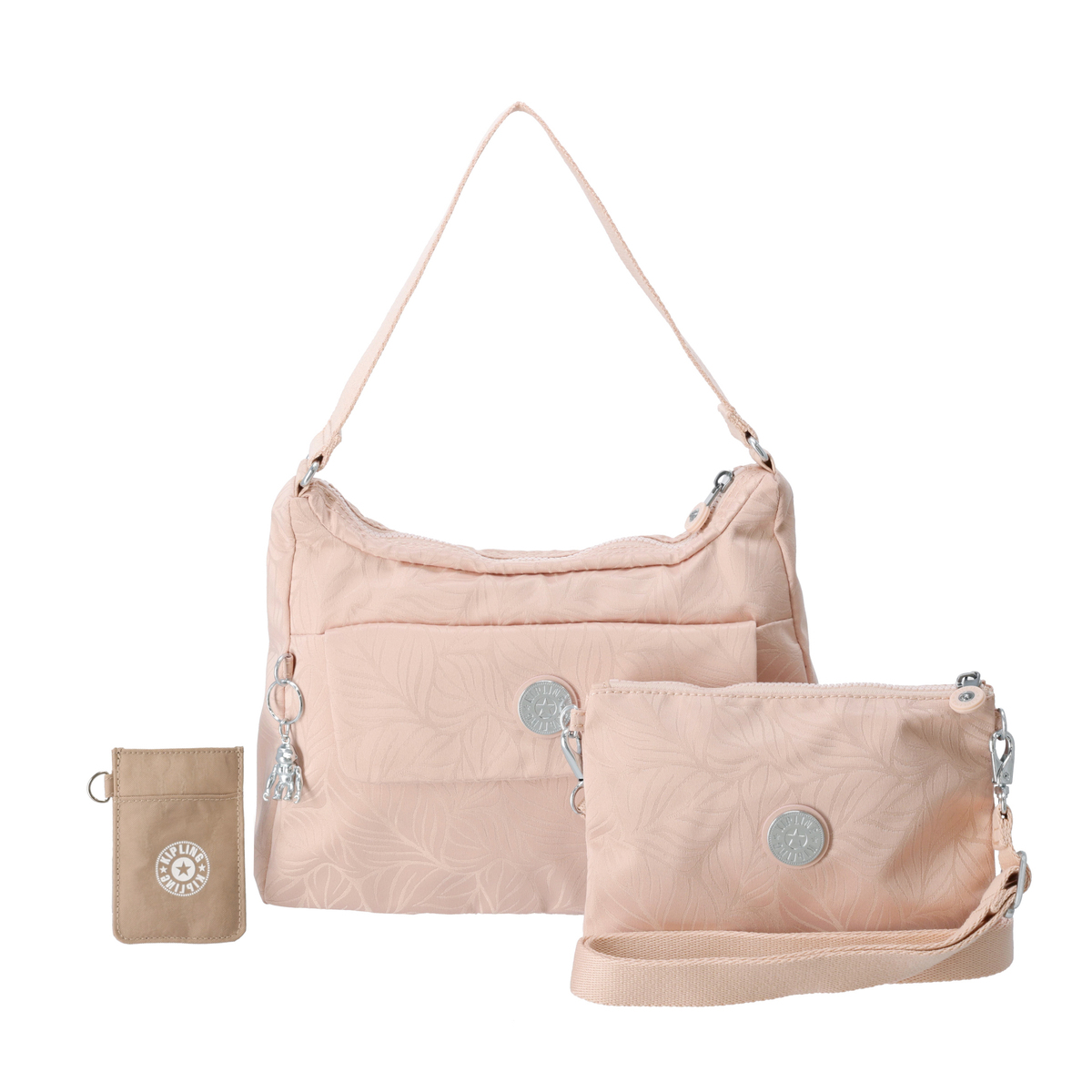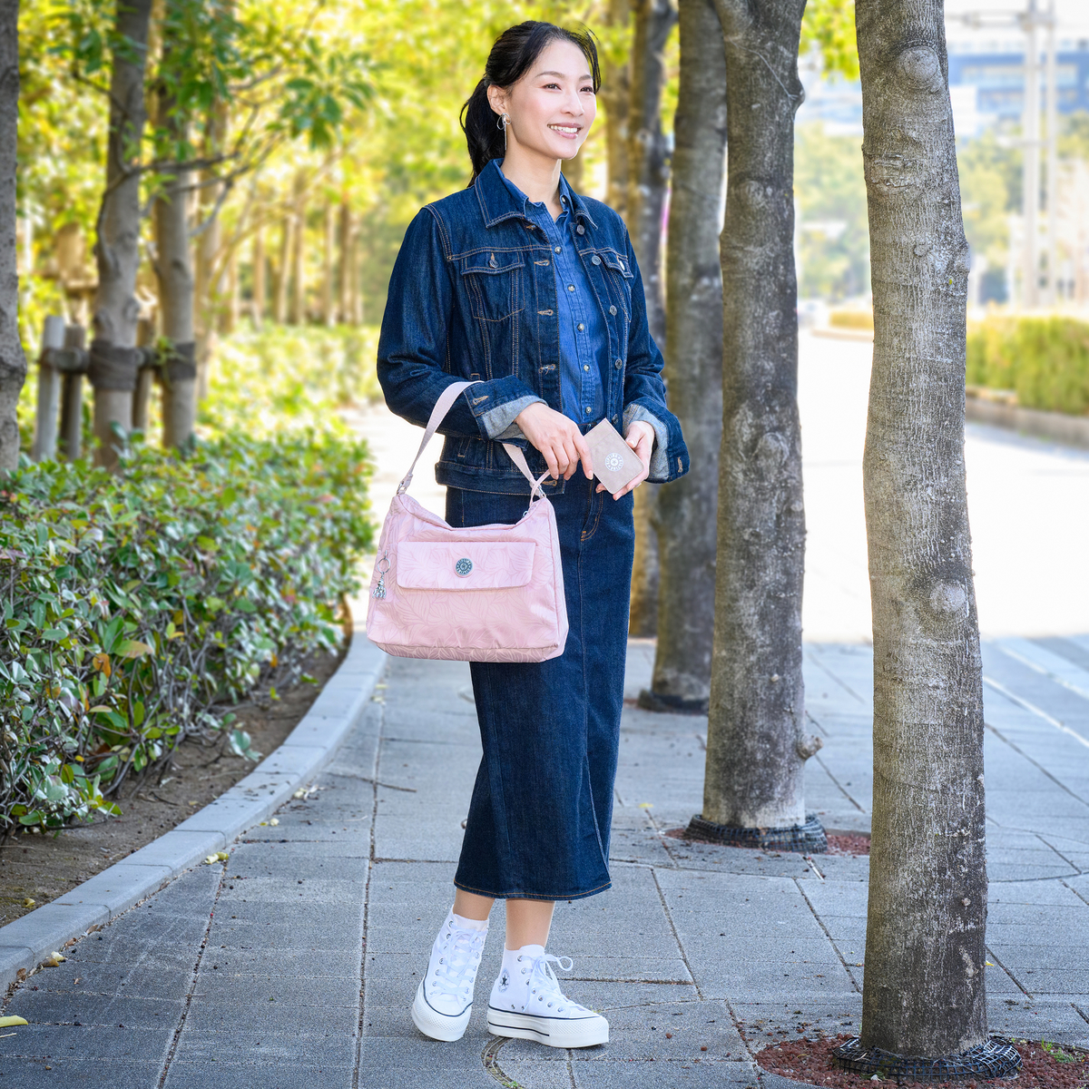 <バッグ> [サイズ(約)] 縦23.5×横32×マチ7.5cm ハンドル立上り:27cm ショルダー立上り:50〜90cm [重量] 約420g(付属品含む) [仕様] 付属(取り外し可):チャーム×1、ショルダーベルト×1 開閉:ファスナー式 底ビョウ:無 [ポケット] 内側:ファスナーポケット×1、オープンポケット×1、ペン挿し×2、キーフック×1 外側前面:フラップマグネットポケット×1 外側背面:ファスナーポケット×1 <ポーチ> [サイズ(約)] 縦15.5×横21.5×マチ1cm [重量]約60g <ポーチ> [仕様] 開閉:ファスナー式 [ポケット]無 <バッグ・ポーチ> [素材] <表地> ブラックエンボス、グリーンモス、ブルーストライプ、ベージュチェッカー:ナイロン ブルーリーフジャカード、ピンクリーフジャカード:ポリエステル ※裏地有 【インドネシア製】 <カードケース> [サイズ(約)] 縦10.5×横7.5×厚み0.5cm [重量]約20g <カードケース> [仕様] 開閉:オープン式 [ポケット] 内側:オープンポケット×1 外側:オープンポケット×3 [素材]ナイロン ※裏地有 【中国製】 [注意事項] ※直射日光や蛍光灯の影響で変色することがありますのでご了承下さい