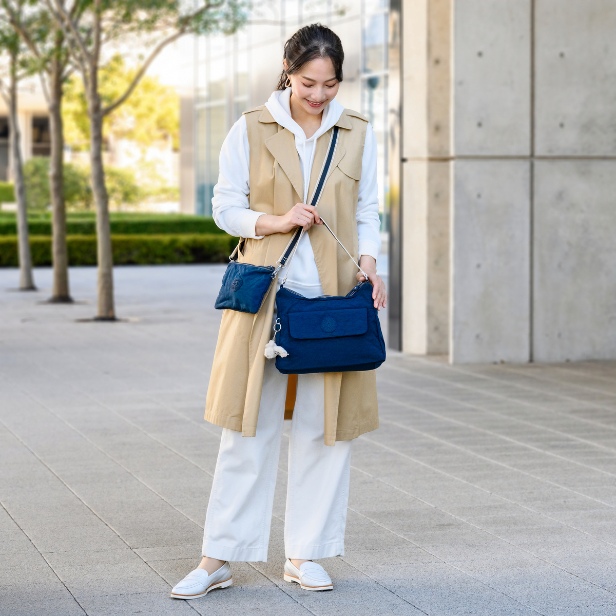 ベージュチェッカーが春らしくて可愛いと思い久しぶりにキプリングを購入。 皆さんと同じくベルトの付け替えが出来ないのは不便だなと思いましたが、最初にちょっと頑張って長い方のベルトを付けてしまって、そのまま(2本のベルトが付いたまま)毎日使っています。 その時々でショルダーにも斜めがけにも出来て便利ですし、意外と邪魔にならずチェックのベルトがかえってオシャレに見えます。 今はまだ寒くて冬服を着ていてもこれを持つだけでちょっと春めきます♪ デイリーユースにも旅行にも愛用しますね!