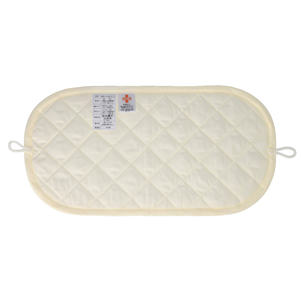 中わたに東洋紡のエスメーロを使用することで、繊維上の菌の増殖を抑制する機能があり、制菌加工「SEK」マークも取得しています(全ての菌に効果があるわけではありません)