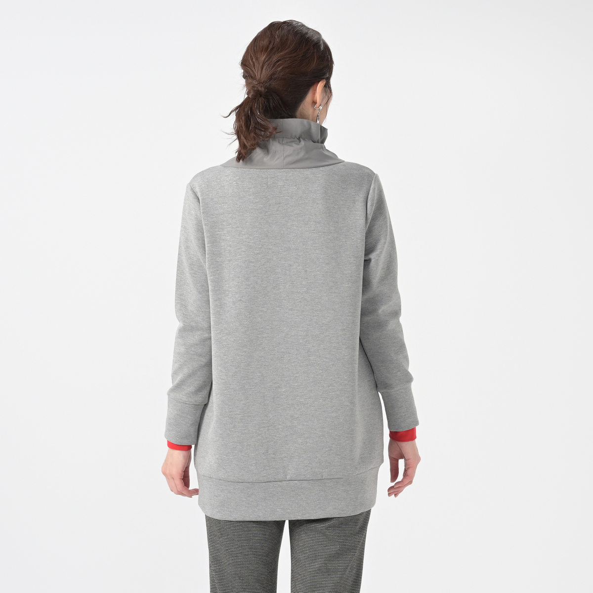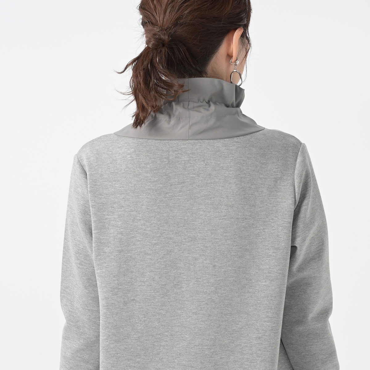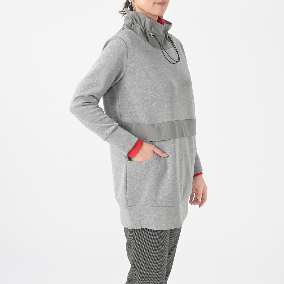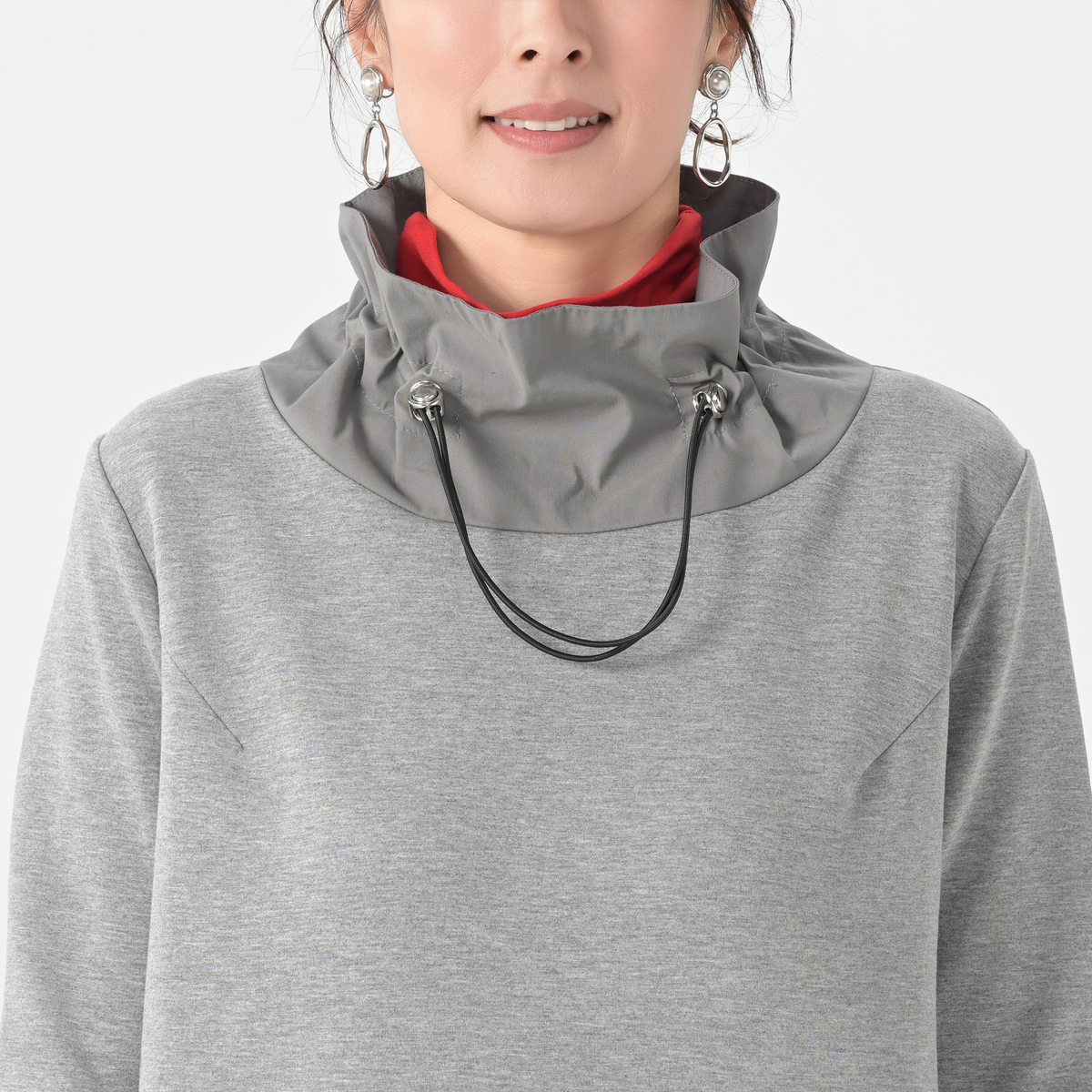 素材のコントラストで洗練されたコーデを叶えるチュニック。異素材使いの衿はドロストで表情を変えられ、ギャザーを寄せると華やかな印象に。ドロストのゴムとストッパーがアクセサリーのようなアクセントになるデザインです。前腰にはポケットを付けました