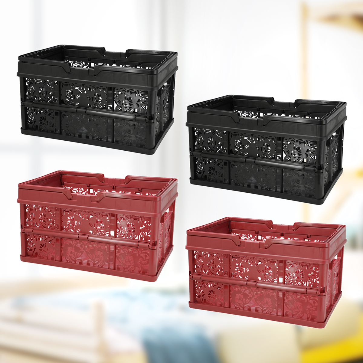 簡単に組み立てられる(*1)、折り畳み式のコンテナです。持ち運びに便利な取っ手付き。使わないときは折り畳んでコンパクトに収納できます(*2)。厚みのある合成樹脂素材を使用しているため丈夫。側面はお洒落な花柄です