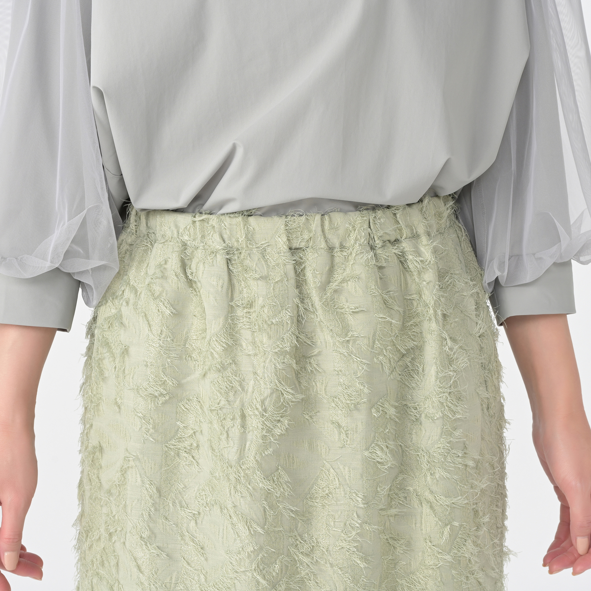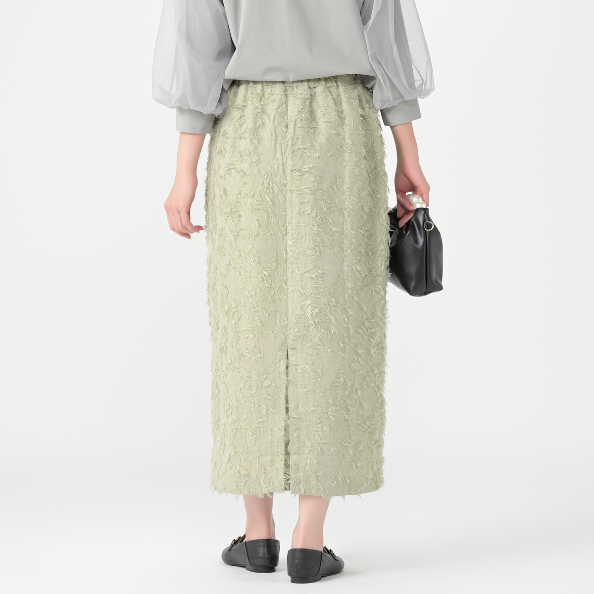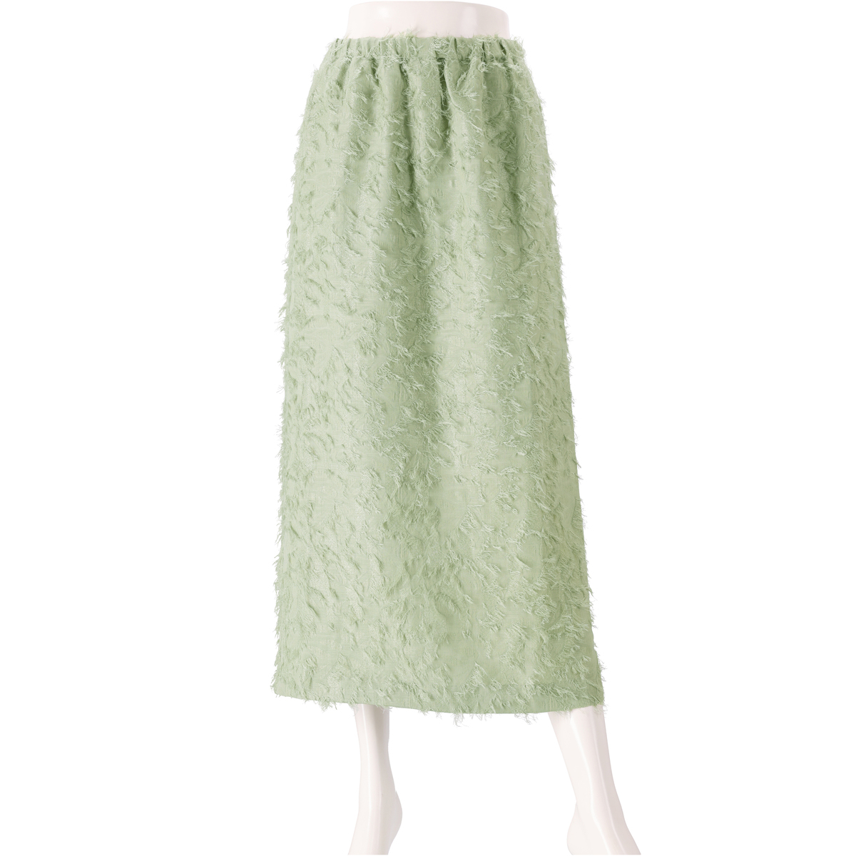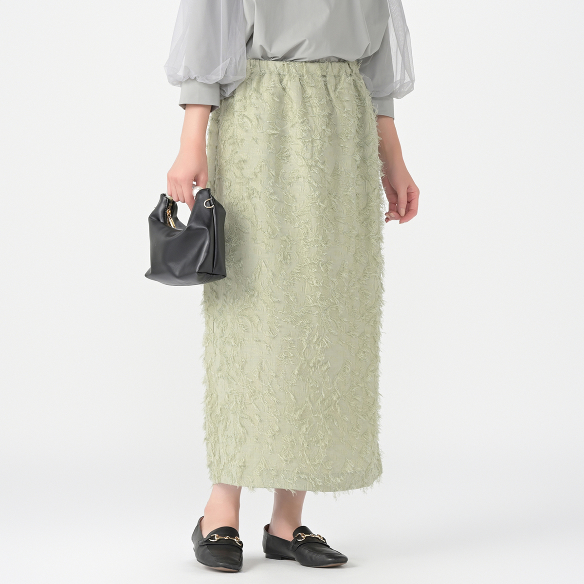 年齢や体型を気にせず元気のあるオシャレを楽しむことをコンセプトにしたブランド「Notice//colors」。ご紹介するのは、スッキリ細見えするペンシルラインのスカートです。フリンジのように長く残した糸が特徴的な、ポリエステルのカットジャガード素材を使用しました