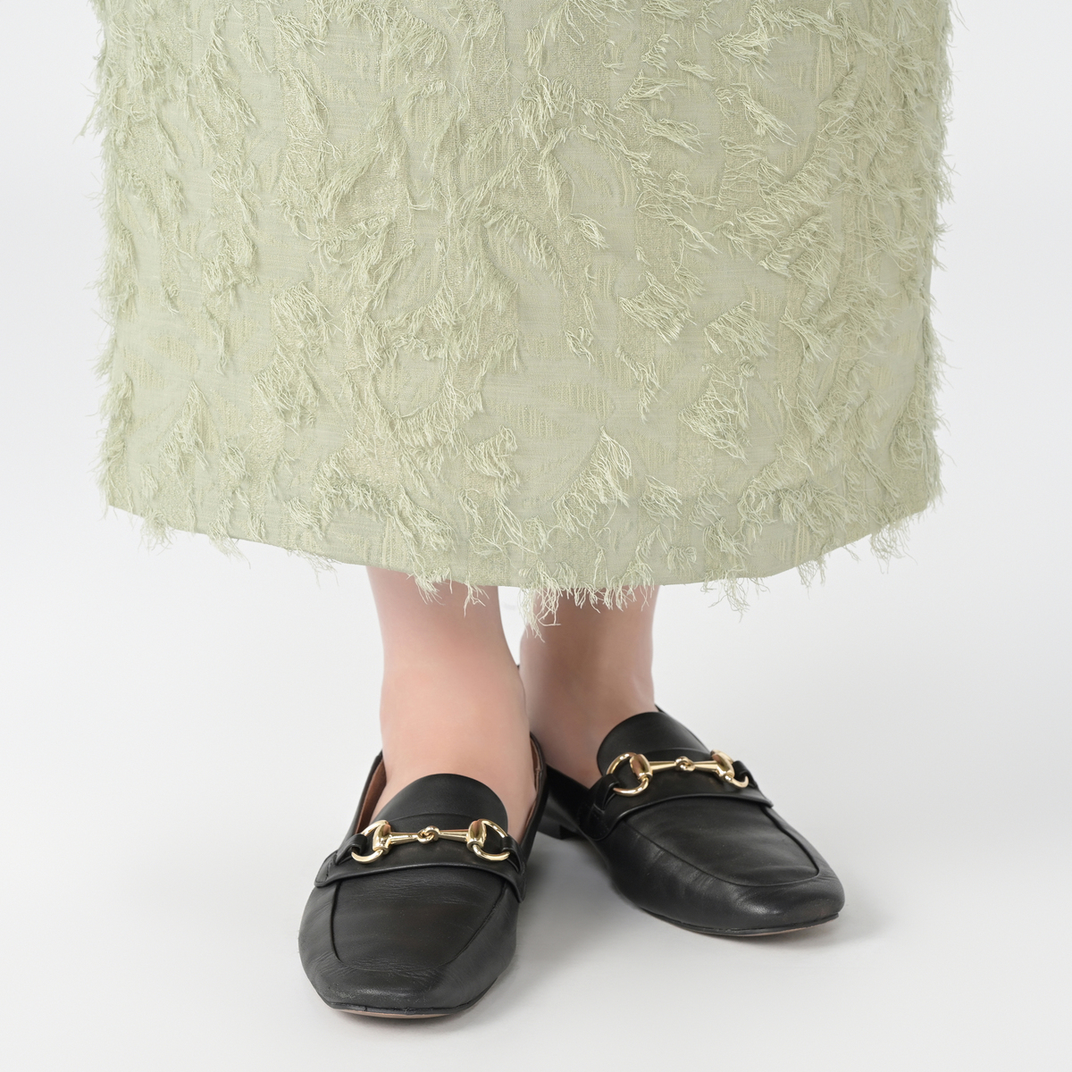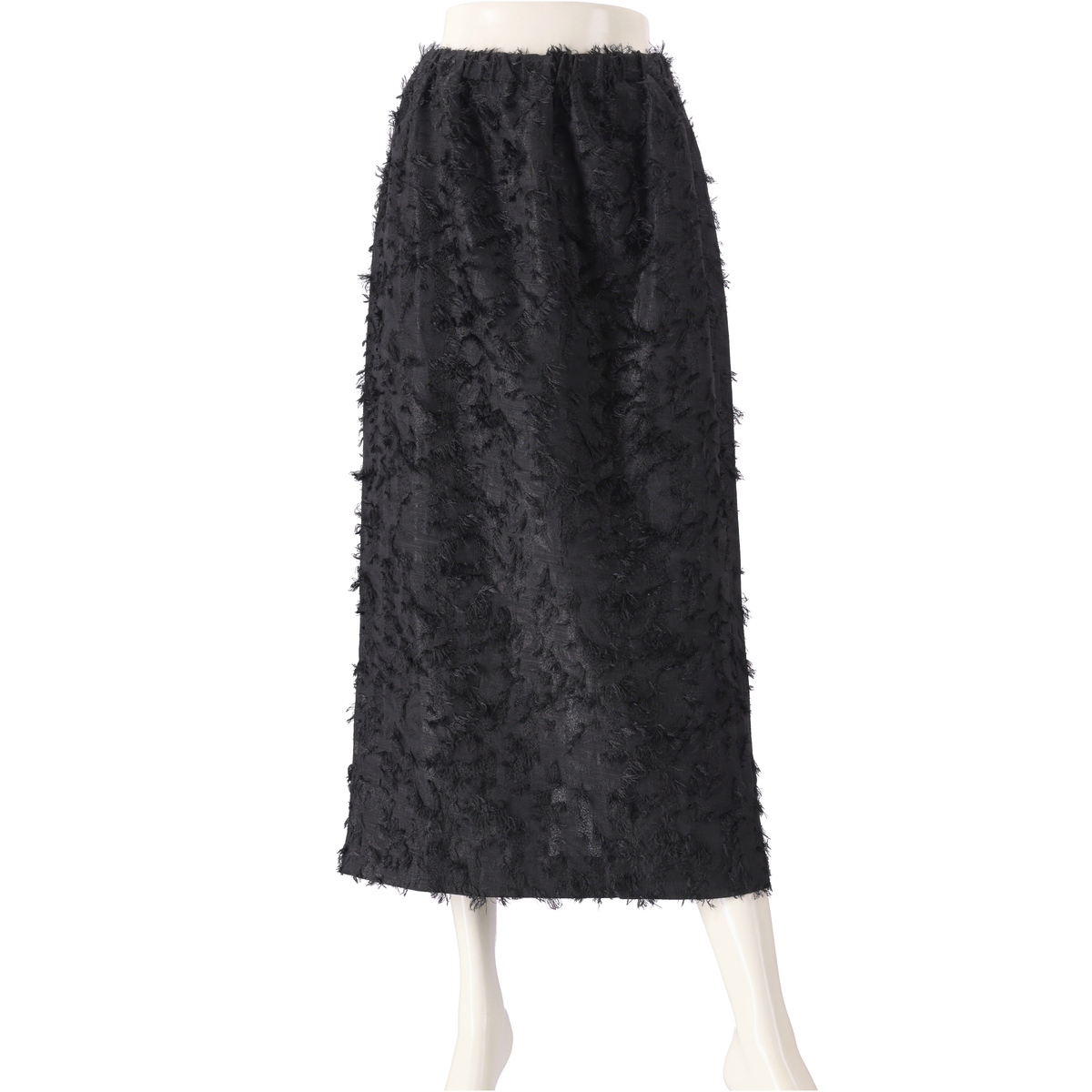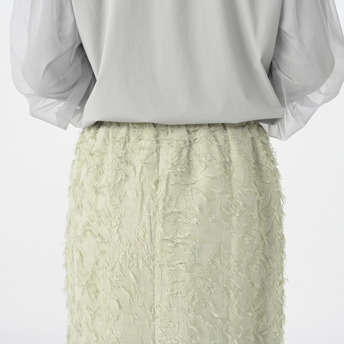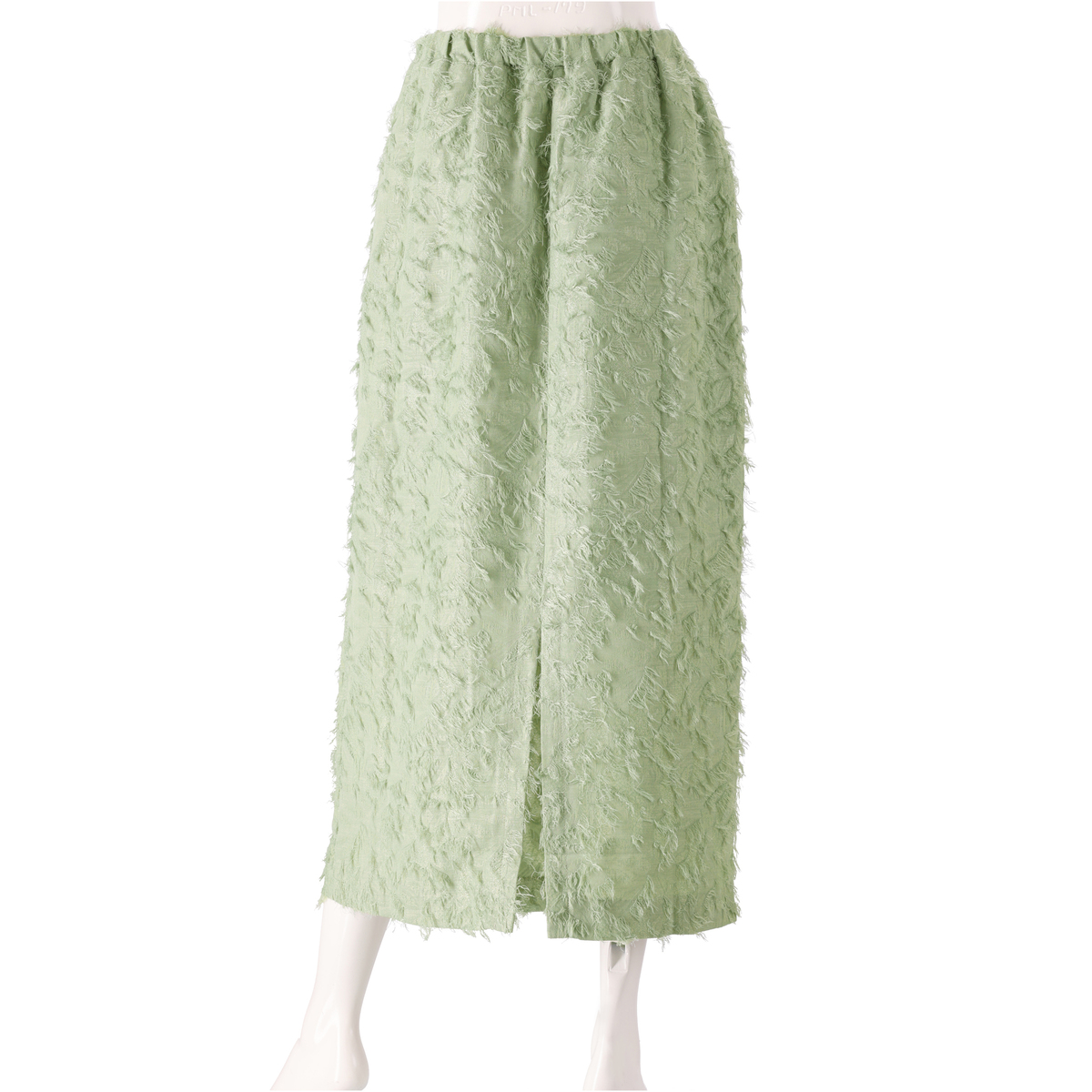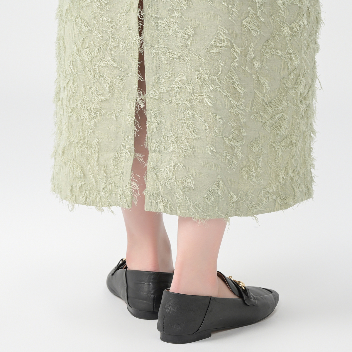 年齢や体型を気にせず元気のあるオシャレを楽しむことをコンセプトにしたブランド「Notice//colors」。ご紹介するのは、スッキリ細見えするペンシルラインのスカートです。フリンジのように長く残した糸が特徴的な、ポリエステルのカットジャガード素材を使用しました
