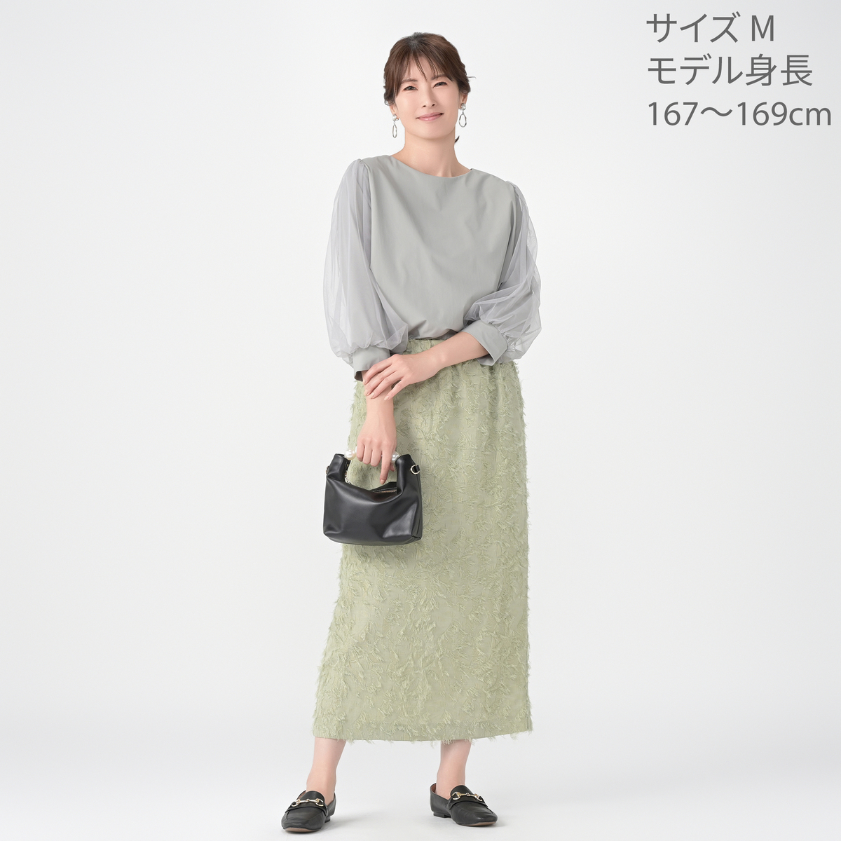 適度なゆとりのあるヒップから裾に向けて軽く絞りつつ、スリットで動きやすさにも配慮したペンシルライン。ウエストは総ゴムのプルオンタイプで、サイズをキープしながら、しなやかな生地で細見えを演出。ふんわりとした表情でセクシーになり過ぎず、カジュアルなアイテムとも合わせやすくなっています