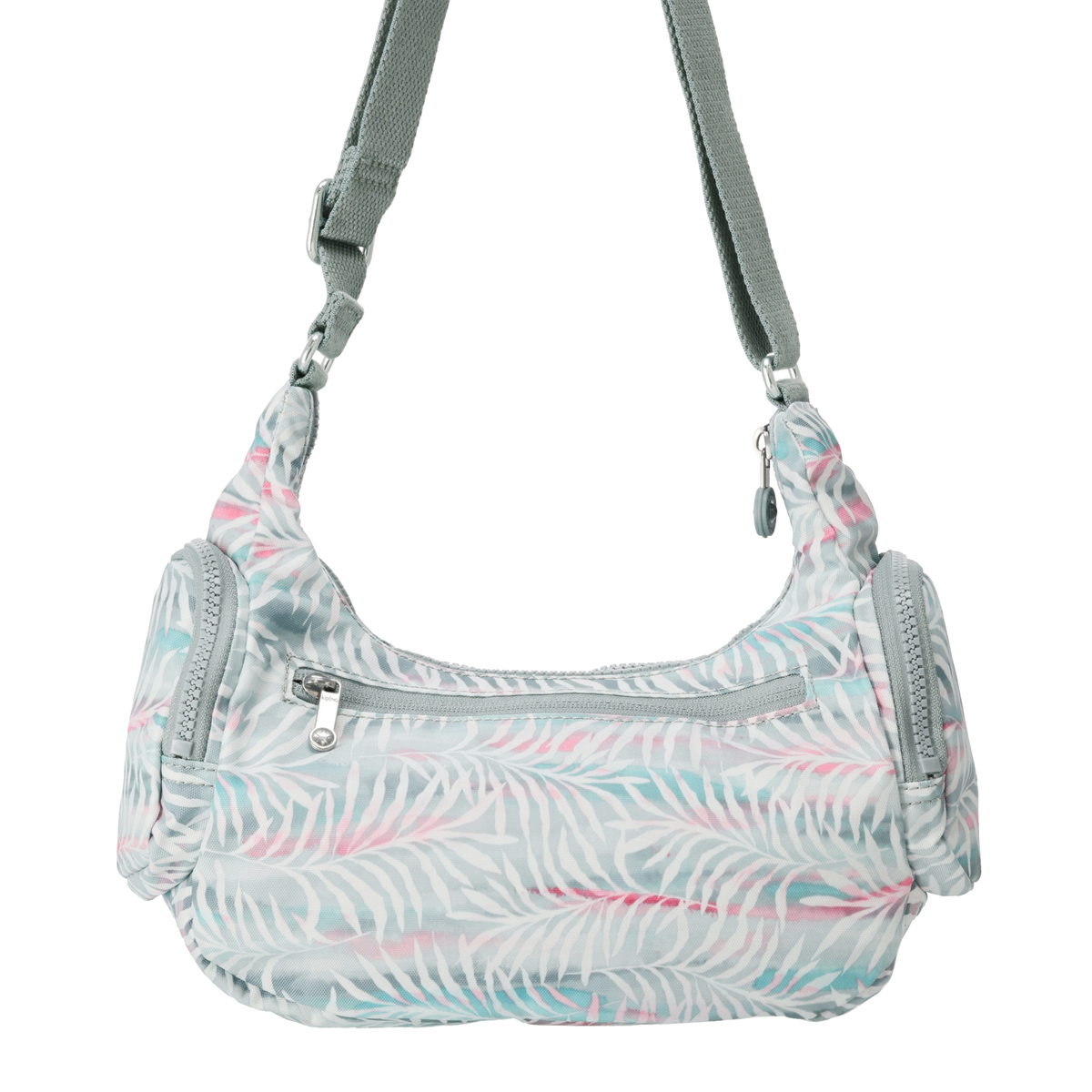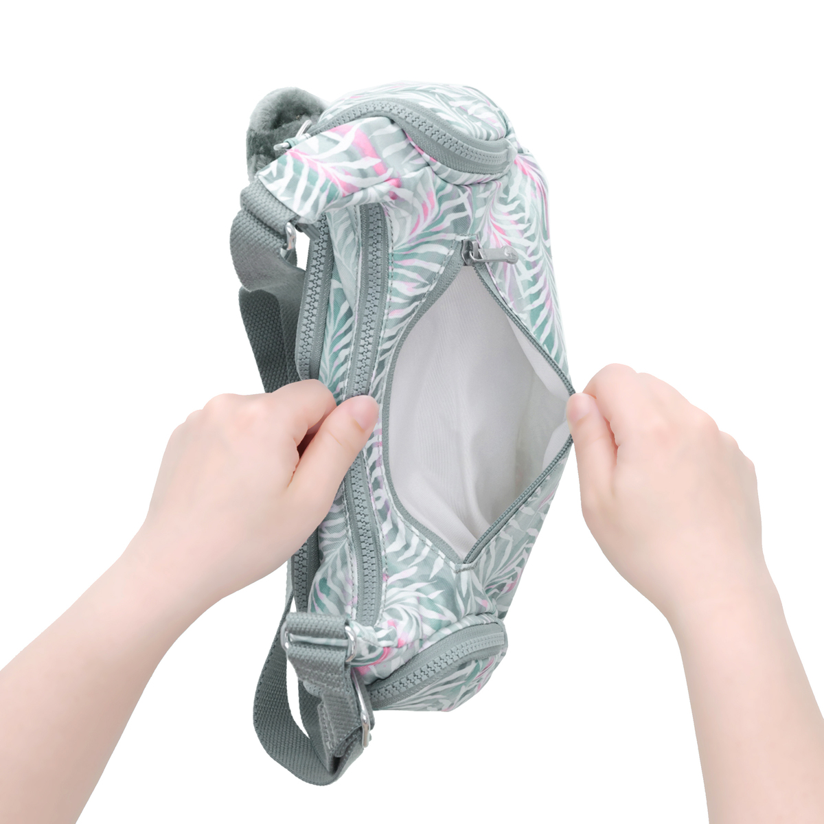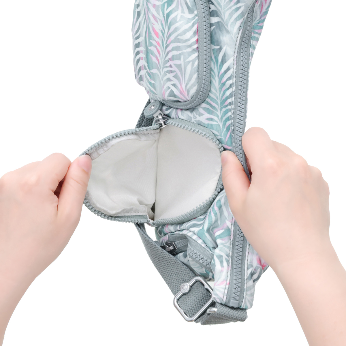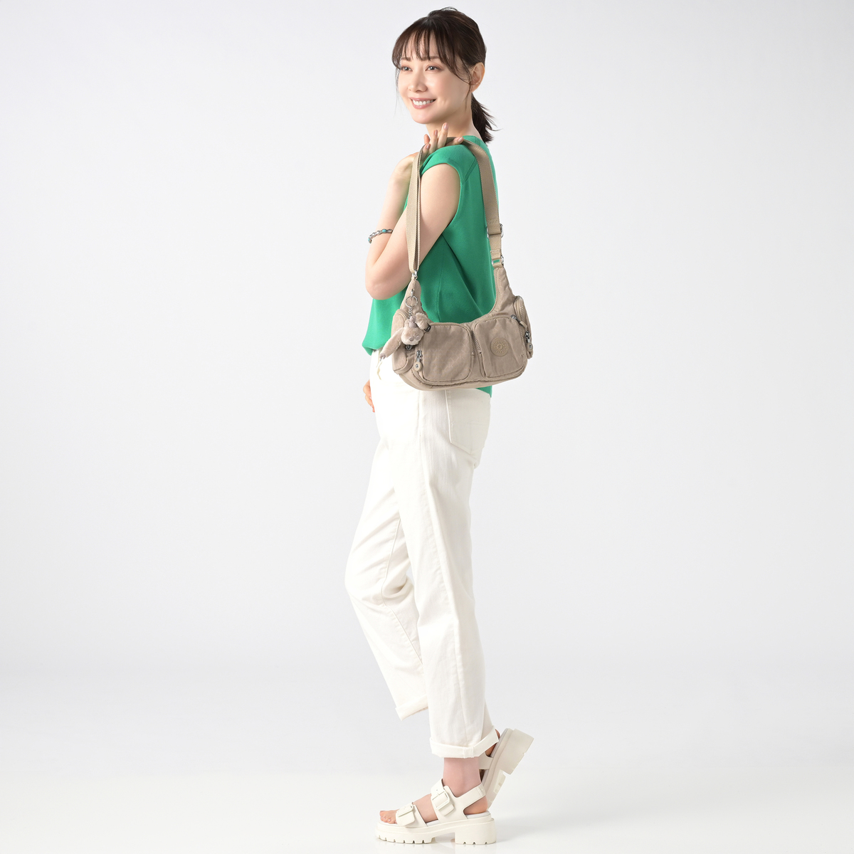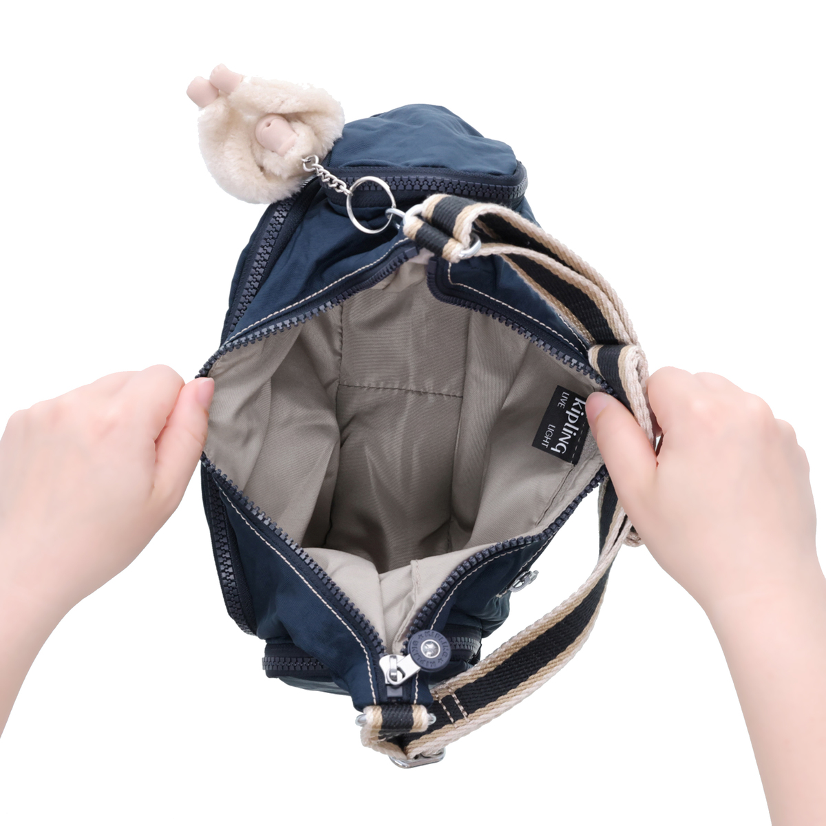 丸みのある三日月型のショルダーバッグです。斜め掛けした時に体に沿い、収まりの良い形状。大きく開く開口部のメインファスナーとマチ付きポケットで、荷物の出し入れもしやすく、コンパクトながら整理整頓して収納できます