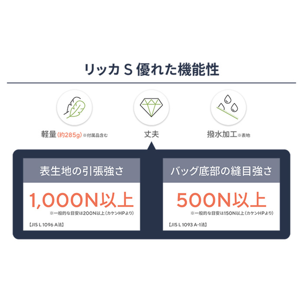 表地にははっ水加工を施しました。本体生地は、平織で織られ、糸の交差が多い織り方なので高い強度があり、また糸の密度が高いので、耐引裂・摩擦強度が高くなっています。底部の縫目強度は500N以上、また表生地の引張強さは1000N以上です