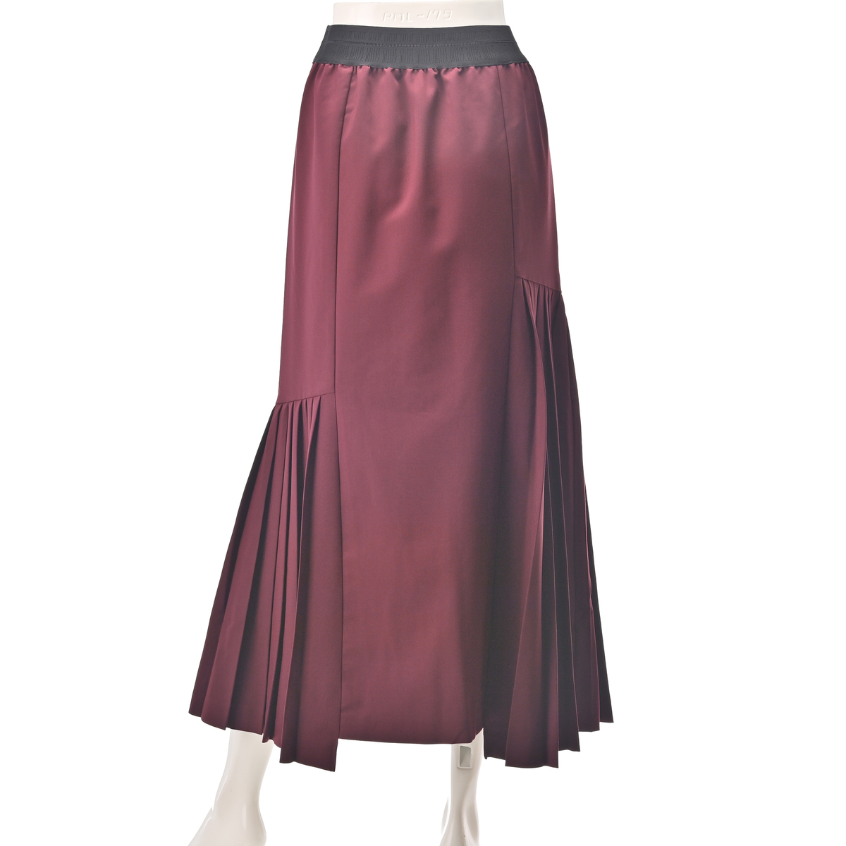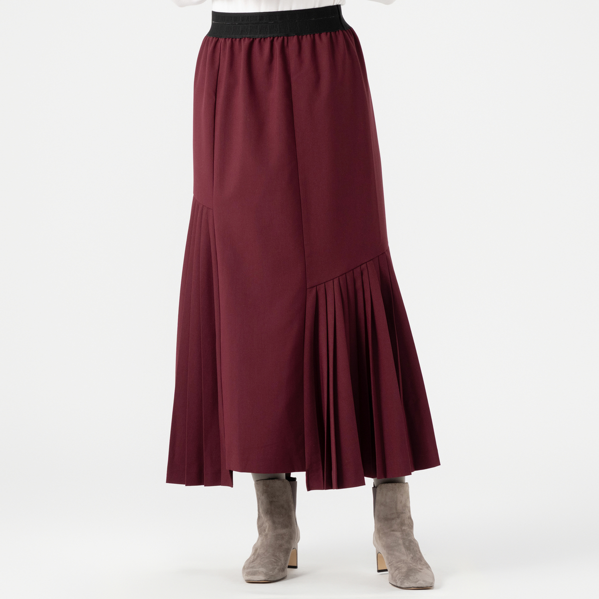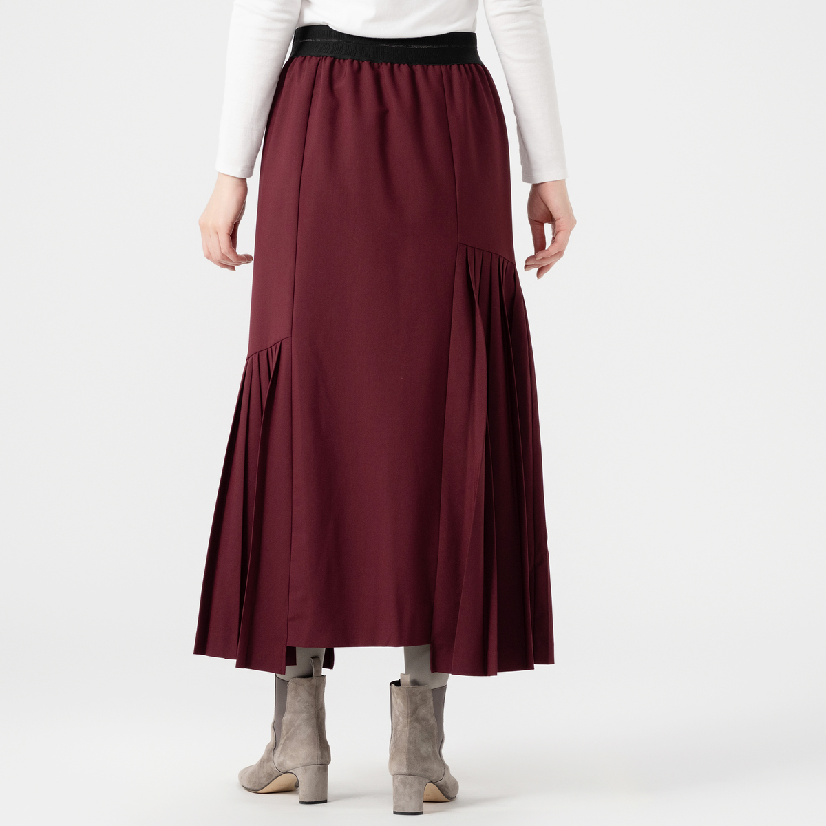 上品なフレアシルエットのスカート。腰周りはフラットにすっきりとさせ、両脇裾にプリーツを入れて変化をつけたデザインです。プリーツの太さもちょうどよく、縦のラインでの切り替えがシルエットをすっきりとみせ、幅にもこだわりました