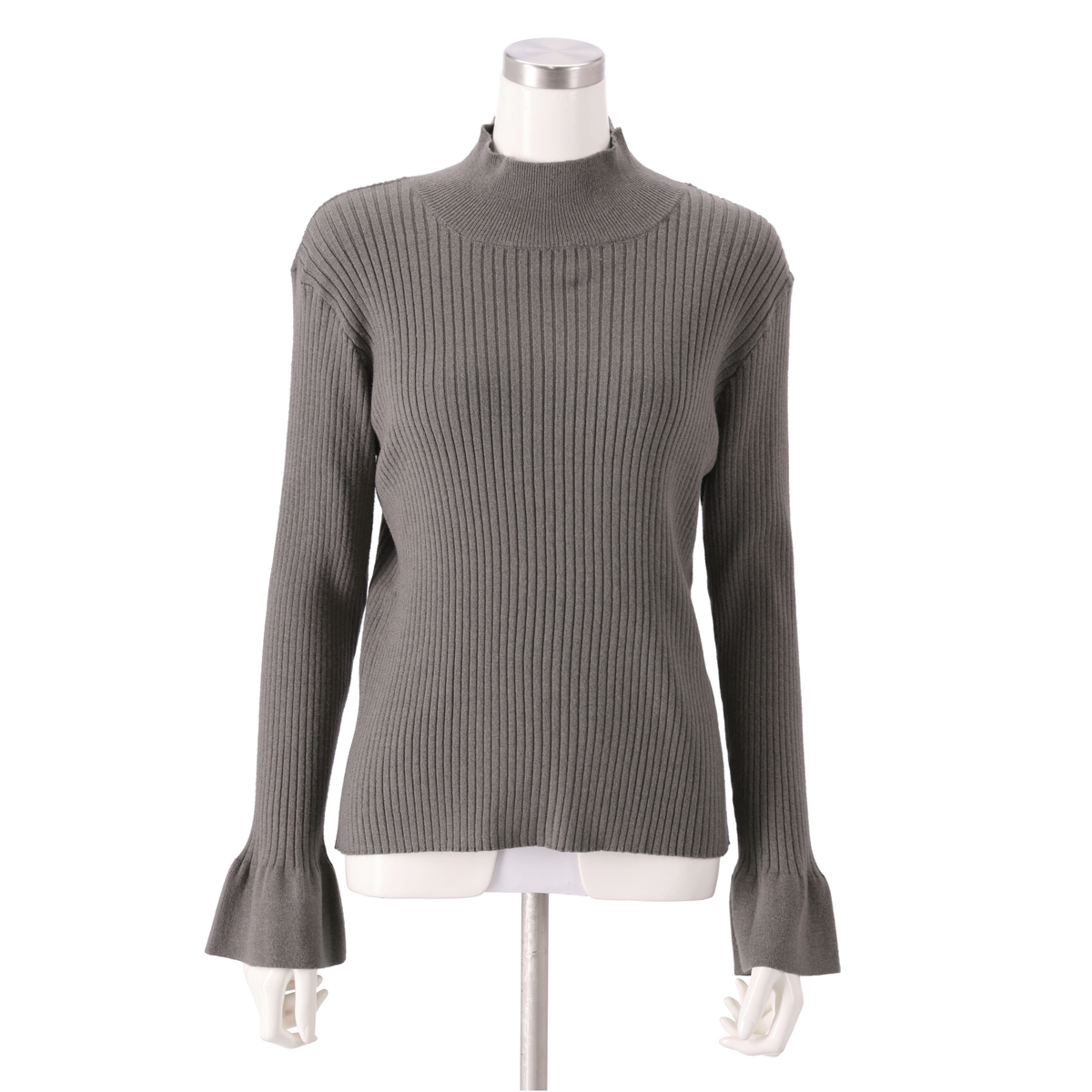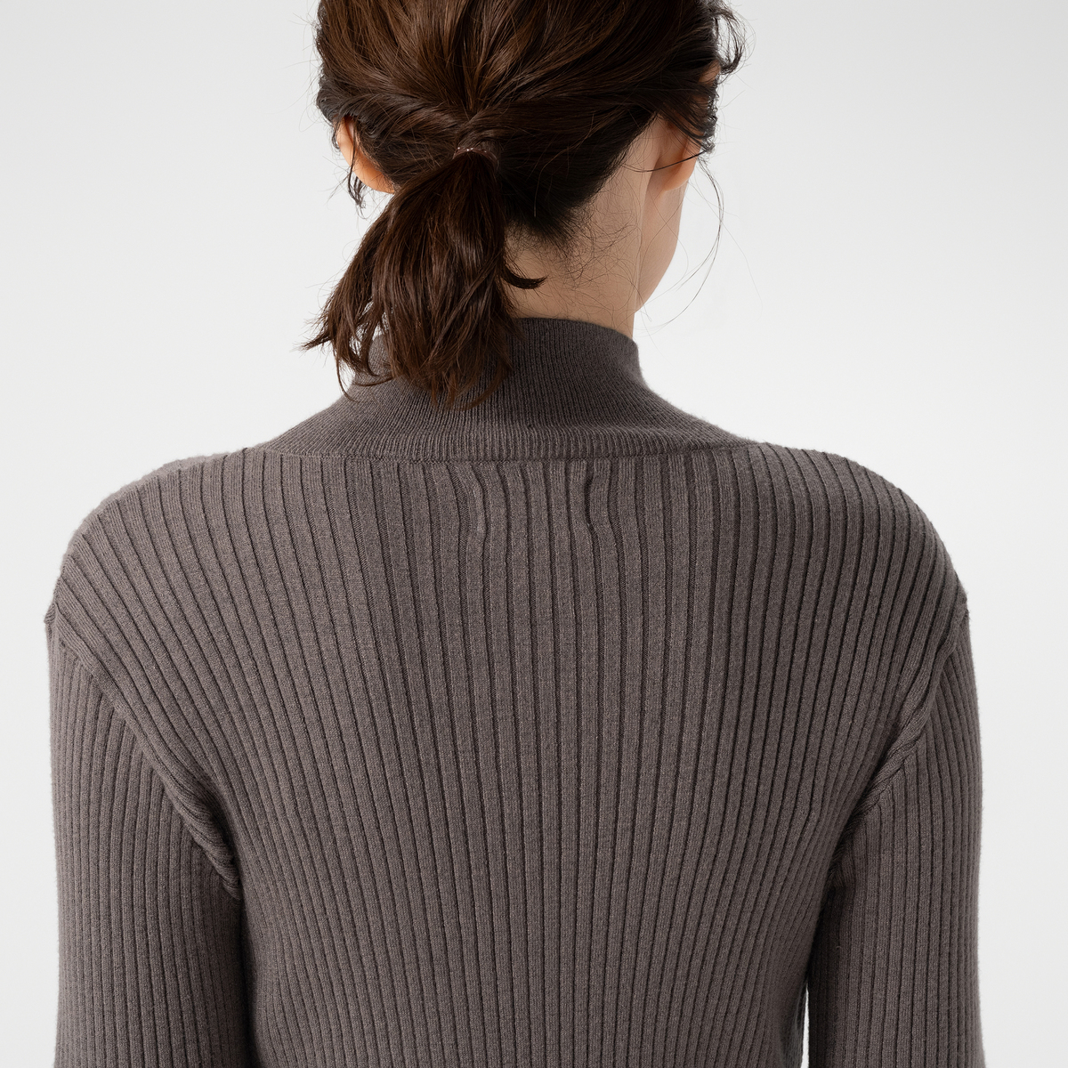 首まわりはシングルリブのハイネック。ハイネックジレと合わせて着用することで冷たい風を防ぎます。ふわっと広がるフレア袖は、総針仕立て。リブの特徴の伸縮性で着心地よく、薄すぎず程よい肉感の編み地で体に沿うデザインです