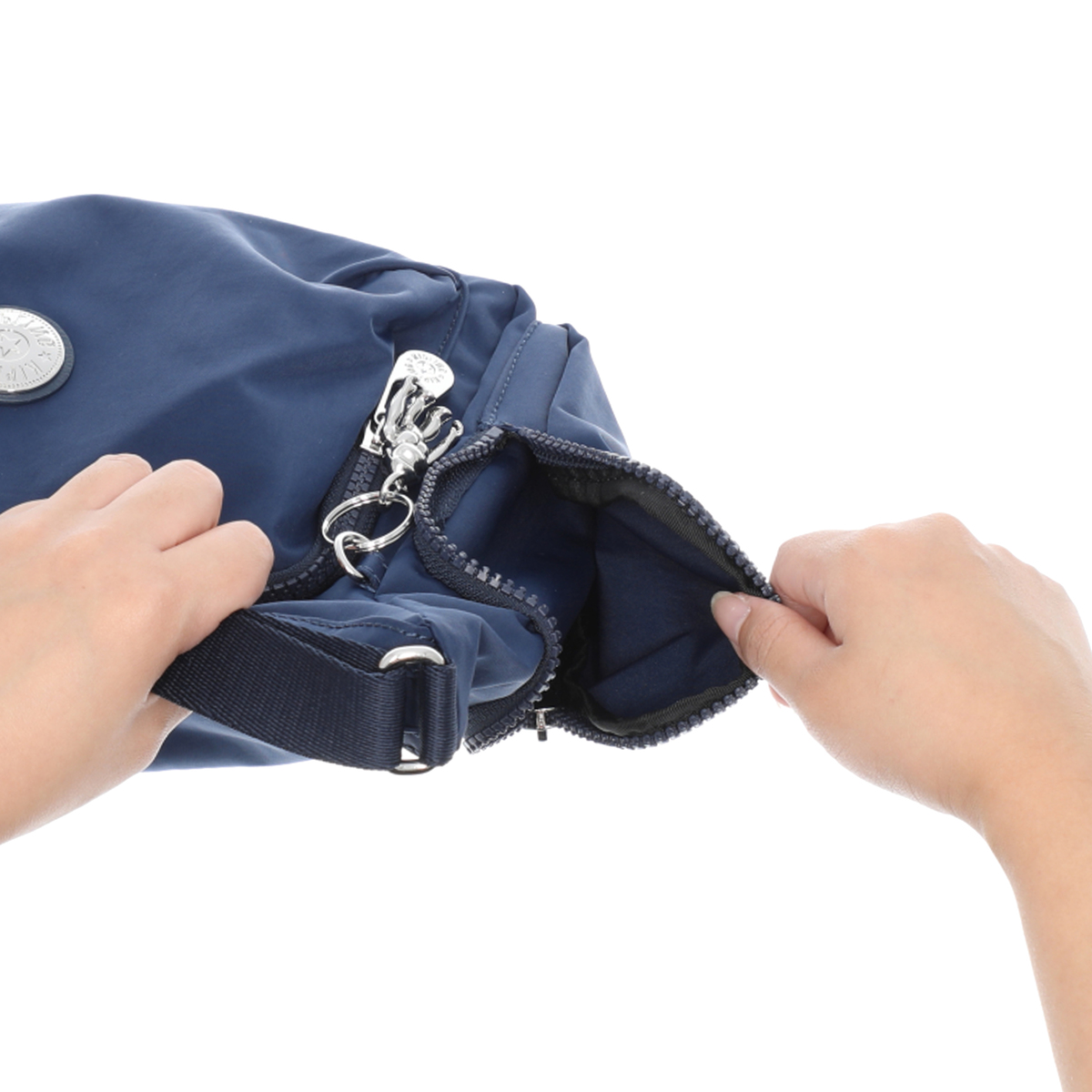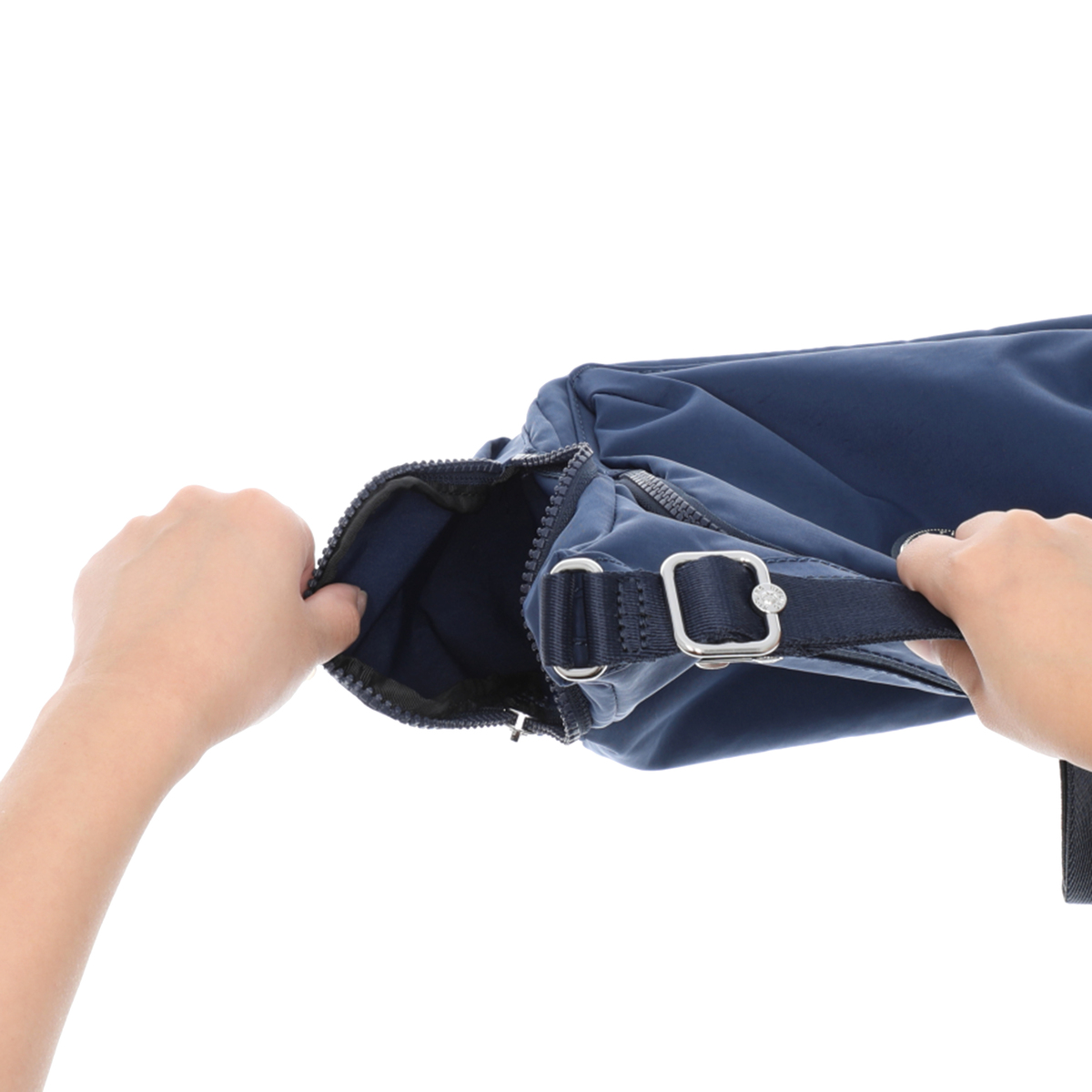 メイン収納部にはB5サイズ相当を収納可能。ファスナー開口部は曲線で仕上げ、肩にかけたときに収まりがよい形状になっています。また、ショルダーベルトは無段階で長さ調整が可能。ワンショルダーでも斜め掛けでもバランスの良い長さを採用しています