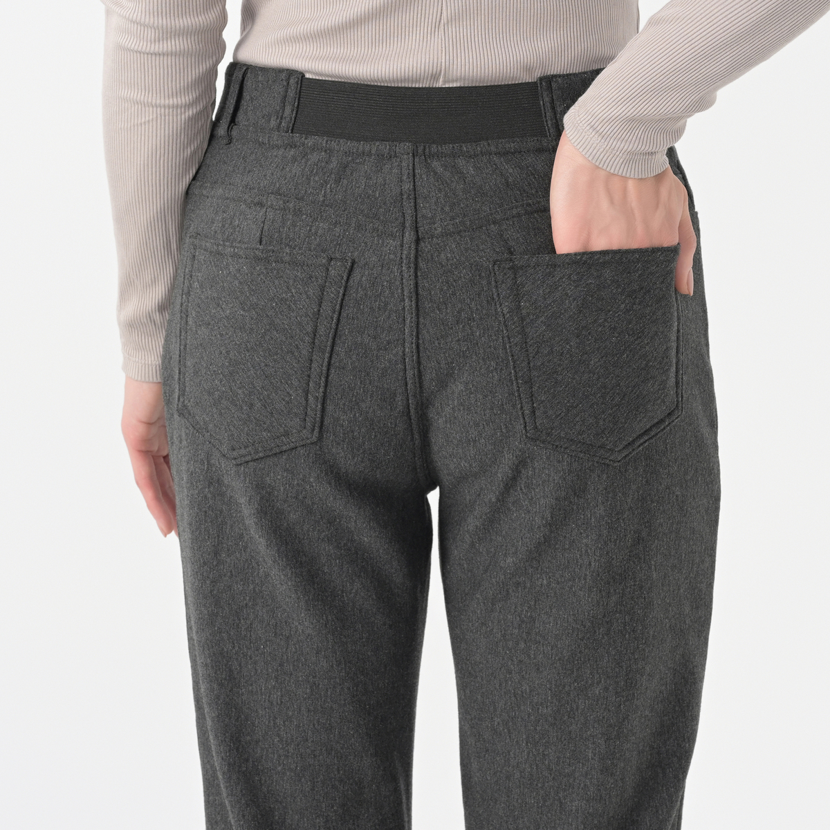 ストレッチ性の良い綿混の素材で肌触りも良く、適度なしっかり感も。ウエスト全体にゴムを入れた伸び伸びパンツで、バックセンター部分は窮屈に感じにくいよう平ゴムを出して、楽伸びウエスト仕立てにしています