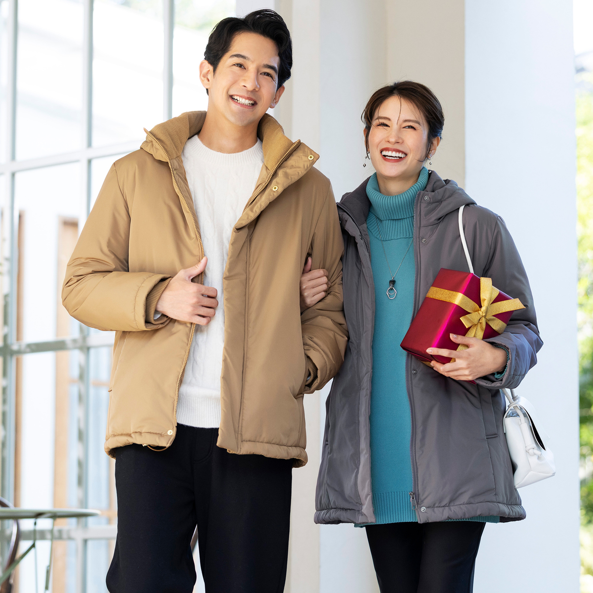 微光沢の薄手タフタ生地で上品な表情。身頃裏はフリースでぬくもりをプラスし、袖裏はタフタで重ね着もスムーズ。袖口内側はリブ仕様で風や冷気を防ぎます。内衿裏にもフリースをあしらい、首まわりはやさしく暖か。顔周りを包むようなフード付きで、マフラーのように首元まで暖かです