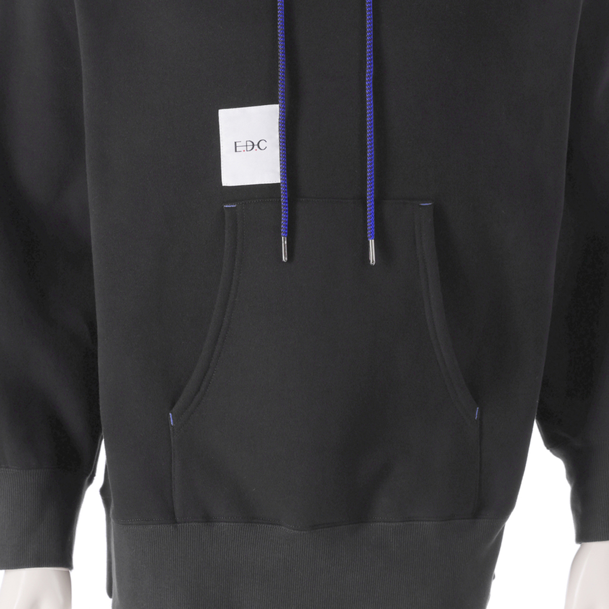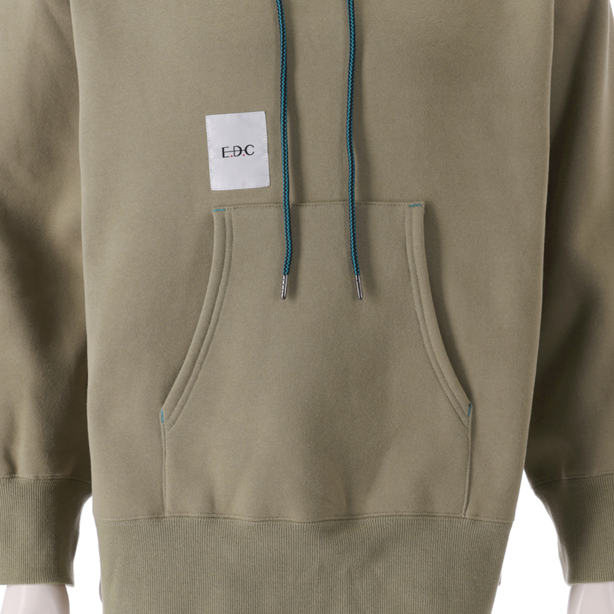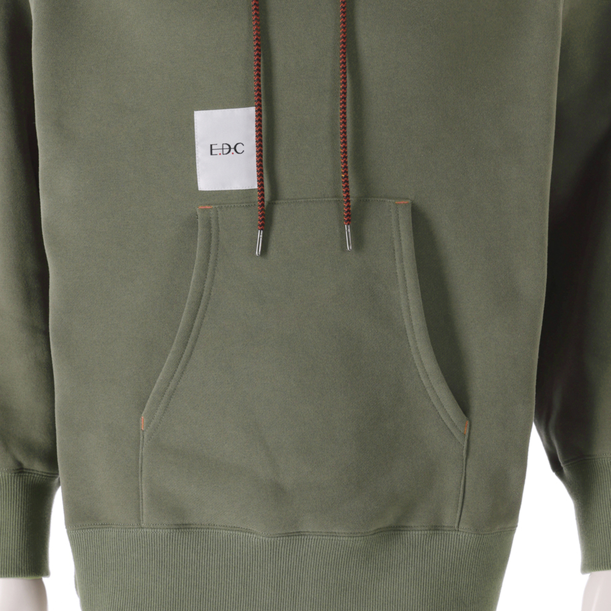 ブランドロゴEDCをモチーフにしたジャガードタグを前身頃に縫い付けてデザイン。2枚仕立てのフードは立ち上がりが綺麗で、顔まわりにボリュームが出るので、小顔効果にも期待。スピンドルは2色ミックスのカラーアクセントが特徴の丸紐コードで、先端には弾丸チップをデザインしました